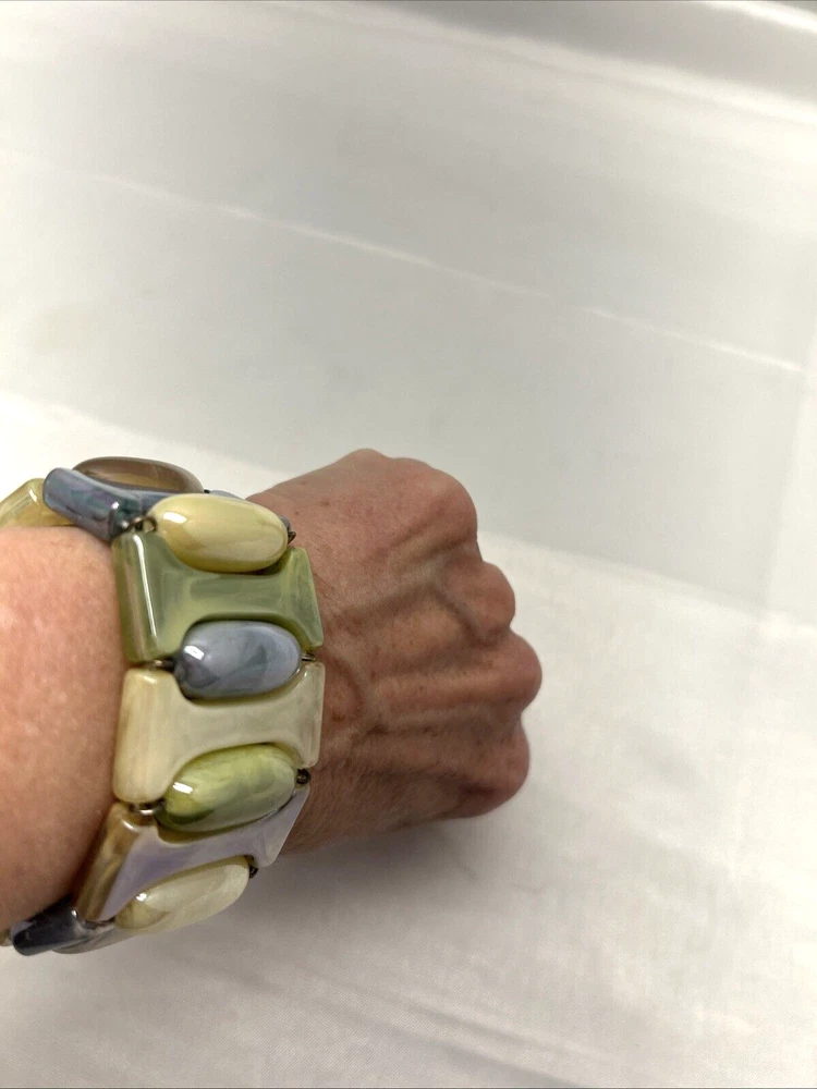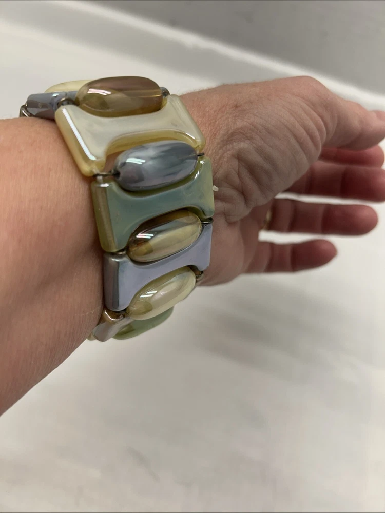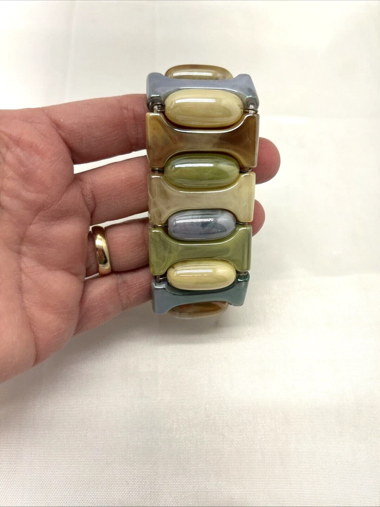 This multicolor Lucite stretch bracelet features a retro 80's design with a mix of browns, beige, and gray hues. The bracelet is unbranded and exudes a unique and vibrant aesthetic perfect for adding a pop of color to any outfit. Its stretch design ensures a comfortable and easy fit on the wrist, making it a versatile accessory for various occasions. Each piece of Bracelet is appx 2"