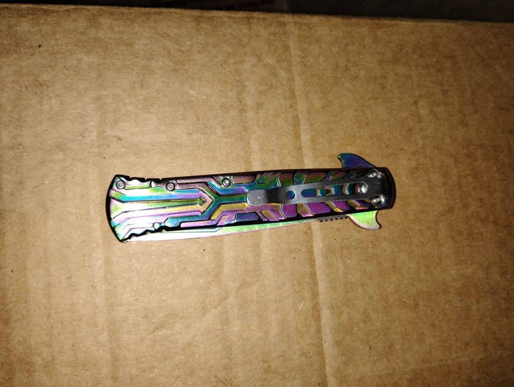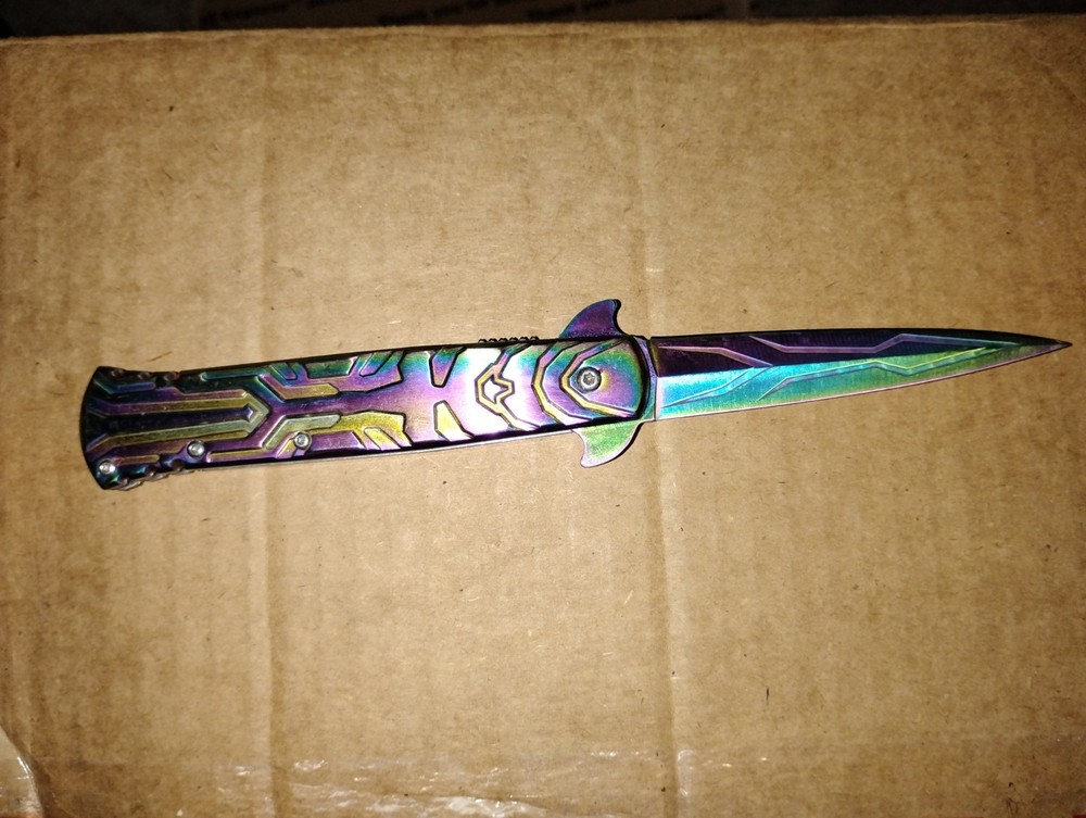 The "CRUSADER BLOOD OATH RAINBOW TITANIUM STILETTO POCKET KNIFE" is a modern folding knife with a sleek design and a 4-inch stainless steel spear-point blade. The handle is made of titanium coating, making it lightweight and durable for everyday carry. This collectible pocketknife features a liner lock for secure use and an assisted opening mechanism for quick deployment. The multi-color design adds a unique touch to this stylish and functional knife, perfect for various knives and swords enthusiasts.