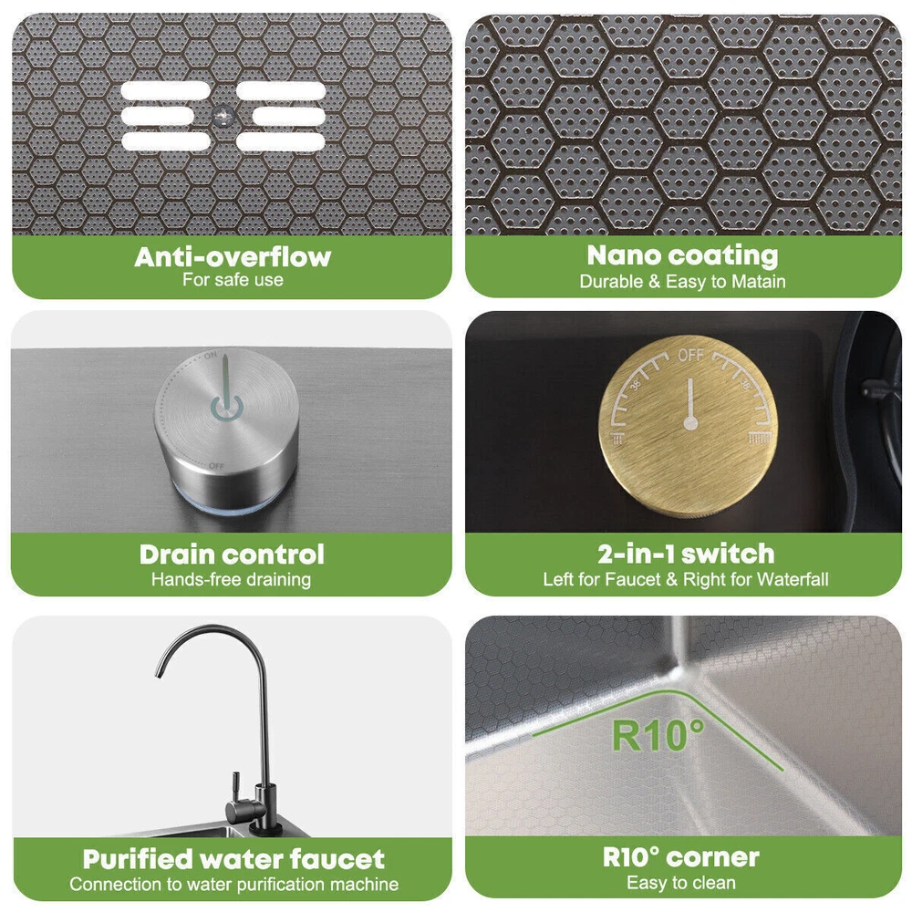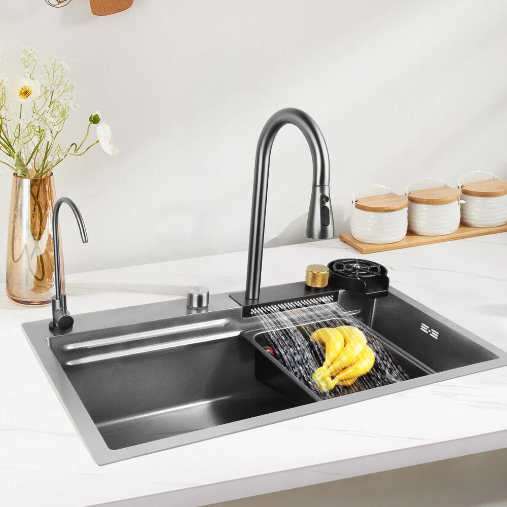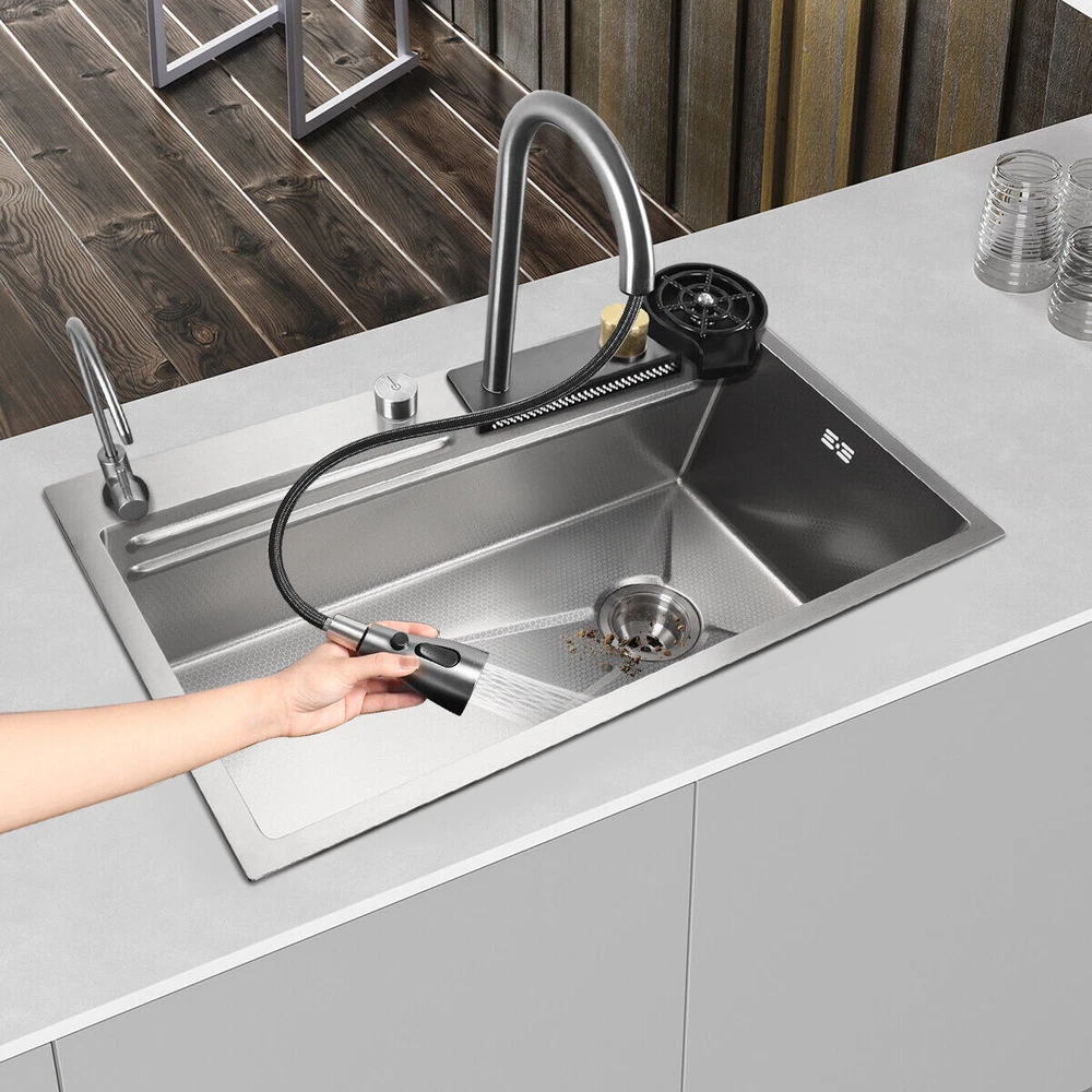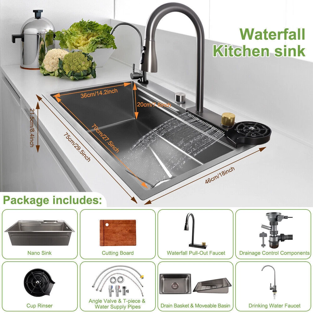 Our multifunctional cascade kitchen sinks come with a dual spout and a full range of accessories, perfect for homes, kitchens, and bars. The package includes: 1 × Nano Sink 1 × Extractable Waterfall Faucet 1 × Cup Rinser 1 × Flow Control Components 1 × Drinking Water Faucet 1 × Basin 1 × Triangular Drain Basket 1 × Cutting Board 2 × Square Faucet 3 × Water Supply Hoses Size of the kitchen sink: External: 75 x 46 x 21.5 cm / 29.5 x 18 x 8.4 inches Internal: 70 x 36 x 20 cm / 27.5 x 14.2 x 7.8 inches Diameter of the cup spout for cup rinsing: 11 cm / 4.3" max. Thickness of the sink plate: 3mm / 0.12" / 11 Gauge √ Advanced nanometric coating - easy to clean nettoyer √ Premium stainless steel - Durable √ Multiple accessories - Wide application √ Double rail - Suitable & convenient Cascade Outlet The cascade design makes it easy to clean fruits and vegetables. The uniform water flow prevents splashing and is perfect for rinsing large surfaces. Cup Rinser Practical cup rinser for quick cleaning of glasses and effective time savings, for cups up to 11 cm/4.3" in diameter. Extractable Faucet The extractable faucet allows for flexible extension of the faucet and convenient use. Drinking Water Faucet The waterfall sink is equipped with a drinking water faucet that can be connected to your home's potable water pipeline for convenient use. Embossed Nano Honeycomb Coating Easy to clean and maintain, resistant to wear and scratches. Flow Control Drain control button for easy draining without getting your hands wet. The flow control button cannot be used with the kitchen sink plug. About this item 【Nano Interior Coating & Noiseless Anti-Condensation Exterior Coating】---The kitchen sink comes with a nano interior coating that ensures rust resistance, durability, and long-term performance. It is easy to clean and maintain. The exterior soundproof coating prevents condensation and ice formation on the bottom of the cascade sink in winter. 【Glass Rinser & Drain Control】---Our single-bowl cascade kitchen sink comes with a glass rinser that can rinse cups with openings up to 11 cm/4.3 inches in diameter. Simply invert the cup and press to spray high-pressure water directly at the bottom, ensuring a thorough cleaning. The drain regulator allows for hands-free draining and reduces mess. Avoid contact with wet surfaces for greater cleanliness and safety. 【High-Quality Stainless Steel & Cascade Flow】---Made of premium stainless steel, our Waterfall kitchen sink offers exceptional durability and hardness. The cascade design is convenient for washing vegetables and fruits. The smooth flow of water cascading from multiple points ensures that every part of your food is thoroughly cleaned, removing any dirt or debris present. 【High-Quality Stainless Steel & Cascade Flow】---Crafted from premium stainless steel material, our kitchen sink offers exceptional durability and hardness. The cascade design makes it convenient for washing vegetables and fruits. The smooth cascade flow of water from multiple points ensures thorough cleaning of every part of the product, eliminating any dirt or residue present. 【3-in-1 Pressure Pull-Out Faucet & Friendly Reminders】---Our pull-out faucet provides 3 water flow modes: stream mode, spray mode, and dual-blade mode. Please note that our sink faucet only has 2 input hoses to connect to cold and hot water, suitable for most households. It is not compatible with special under-counter water heaters, which require a low-pressure or pressureless faucet with 2 input hoses and 1 output hose. Satisfied Customer Service: 1 year warranty! 30days return and refund! Message seller for whatever you encountered we will reply in 12 hours! Shipping Policy: 1. Sent by UPS or other standard courier service, depending on its size and weight. 2. Arrive around 2-8 working days after dispatched. 3. Some remote area cannot accept PO box address for such oversized products. Provide a correct physical address if possible. 4. Can send to all areas in US, but for some remote area, may need to pay extra postage fee. 5. Contact seller if you failed to order. About Us: Join our global team dedicated to sourcing top-quality products directly from factories, ensuring the best prices for our customers on a wide range of home and lifestyle products, outdoor essentials, and more. By eliminating middlemen, we maintain a direct factory-to-customer approach, allowing us to offer unbeatable prices in the market without compromising on quality. Your satisfaction is our priority! Experience the convenience of fast shipping throughout Australia, and rest assured that we are committed to delivering a 100% satisfying online shopping experience. Place your order with confidence and discover the savings and quality we bring to your doorstep!