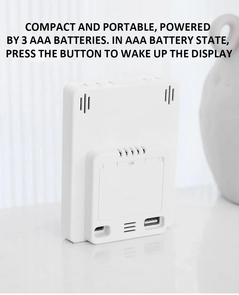 Multifunctional Large Screen Digital Alarm Clock Humidity Display Brightness Adjustment Charging Desktop Clock Home Office Decor Features: Dual Alarm Clocks: You can set two alarm clocks in different time periods (such as weekdays and weekends), which can help you plan your time reasonably. 3 Levels of Brightness Adjustment: This alarm clock has 3 levels of brightness adjustment, and also adopts a high sensitivity photosensitive sensor, which can automatically sense the ambient light and adjust the brightness of the display. The stronger the ambient light, the brighter the backlight, and the weaker the ambient light, the dimmer the backlight. Perfect Gift: It is not only a clock, but also a good decoration for your bedroom. The stylish appearance and multiple functions make it perfect as a gift. Dual Power Mode and USB Ports: This product can be powered via the supplied USB cable or by installing AAA batteries (not included). When powered by the USB cable, there are two USB ports on the back, one for put and one for output. Note: AAA battery mode can not output charging. Specifications: Item Name: Digital Alarm Clock Material: Plastic Output: 5V 1A Color: as the picture Display Screen: LED Applicable Places: Home, Room, Outdoor, Office, Meeting Room, Bedroom, Places Where an Alarm Clock is Needed Size: 9cm x 2.5cm x 12cm(Approx.) Package Includes: 1 x Digital Alarm Clock 1 x USB Cable (Battery not included in package) Note: Due to different lighting and screen settings, the item color may be slightly different from the picture. Due to different manual measurements, please allow a 1-2cm difference in size. 1. Use carbon batteries; can not use alkaline batteries, overcharge is too strong to burn off the power supply (broken words, display incomplete) will shorten the life of the electronic clock 2. Adapter (plug) with 5V 1A, can not use fast charging, can not use the charging treasure, can not be used in the computer host, can not use the bull socket, will cause voltage instability, resulting in time is not allowed, the current is too strong will burn off the power supply (broken words, display incomplete) will shorten the life of the electronic clock!