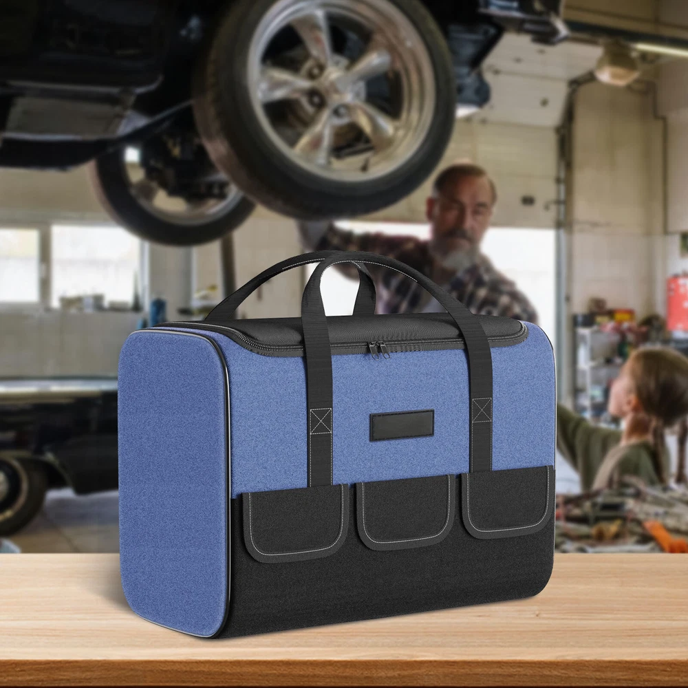 Product Description Bout this item: 👷♂️ Keep Your Tools Organised: with our tool bag designed for DIY enthusiasts and craftsmen. This tool bag is perfect for storing and organising your tools and materials. 👷♂️ High-quality Materials And Structure: Our tool bag is made of 5 layers of 1680D Oxford fabric, providing excellent durability and stability. Waterproof, finely stitched, and able to withstand heavy use. 👷♂️ Large Space and Multiple Pockets: Our tool bag features 1 strong inner pocket and 5 outer pockets, providing ample space to store various tools and materials. It is robust and versatile. 👷♂️ Multifunctiona Tool Bag : Ideal for DIY enthusiasts and craftsmen, but also for electricians or plumbers. It offers a practical solution for storing and organizing tools effectively. Specification: Material:Polyester Color :Blue Size: 16.93x9.25x11.8 inch Water Resistance Level:Water Resistant Number of Compartments:5 Included Components: 1 Tool Bag powered by