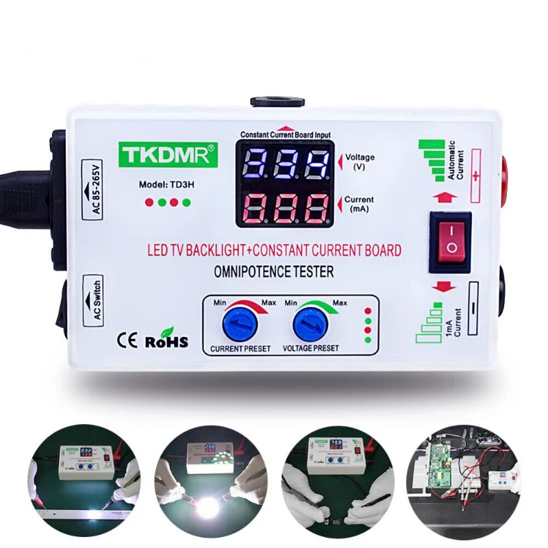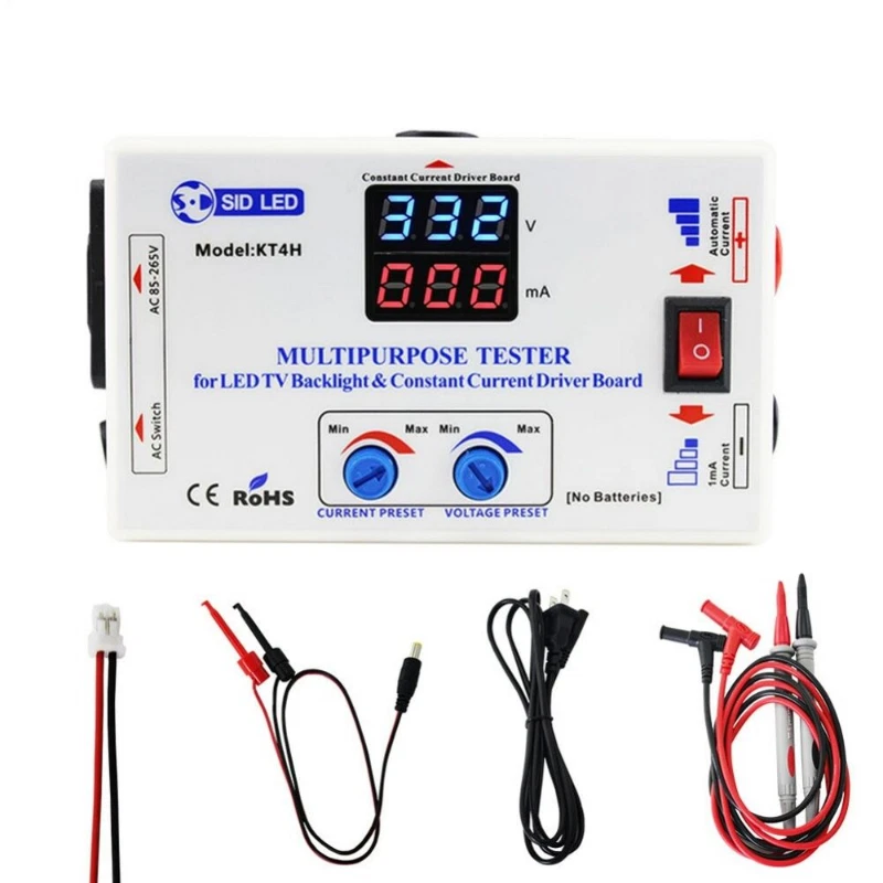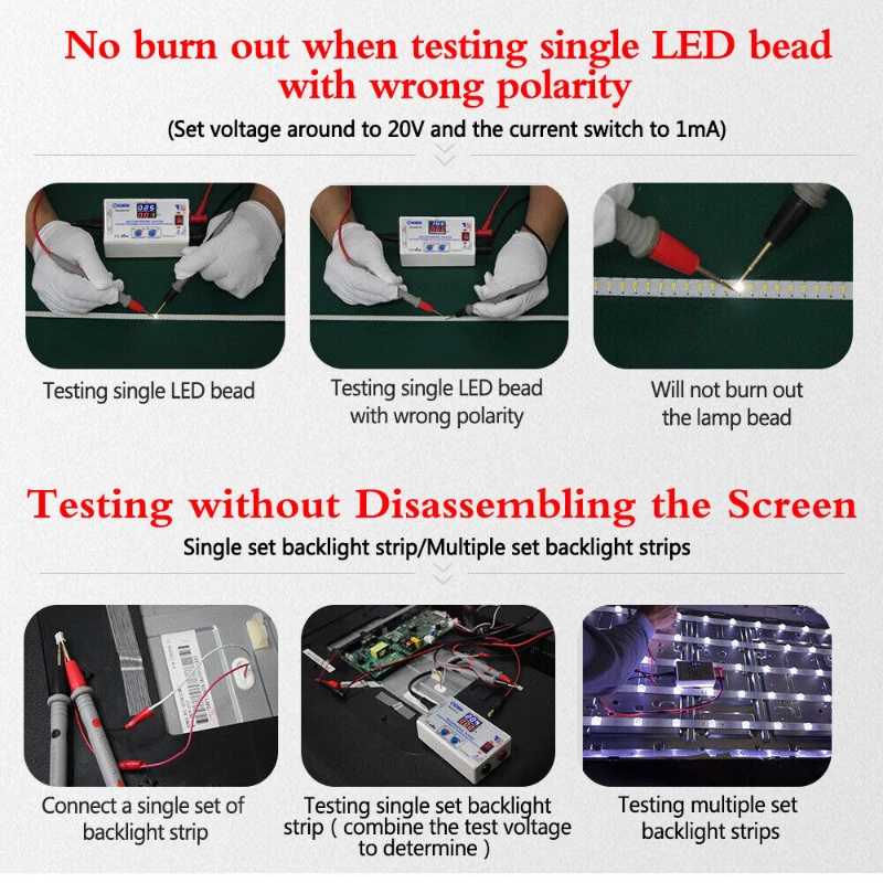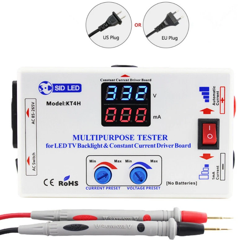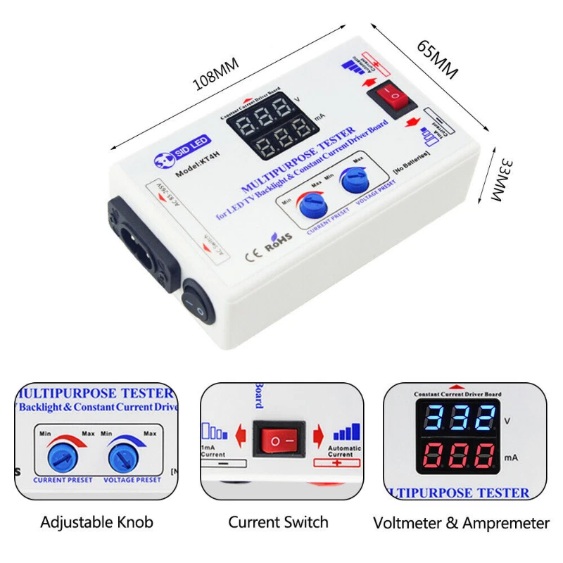 Multipurpose Tester for LED TV Backlight Constant Current Driver Board KT4H NEW Description Product Parameters: • Product model: KT4H • Vin: AC 85-265V • Vout: DC 0-330V (Automatic + Adjustable) • Voltmeter Accuracy: < (± 0.5 ± 1%Vout) V • Iout: 0-150mA (Automatic + Adjustable) • Constant Current Board Testing Current: 0-999mA • Ammeter Accuracy: <(±2 ±1%Iout) mA • Pinput: 50VA (MAX) • Temperature: -20℃~+40℃ Product Introduction: Real-time testing voltage and current of constant current drive board. 1. Testing LED strips, LED panels, single LED bead, COB lighting sources and so on. 2. Testing backlight of LED TV, displays, computers and so on. 3. Compatible with all the LED strips (high voltage or low voltage). 4. Manual adjusting the range of testing voltage (20-330V/DC) and current (20-150mA). Adjusting voltage at open circuit (without loads) and adjusting current with loads or contact probes together. 5. No burn out when testing single LED bead with wrong polarity. (Set voltage around to 20V and the current switch to 1mA) 6. Testing voltage parameter of various of electronic components. 7. Testing LED light on vehicle. Testing Methods: Default factory setting: Output Voltage 330V, Output Current 30mA. You can testing the backlight of TV with any size at this default settings. 1. Self-testing: Plug in, turn the power switch on. The voltage is around 330V, current is 0; Contact the probes together, voltage changes to 0 and current changes to around 50mA, then testing can be started. 2. In testing: Voltage = ‘0’, SHORT CIRCUIT. Voltage = ‘330V’, OPEN CIRCUIT. 3. Testing single LED bead (Set voltage around to 20V and the current switch to 1mA): A. With right polarity: the voltage shows on the tester of a normal LED bead is about 80% of the rated voltage, for example, the operating voltage of the LED bead is 2.4V if its rated voltage is 3V; B. With wrong polarity: Voltage display the open circuit voltage. 4. Testing LED strips: Set the voltage to around 200V, change the current if need adjust brightness. Test Method without Disassembling the Screen Cut off the power of TV, Unplug the interface sockets of the constant current plate and light bar, Insert the Red and Black pens of the tester into the anode and cathode of the interface of the LED light bar. 1. Multiple LED strips Testing the voltage of each strips and record them. Compare the voltage of each strips, it is normal if the differences <2V or <3%. 2. Single LED strip A. The LED strip is not on (need remove the screen to repair): voltage = 0, SHORT CIRCUIT. Voltage ≥ 300V, OPEN CIRCUIT. B. The LED strip is on (need the testing references of constant current driver board to determine the backlight is normal or not). Test Method of Constant Current Driver Board Testing situation: the LED strip of backlight is on with the tester, but it does not work with the constant current board; A. Cut off the power of TV, unplug the interface sockets of the constant current plate and light bar; B. Connect the constant current board with the tester using the cables in the kits on right polarity. C. Insert the Red and Black pens of the tester into the anode and cathode of the interface of the LED light bar D. Turn the power of TV on. E. Testing voltage >30V, Current >30mA and keep stable, and the LED strip working normal, then the Constant current board is normal Feature: Universal tester Stepless regulation of voltage and current Led dual meter digital display Package Content: 1*LED tester 1* P ower plug 1*Cloth bag 1*I nstructions 1*Test Probe Note: Please allow a slight size difference due to manual measurement. Due to the different display and different light, the picture may not show the actual color of the item. Payment We only accept PayPal and Credit Cards . PayPal is the only online payment method we accept. Please make sure you have a valid/confirmed PayPal account prior bidding. And please make sure that your PayPal registered address is the same with your eBay registered address. Shipping Your parcel will be sent within 5 working days. If you do not receive your item within 30 working days since payment finished, please contact us immediately for further assistance. Note: It may takes more than 30 working days to other countries such as Mexico, Brazil, Chile, Peru, because they are far away from China. PS: We also offer faster shipping service (3-5 days to deliver), such as DHL, EMS, but buyers need to pay for the extra shipping cost. Please contact us if you need it. Customs Declaration: Import duties, taxes and charges are not included in the item price or shipping charges. These charges are the buyer's responsibility. Please check with your country's customs office to determine what these additional costs will be prior to bidding. Return Policy If you are dissatisfied with our item or service, then please contact us via eBay message before leaving any feedback. We are committed to resolve all issues in a friendly and satisfactory manner. We always reply to eBay messages within 1-2 business days. If you do not get a response from us, then please check your eBay message. Only unused, un damaged and original condition item can be qualified for a return. Returned products that are not in original packaging or with something missing are subject to minimum 30% to 50% of the total price. The seller is not responsible for returned parcels due to incomplete address or address impossible to deliver to . Feedback: We strive for 100% customer satisfaction! If you have any questions, please feel free to contact us instead of leaving negative feedback. We will reply your e-mail within 24 working hours.