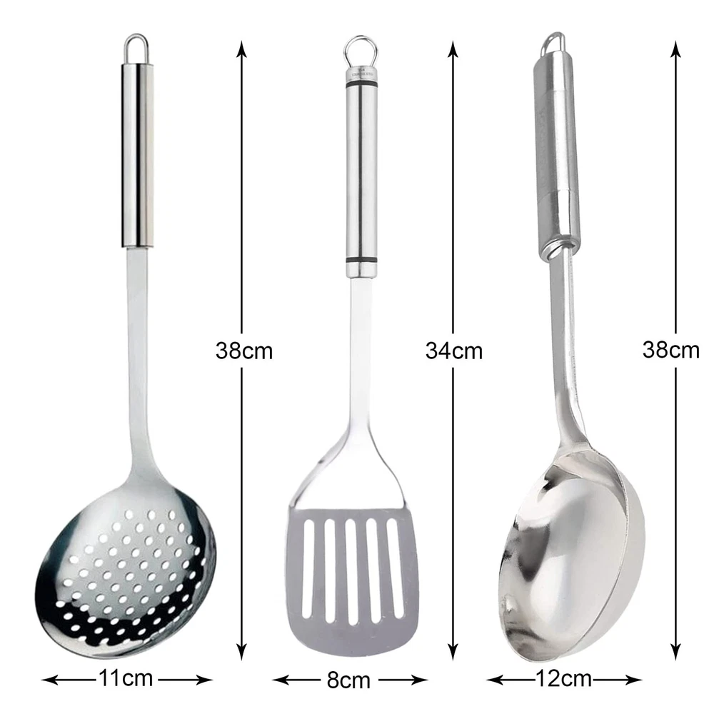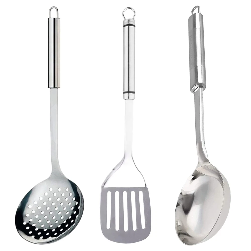 Material: Stainless Steel Theme: Tools Number of Items in Set: 3 Color: Silver Type: Cooking Spoon Brand: Kuber industries Set Includes: Cooking Spoon, Ladle, Spatula Handle Material: Stainless Steel