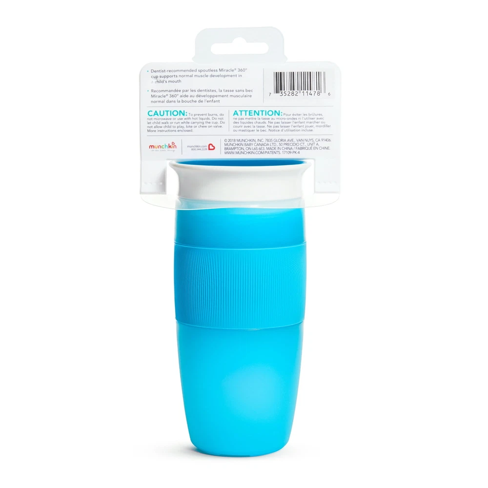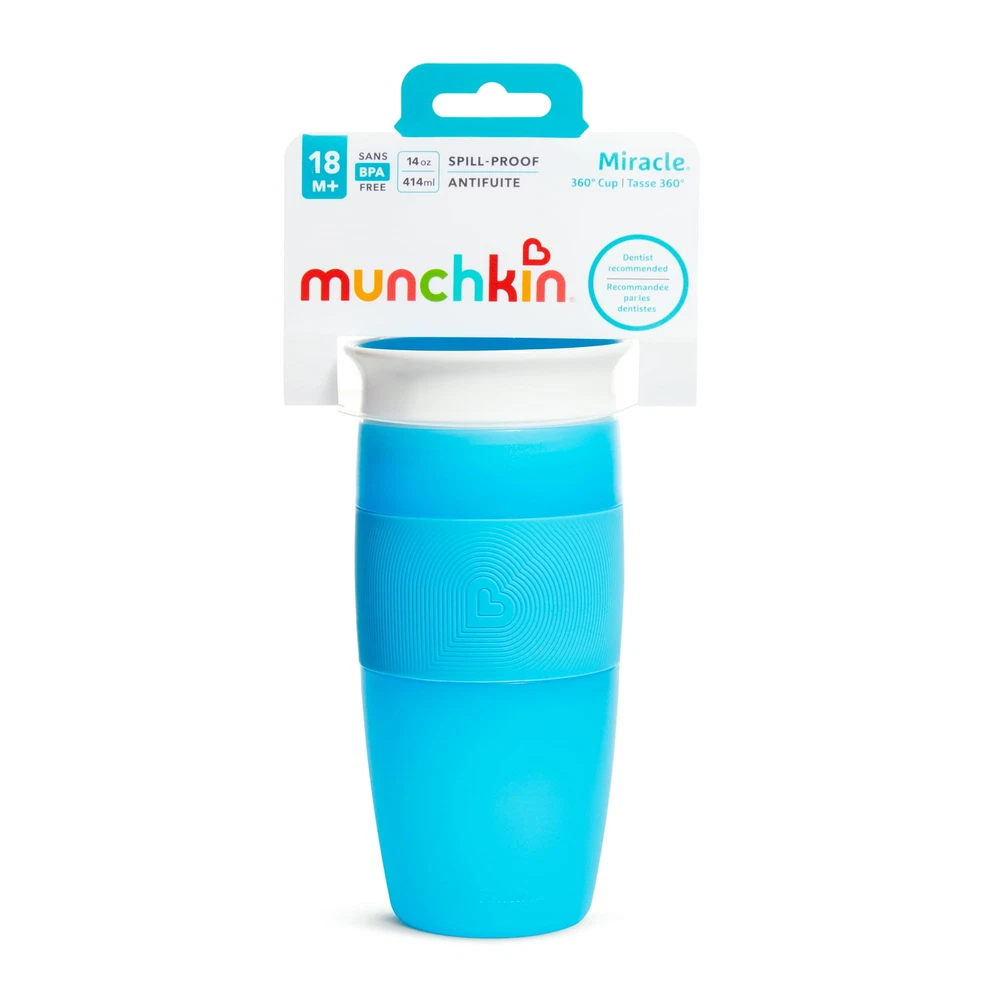 Munchkin® Miracle® 360° Toddler Sippy Cup, 14 oz, Blue, Unisex About this item Toddler cup with dentist recommended spoutless design 360˚ edge allows drinking from any side of the cup- simply tilt the cup and suck on the valve's edge Cup automatically seals when child stops drinking Silicone grip with heart design makes it easy for little hands to hold Easy to clean with no extra valves or parts 14oz capacity for juice, milk and water BPA-free, top rack dishwasher safe, 18+ months Unisex Blue About this item Product details Let’s face it: toddlers are a messy bunch, even once they’ve learned how to drink and hold a cup. Now imagine a world in which drinks didn’t spill at all — not in your diaper bag, not on your nightstand, and not on your growing toddler. No, it’s not a miracle, exactly — it’s Munchkin’s Miracle® 360˚ Cup in a larger 14oz size. The first sippy cup invented with both parents and kids in mind, the Miracle® 360˚ Cup eliminates messes and supports kids’ dental health all at once. Drinking from anywhere around the rim, like a regular cup, helps support normal muscle development in a child’s mouth. And with no extra spouts, straws or pieces, the Miracle® 360˚ Cup is easy to use and even easier to clean. This new 14oz Miracle® 360˚ Cup even has a built-in silicone grip, so it’s easy for little hands to hold! We’ll say cheers to that!