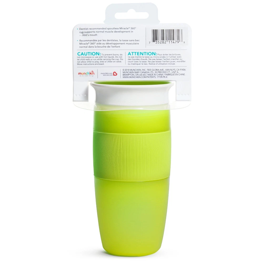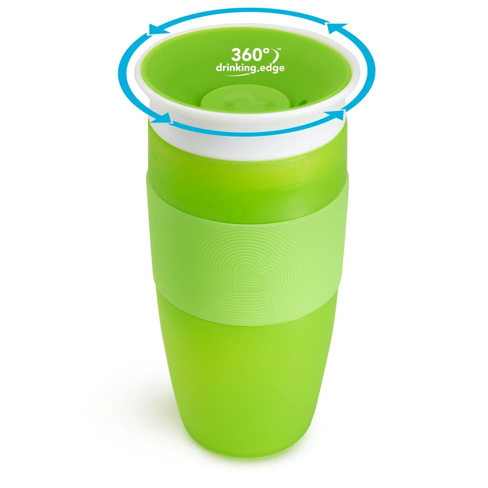 Munchkin® Miracle® 360° Toddler Sippy Cup, 14 oz, Green, Unisex About this item Toddler cup with dentist recommended spoutless design 360˚ edge allows drinking from any side of the cup- simply tilt the cup and suck on the valve's edge Cup automatically seals when child stops drinking Silicone grip with heart design makes it easy for little hands to hold Easy to clean with no extra valves or parts 14oz capacity for juice, milk and water BPA-free, top rack dishwasher safe, 18+ months Unisex Green Product details Let’s face it: toddlers are a messy bunch, even once they’ve learned how to drink and hold a cup. Now imagine a world in which drinks didn’t spill at all — not in your diaper bag, not on your nightstand, and not on your growing toddler. No, it’s not a miracle, exactly — it’s Munchkin’s Miracle® 360˚ Cup in a larger 14oz size. The first sippy cup invented with both parents and kids in mind, the Miracle® 360˚ Cup eliminates messes and supports kids’ dental health all at once. Drinking from anywhere around the rim, like a regular cup, helps support normal muscle development in a child’s mouth. And with no extra spouts, straws or pieces, the Miracle® 360˚ Cup is easy to use and even easier to clean. This new 14oz Miracle® 360˚ Cup even has a built-in silicone grip, so it’s easy for little hands to hold! We’ll say cheers to that!