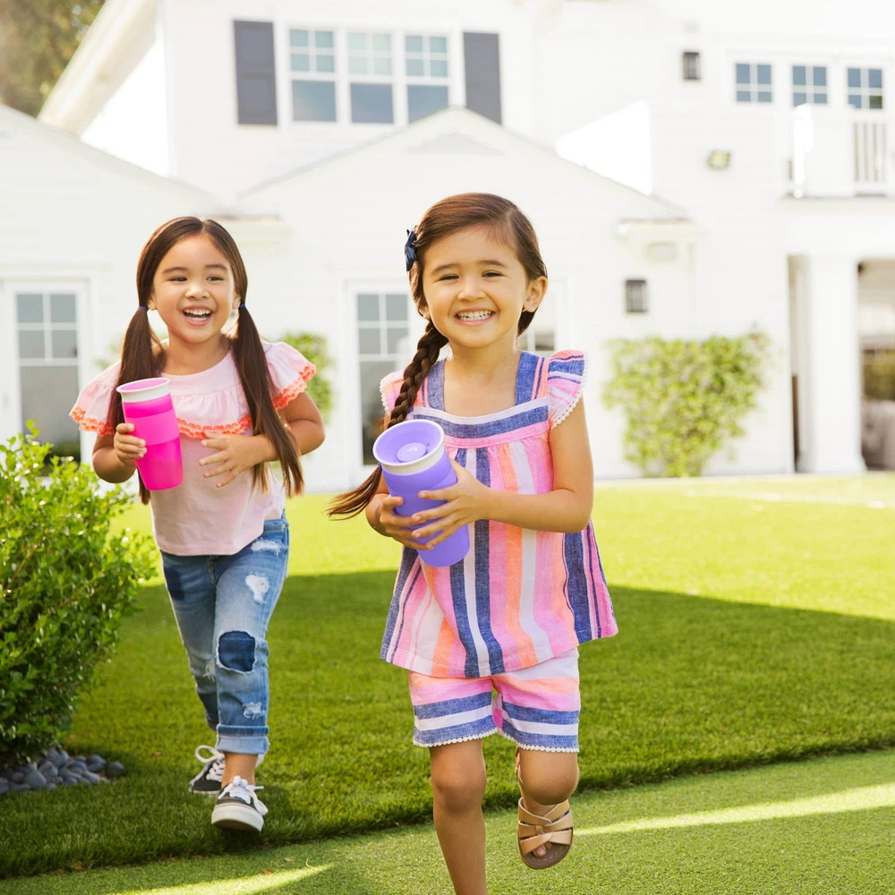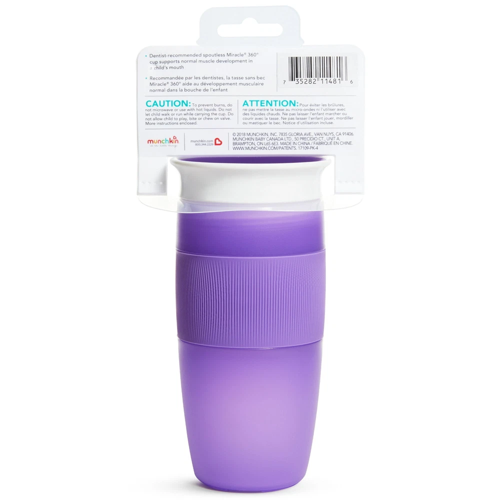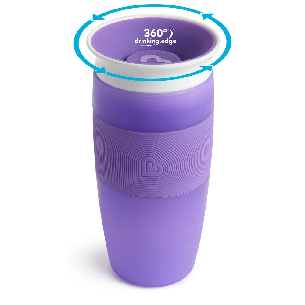 Munchkin® Miracle® 360° Toddler Sippy Cup, 14 oz, Purple, Unisex About this item Product details Let’s face it: toddlers are a messy bunch, even once they’ve learned how to drink and hold a cup. Now imagine a world in which drinks didn’t spill at all — not in your diaper bag, not on your nightstand, and not on your growing toddler. No, it’s not a miracle, exactly — it’s Munchkin’s Miracle® 360˚ Cup in a larger 14oz size. The first sippy cup invented with both parents and kids in mind, the Miracle® 360˚ Cup eliminates messes and supports kids’ dental health all at once. Drinking from anywhere around the rim, like a regular cup, helps support normal muscle development in a child’s mouth. And with no extra spouts, straws or pieces, the Miracle® 360˚ Cup is easy to use and even easier to clean. This new 14oz Miracle® 360˚ Cup even has a built-in silicone grip, so it’s easy for little hands to hold! We’ll say cheers to that! Toddler cup with dentist recommended spoutless design 360˚ edge allows drinking from any side of the cup- simply tilt the cup and suck on the valve's edge Cup automatically seals when child stops drinking Silicone grip with heart design makes it easy for little hands to hold Easy to clean with no extra valves or parts 14oz capacity for juice, milk and water BPA-free, top rack dishwasher safe, 18+ months Unisex Purple