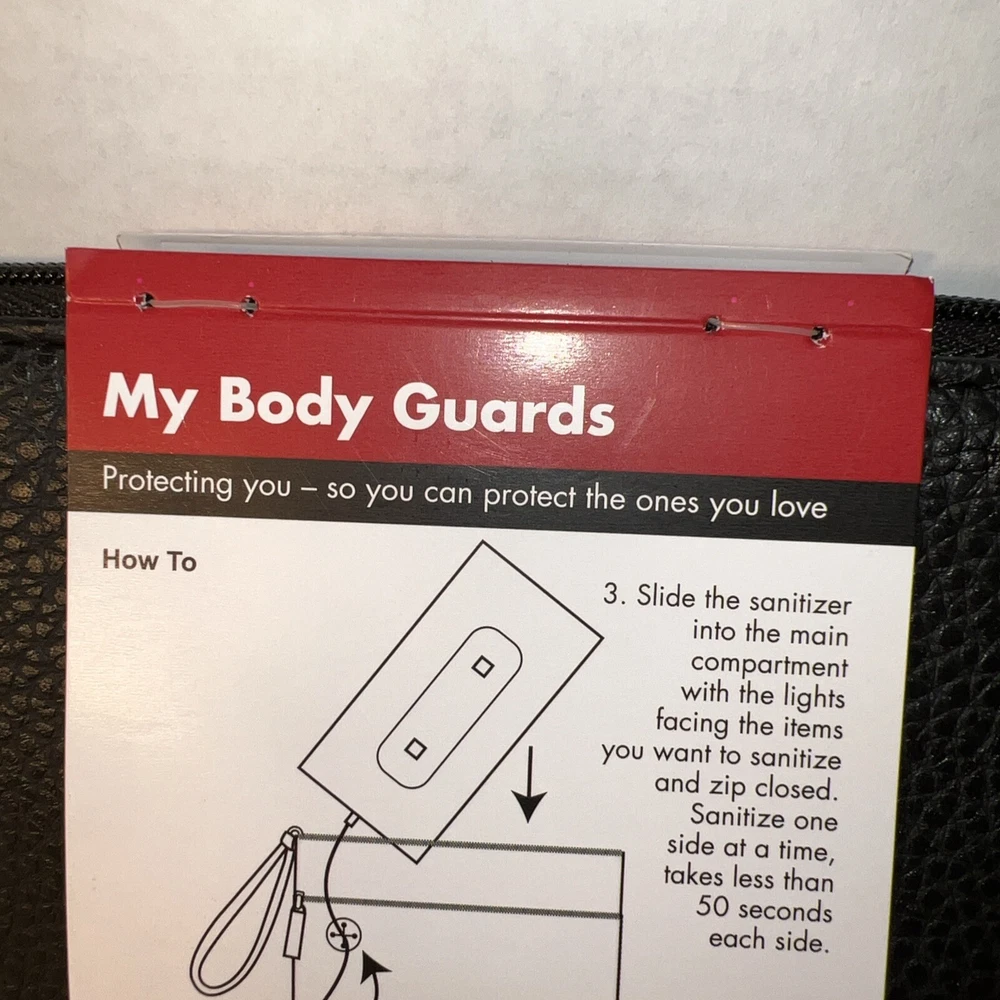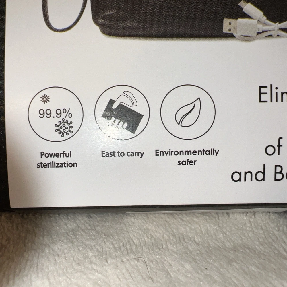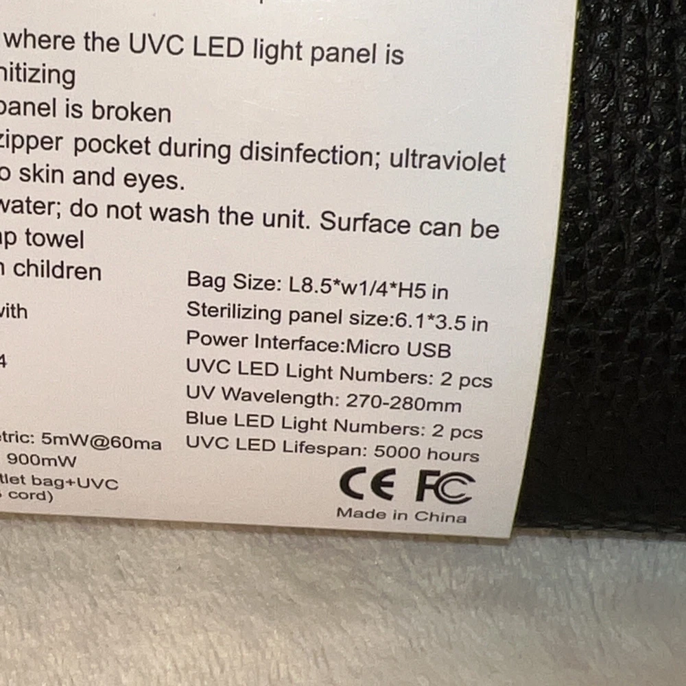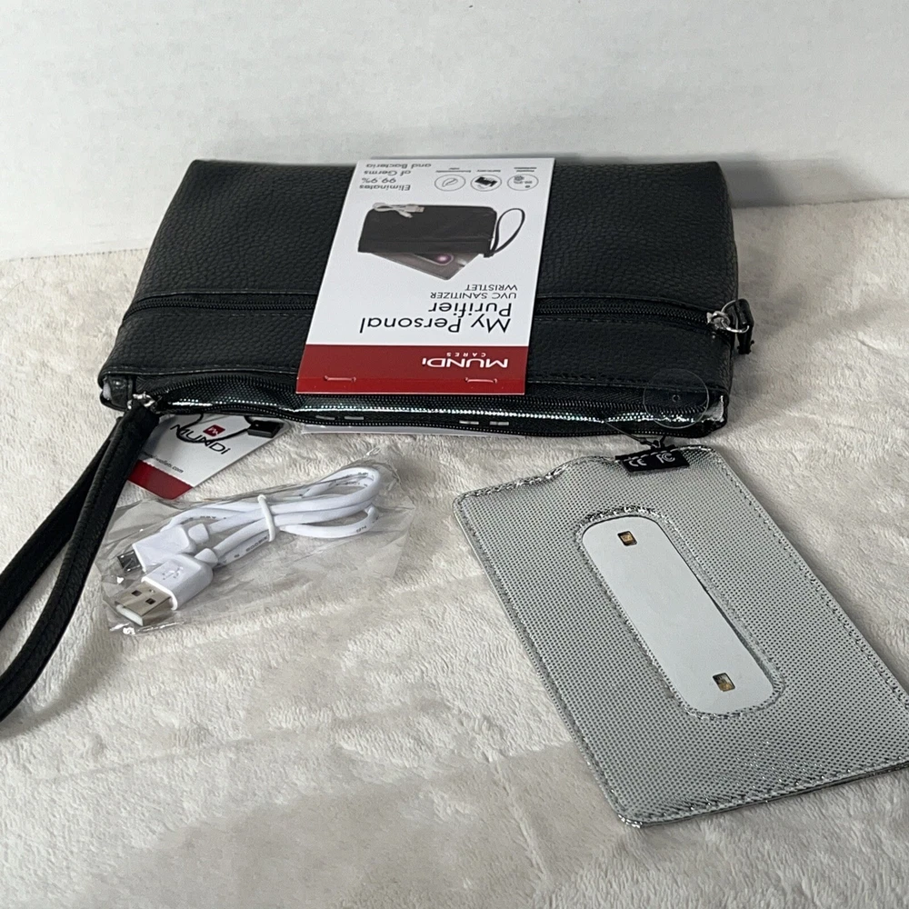This is a black, my personal purifier UVC sanitizer wristlet that comes with its own USB charging cable. The bag was bought new and it has an MSRP of $50. It says that it eliminates 99.9% of germs and bacteria. Please look at all of the photos as I have taken many pictures so you can read all the information on this bag.