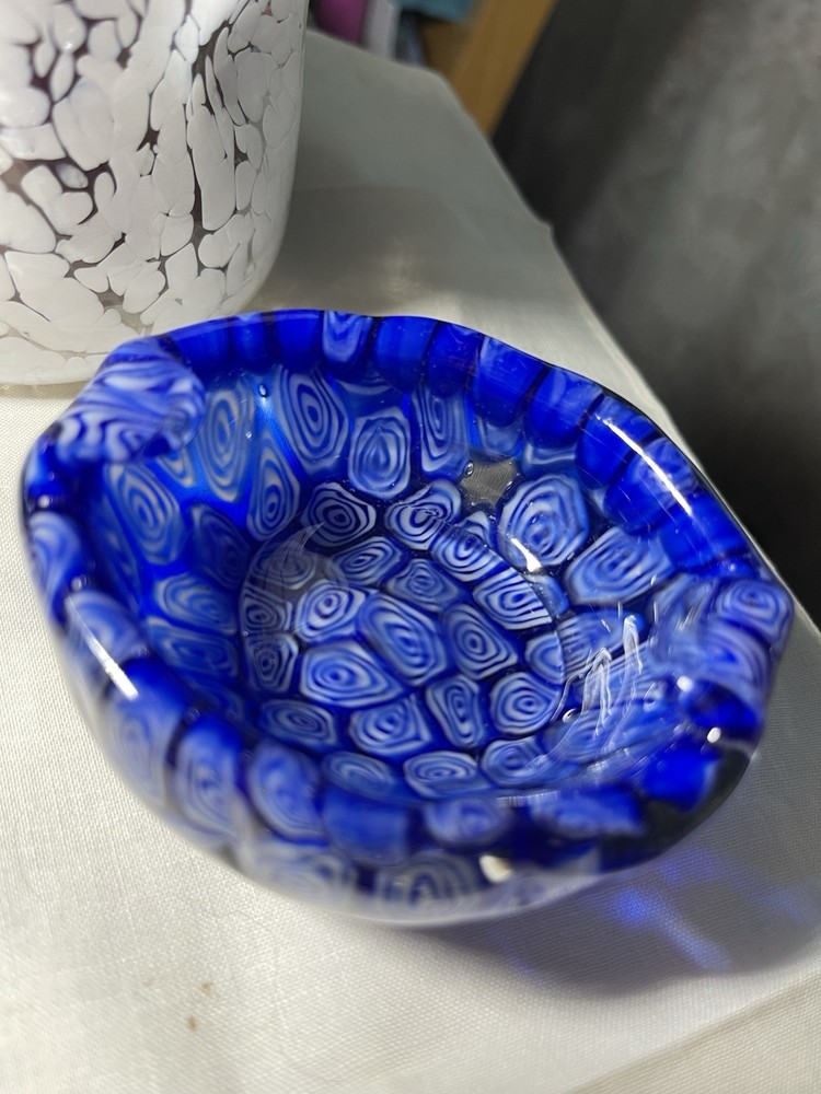 Great looking art glass pairing. There are 3 different color Millefiore glass fusings on 3 sides of the candle holder. It could be a tumbler as well. Candle holder/Tumbler is 4 inches high and 4 inches wide. A 3 by 3 in pillar candle fits in it perfectly. Weight is 7 ounces Ashtray is 3.5 inches long, 3 inches wide and 1.5 inches tall. Weight is 8 ounces