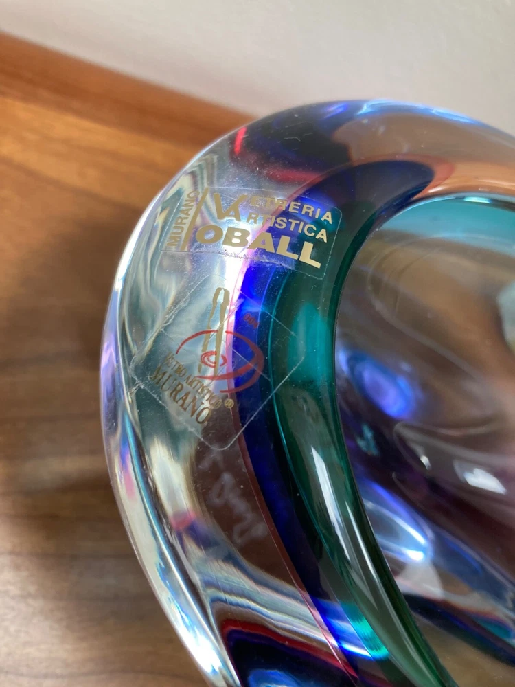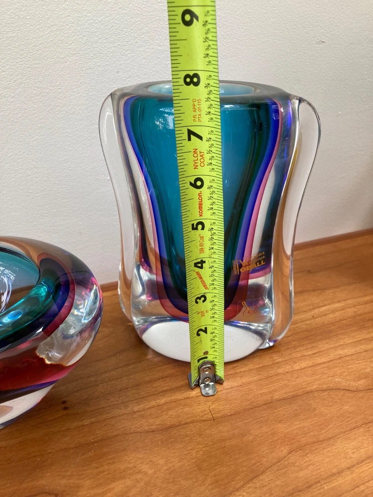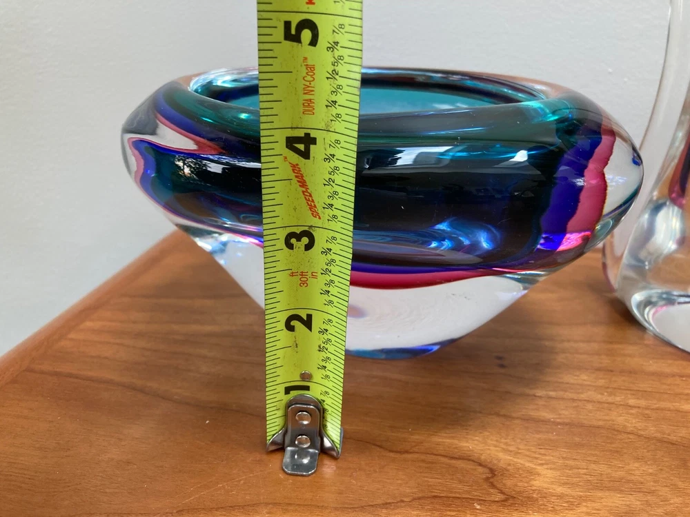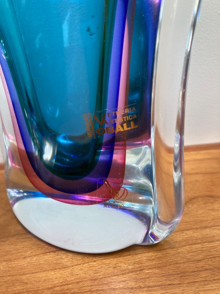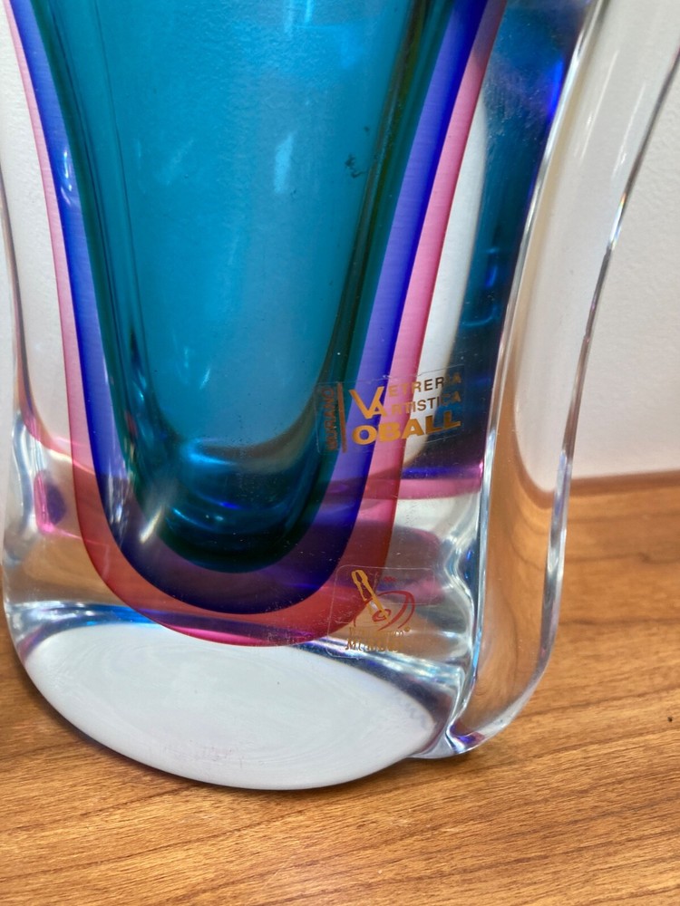 Fabulous Murano Teardrop Glass Vase and bowl "Vetreria Artistica Oball" Luigi Onesto Elevate your space with the exquisite Murano teardrop glass vase and bowl, a true masterpiece by Vetreria Artistica Oball, designed and signed by Luigi Onesto. This set embodies the pinnacle of Italian art glass, with its captivating swirl pattern and a harmonious blend of cherry and pale blue hues that reflect a sophisticated, abstract art theme. Crafted through traditional hand-blown glass techniques, this origin Italy set demonstrates the skill and artistry that has gone into creating each piece. The unique production style of Oball glass is evident in the abstract subject matter, making it not just a decorative item but a conversation piece that celebrates the beauty of Italian craftsmanship. Excellent pre owned vintage condition Fabulous signed pair Please view all the photos