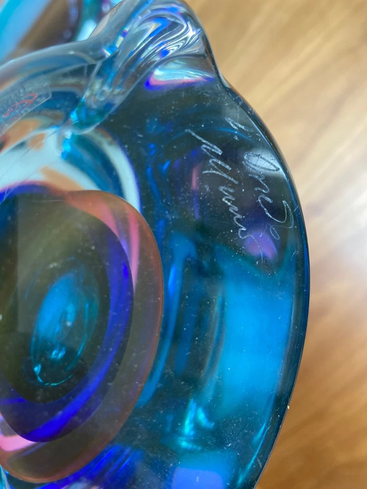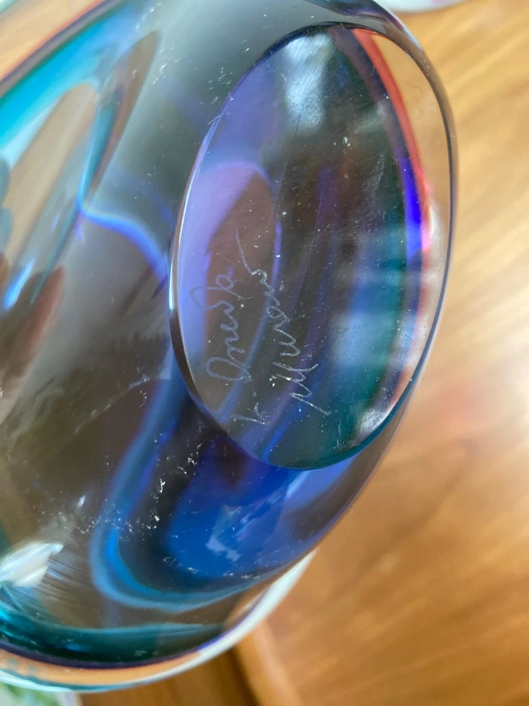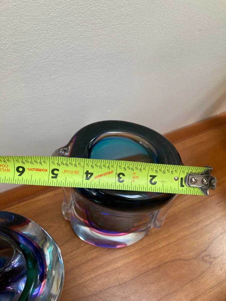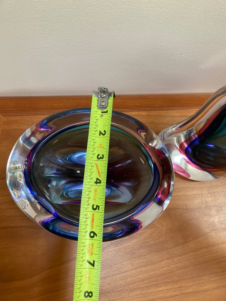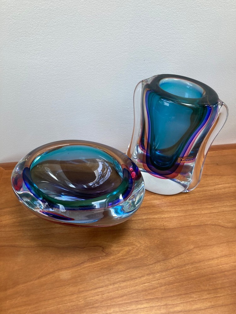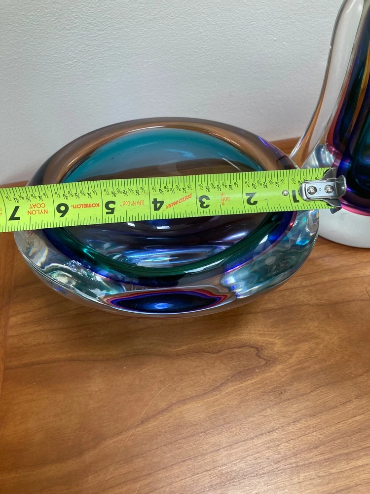 Fabulous Murano Teardrop Glass Vase and bowl "Vetreria Artistica Oball" Luigi Onesto Elevate your space with the exquisite Murano teardrop glass vase and bowl, a true masterpiece by Vetreria Artistica Oball, designed and signed by Luigi Onesto. This set embodies the pinnacle of Italian art glass, with its captivating swirl pattern and a harmonious blend of cherry and pale blue hues that reflect a sophisticated, abstract art theme. Crafted through traditional hand-blown glass techniques, this origin Italy set demonstrates the skill and artistry that has gone into creating each piece. The unique production style of Oball glass is evident in the abstract subject matter, making it not just a decorative item but a conversation piece that celebrates the beauty of Italian craftsmanship. Excellent pre owned vintage condition Fabulous signed pair Please view all the photos