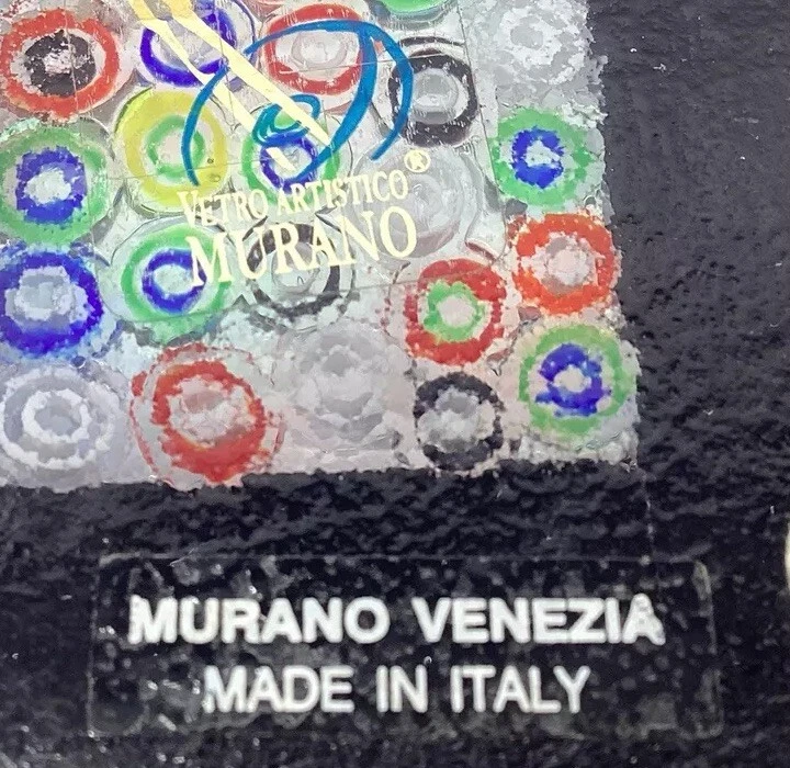 Add a touch of mid-century modern elegance to your decor with this beautiful Murano paperweight. The black square shape measures 2.5 inches and features a stunning Millefiori design of flowers in multicolored glass. Handmade in Italy, this original piece is perfect for collectors of art glass and fans of the Murano brand. The glossy finish and painted backstamp add to its decorative appeal, making it a unique addition to any collection. See photos for condition. There are no cracks and one small scratch/chip on this item. All photos are of the item listed. 2.5" x 2.5" x .75"