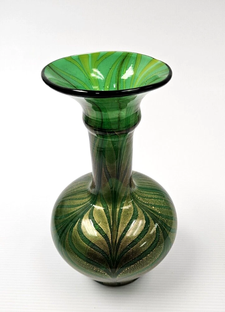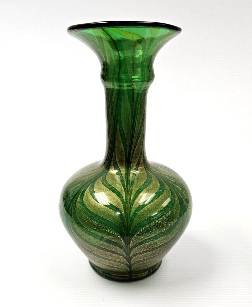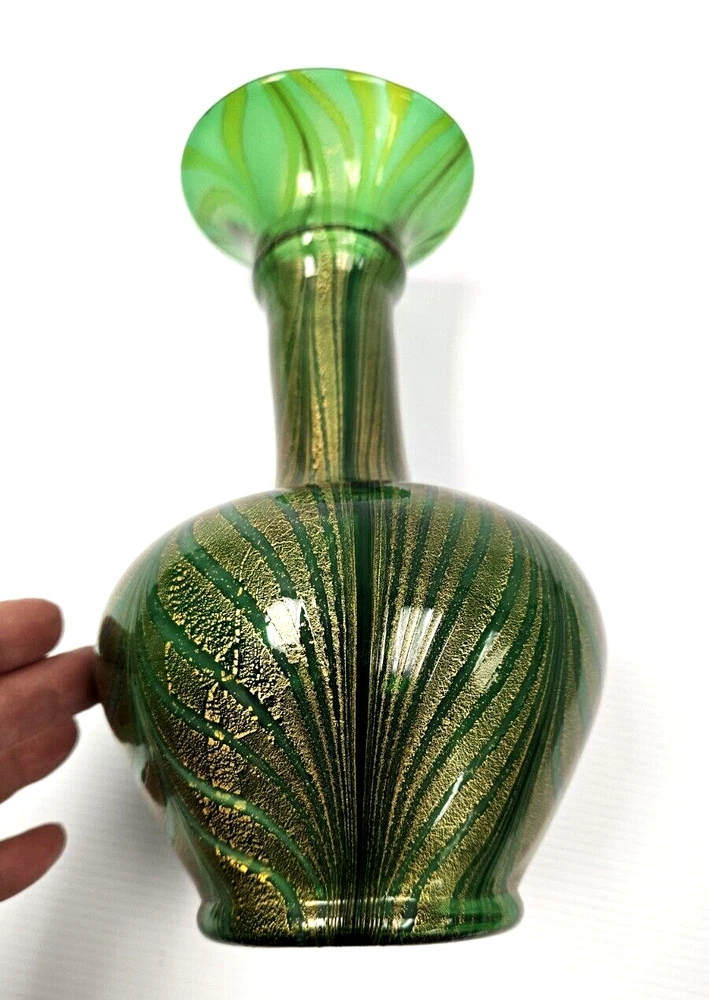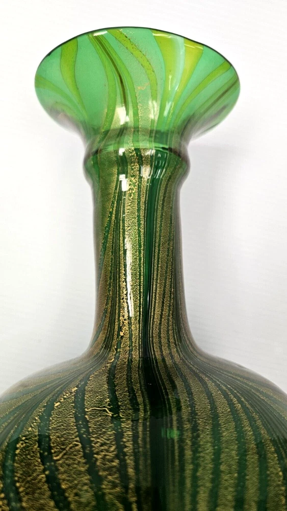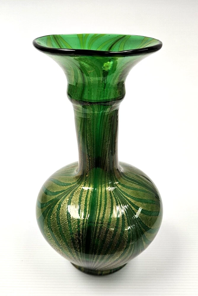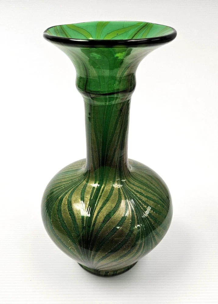 Murano Vetro Artistico Veneziano Fenicio Green and Gold Adventurine Vase We believe this is Murano Fenicio (similar to pulled feathers). In very good vintage condition. The vase has no chips, no cracks or repairs. Hardly any signs of wear. Dimension: 9" tall x 3.5" diameter (at top) x 3" diameter (at base) x 5 1/4" diameter (at widest point) Please examine the photos as they are part of the description. We offer 100% customer satisfaction, FREE returns and 5-star Ebay service! Buy with confidence! From a smoke-free, odor-free environment! Shipping insurance, delivery confirmation and packaging costs included in shipping costs. Thank you for shopping at LegendaryCyberstore! Fast Shipping We get your order shipped out within 1-business day and delivered to your doorstep as quickly as possible. Competitive Pricing With our dynamic pricing model, our prices are always competitive. Our prices are some of the lowest that you will find on the internet. Rest assured that you're getting a good deal when purchasing with us. 30-day Money Back Guarantee We are committed to making sure that you leave this transaction satisfied. If you're unhappy with the product for any reason, you may return it back for your money-back or a replacement within 30 days. No questions asked! CODE S2-2 (second shelf)