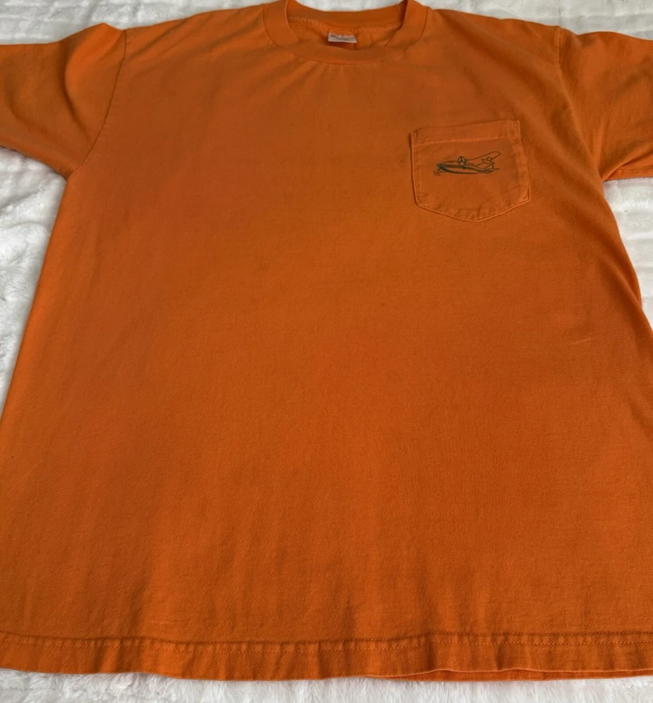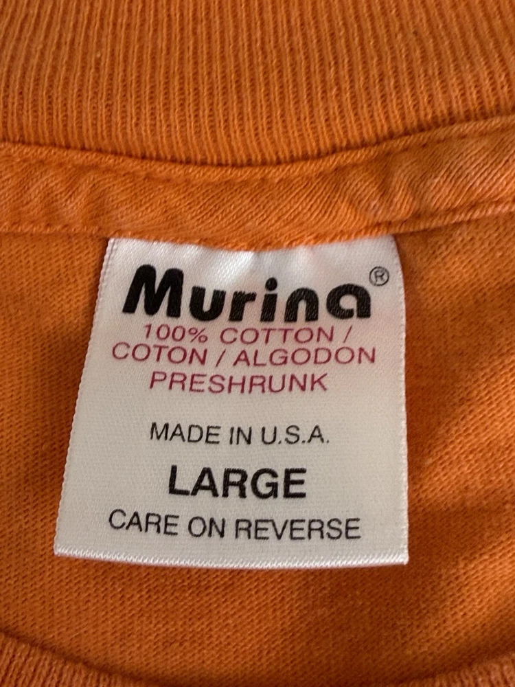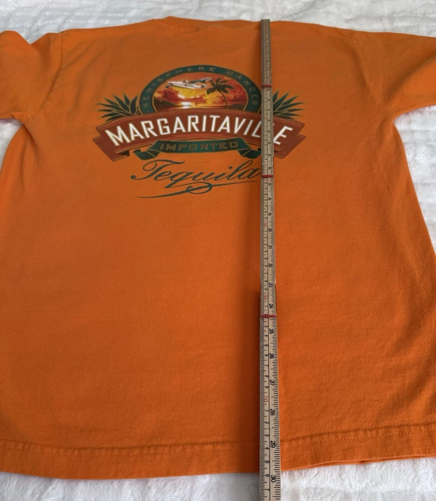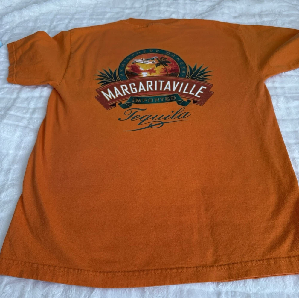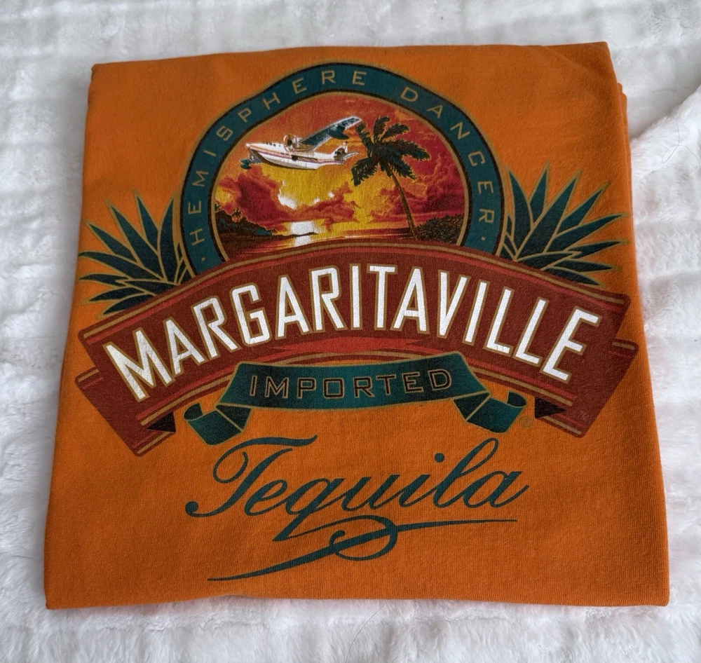 Get ready for a tropical escape with this colorful Marina-Jimmy Buffet Margaritaville T-Shirt. Made with comfortable cotton jersey fabric, this short sleeve shirt features a crew neck and a regular fit for a casual look. The orange shirt is adorned with a graphic print on the back, showcasing the iconic Margaritaville logo and the American flag. Perfect for a day at the beach or a casual outing, this T-shirt is machine washable and easy to maintain. The shirt is ideal for those who love art, music, and nautical themes, as well as those who enjoy colorful and unique clothing. With a pocket for added convenience, this T-shirt is a great addition to any wardrobe. See photos for preowned condition snd sizing.