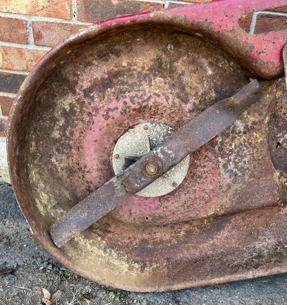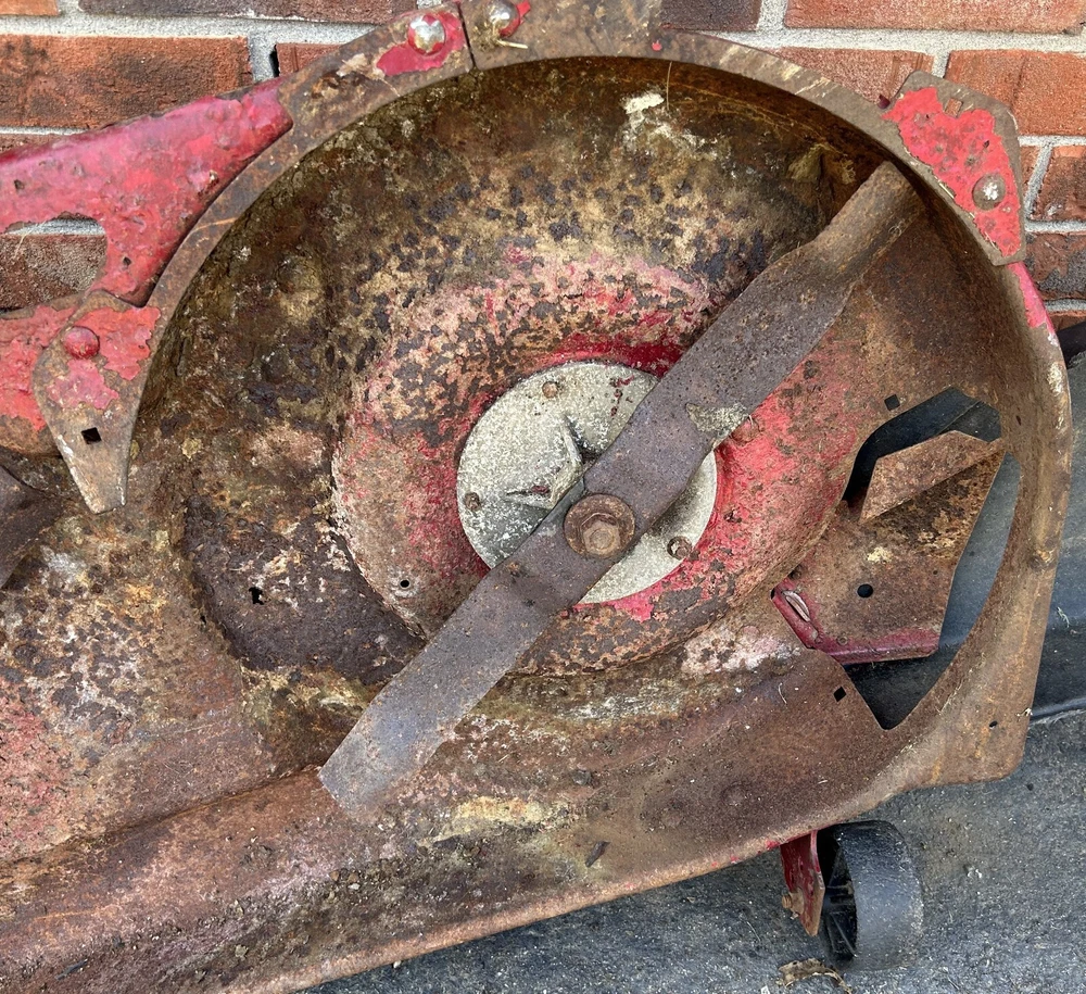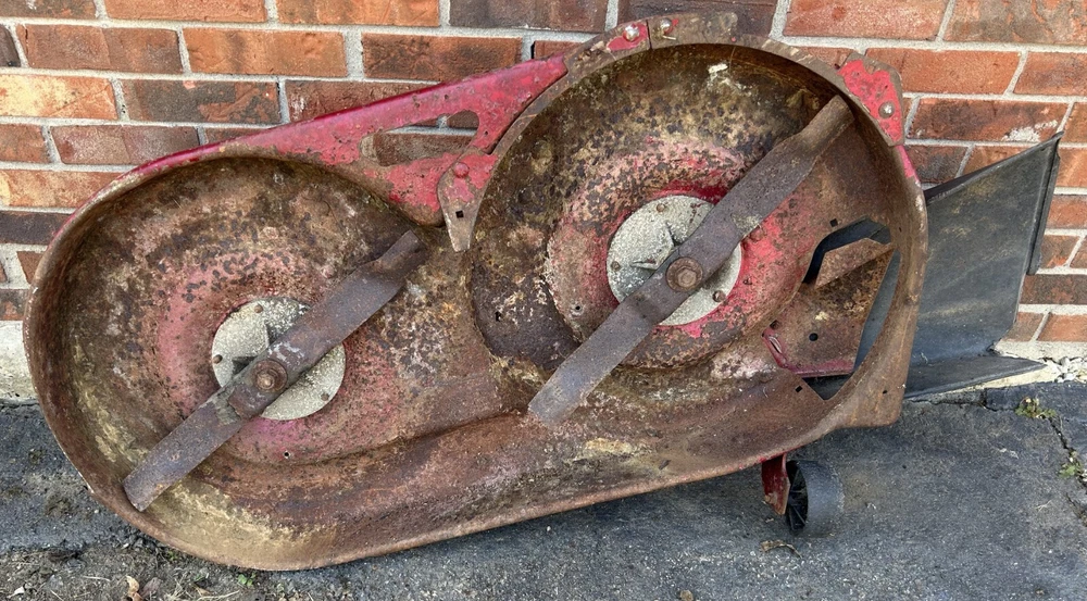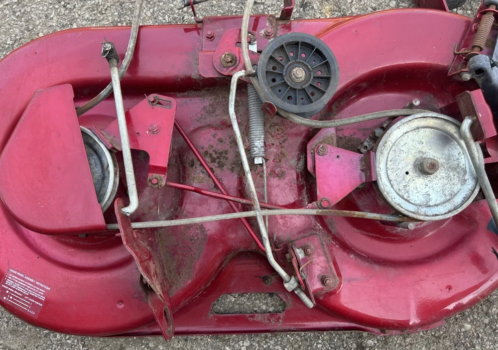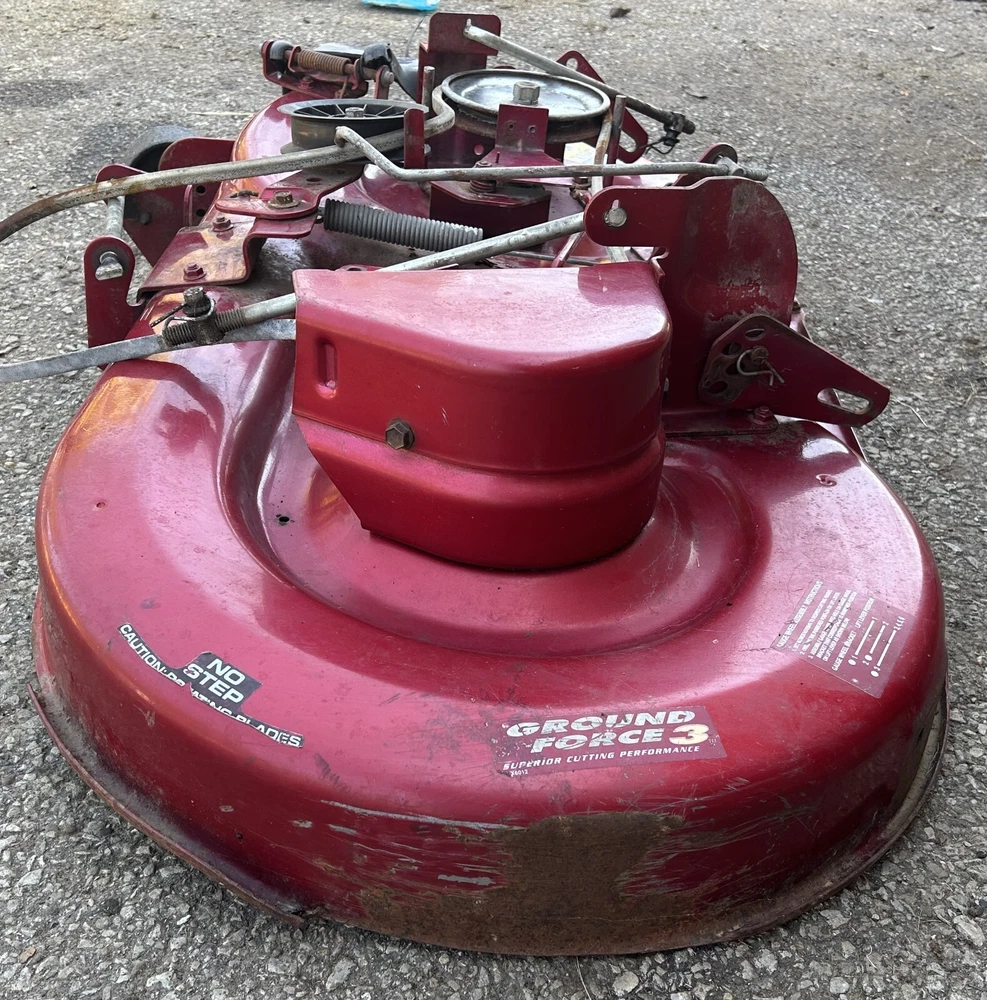This is a complete working 42" mower deck from a 1996 Murray 14.5HP, 42" model 42910X92A lawn tractor. Shell (p/n 092401E701MA) has a few holes in the center and significant rusting underneath. Needs new blades (095101E701MA) and belt (037X75A). Spindles are not seized and turn smoothly with minor resistance and may need grease. Pics are of the actual assembly for sale and show everything included. Compare deck shell part numbers to ensure fit and compatibility or inquire for fast and friendly assistance. Flat rate UPS Ground shipping of $95 is available to the lower 48 states only. Others please inquire for a shipping quote. We will try our best to get it on the UPS truck within 24 hours of purchase, but allow up to 3-day handling on mowers decks which ship wrapped in stretch wrap, bubble wrap and plastic tape. Wheels and deck chute will be removed and shipped separately or tucked in the cavity underneath. It doesn't usually take 5-days to ship depending on staffing and work flow in the garage. Message me for additional info and deals on multiple parts. I'll make sure you get everything you need. I part out complete Murray, Kubota, Cub Cadet, Craftsman, MTD and other lawn and garden tractors and mowing decks as well. If you don't see a related part you need feel free to message and I'll let you know if I still have it and at what bargain price. If you need only a specific part from any assembly for sale, message me and I'll consider pulling that part for you at a reduced price and reduced shipping cost.