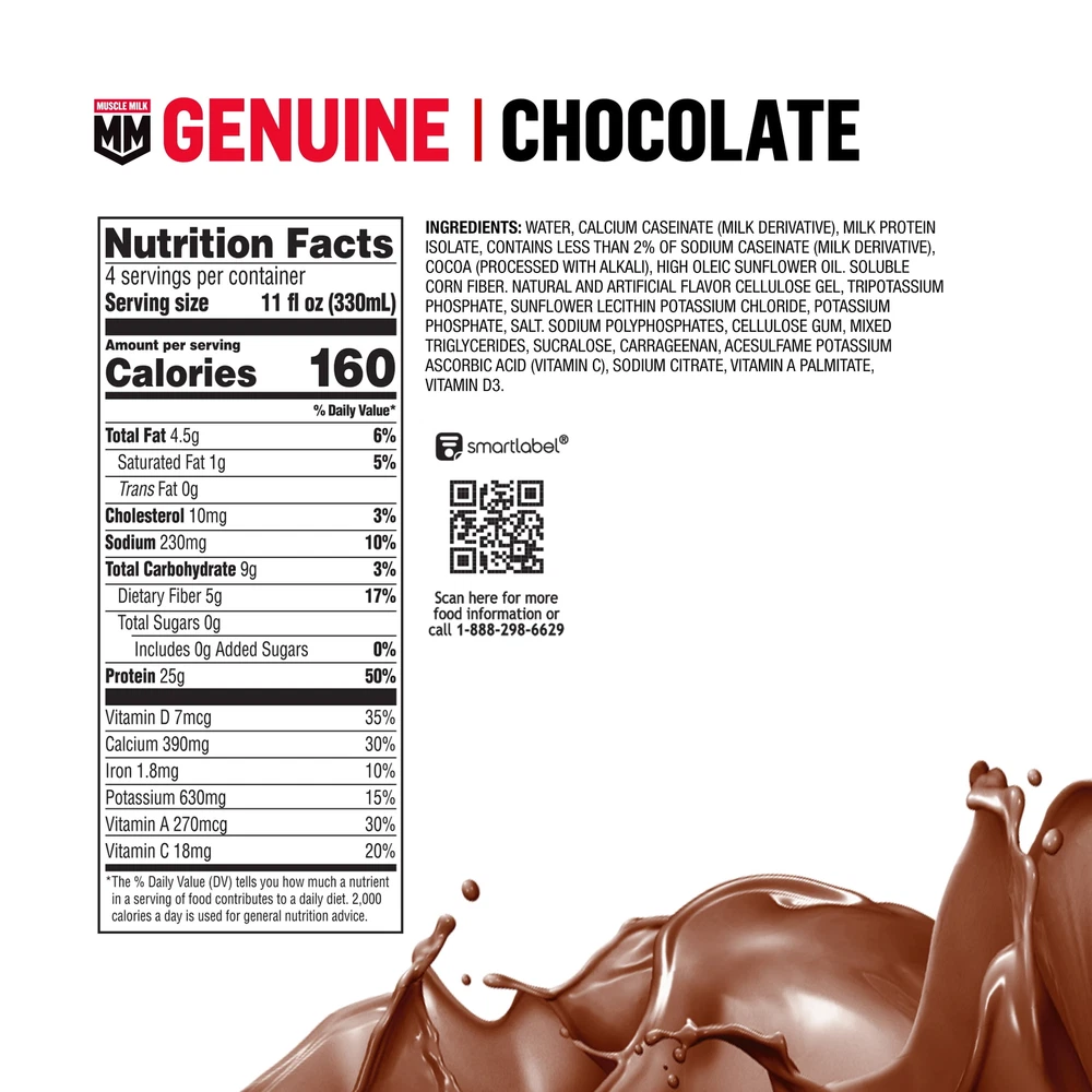 eBay Product details Muscle Milk Genuine Zero Sugar Protein Shake, Chocolate, 11 fl oz Carton, 12 Pack - Muscle Milk Genuine is an energizing protein shake that can be consumed as an on-the-go breakfast or anytime snack or to support post-workout recovery and muscle growth. It contains a combination of slow releasing and fast releasing proteins to help increase amino acid levels. These essential amino acids play a role in muscle growth. Also try adding your protein shake to coffee, smoothies or even oatmeal when you’re looking for a protein boost. Contains twelve (12) of Muscle Milk Genuine Protein Chocolate Shakes. Packaging may vary. HELPS SATISFY HUNGER AND BUILD MUSCLE - Muscle Milk Genuine is an energizing protein shake that can be consumed as an on-the-go breakfast or anytime snack or to support post-workout recovery and muscle growth. KEY FEATURES - Based on 1 shake, Muscle Milk Genuine Protein Shakes contain 25g protein, zero sugar, 5g fiber, and a good source of Calcium and Vitamins A, C & D. GREAT TASTING SHAKE - Muscle Milk Genuine Ready to Drink Protein Shakes are smooth and delicious - just read our reviews! They taste great as is or added to coffee, oatmeal, pancakes, smoothies, and other foods when you're looking for a protein boost. SCIENCE BEHIND PROTEIN - Muscle Milk Genuine provides a combination of slow releasing and fast releasing proteins to help increase amino acid levels. These essential amino acids play a role in muscle growth and maintenance of muscle mass.