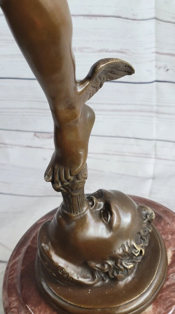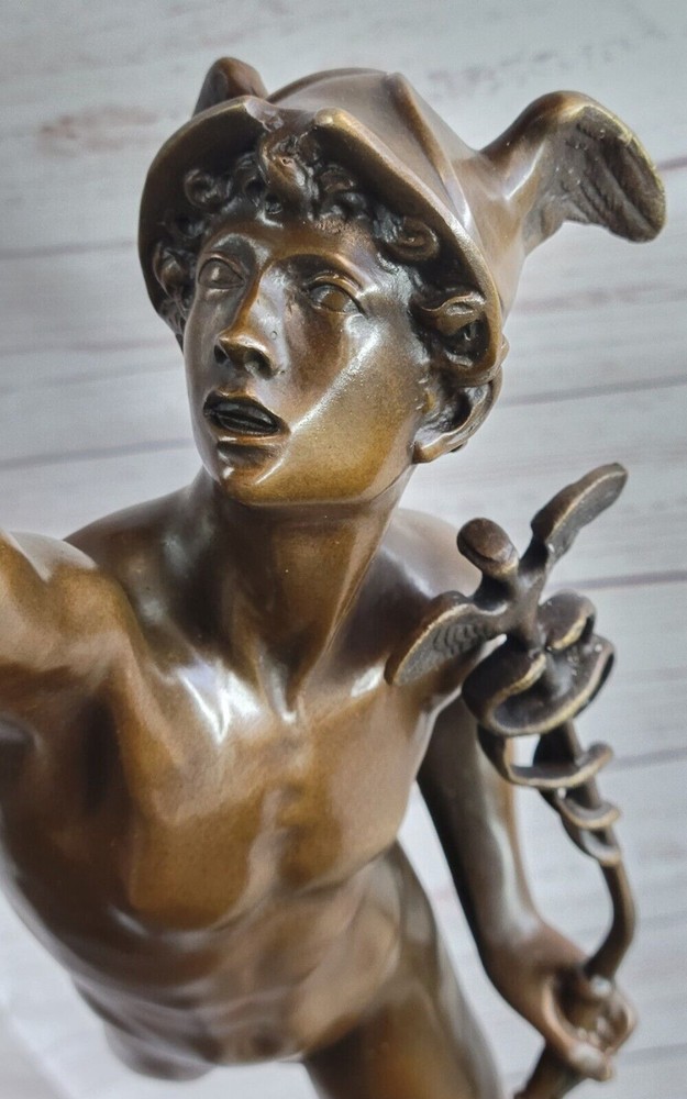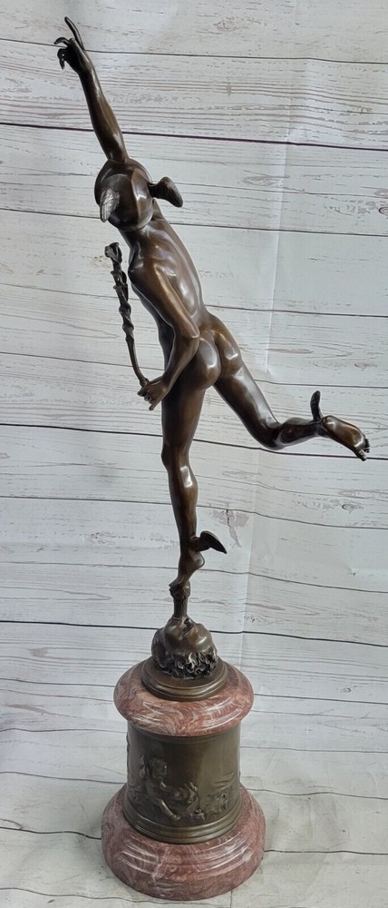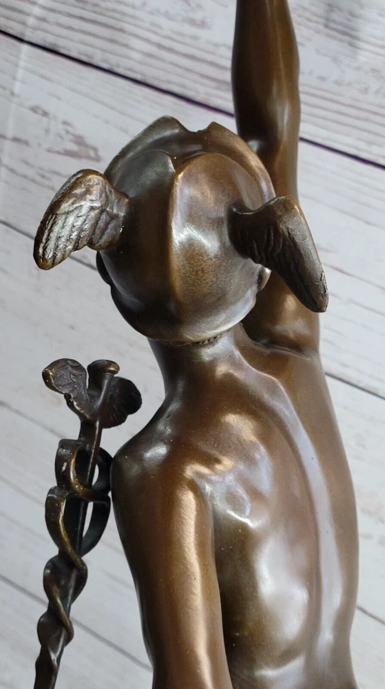 Condition : This sculpture is in perfect condition. Bronze Dimensions with Marble Base: Height 34" X Width 19.5" Marble Dimensions: Diameter 7.5" Height without base:26.5" Weight:27 LBS Inventory:90EPEP94630709 This stunning bronze sculpture portrays Hermes, a revered figure in Greek mythology, renowned as the messenger of the gods. Alongside his role as a messenger, Hermes is also regarded as the patron of traffic, travelers, merchants, and shepherds. In Roman mythology, he is associated with the god Mercury. Miguel Lopez, also known as Milo, pays homage to Giambologna with his remarkable sculpture of Hermes, which stands as an iconic representation of the god. Titled "The Flying Mercury," the sculpture captures Hermes delicately balanced on an ethereal column of air, sustained by the breath of Zephyr. The figure of the youthful Hermes exudes elegance and grace, with its elongated body exquisitely crafted from every angle. Resting upon a beautifully shaped marble base, this sculpture bears Milo's signature, adding to its allure and authenticity. This exquisite bronze artwork invites admirers to delve into the captivating world of Greek mythology, where Hermes holds a significant place. The sculpture's intricate details and masterful craftsmanship make it a captivating centerpiece, evoking a sense of wonder and fascination. Whether displayed in a home, office, or gallery, this Hermes sculpture is a testament to the enduring beauty of classical art and mythology, serving as a captivating symbol of grace, communication, and journeys. Extra Large Detailed Signed Original Artwork by Milo Hermes flying Mercury Bronze Statue Video will open in a new window Using the eBay App? Paste link into a browser window: [isdntekvideo]
