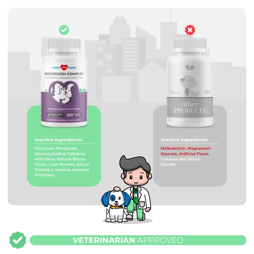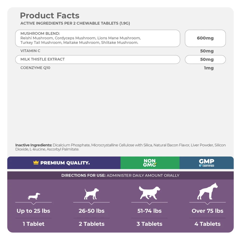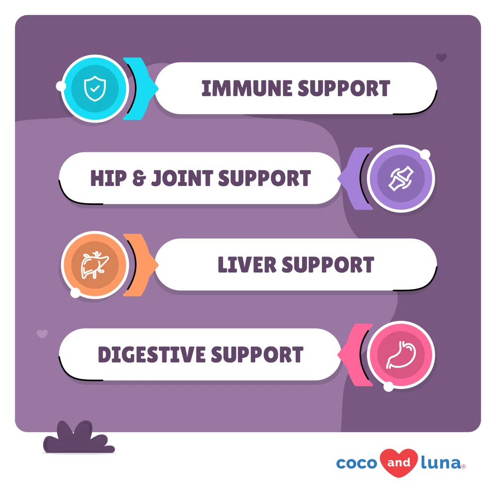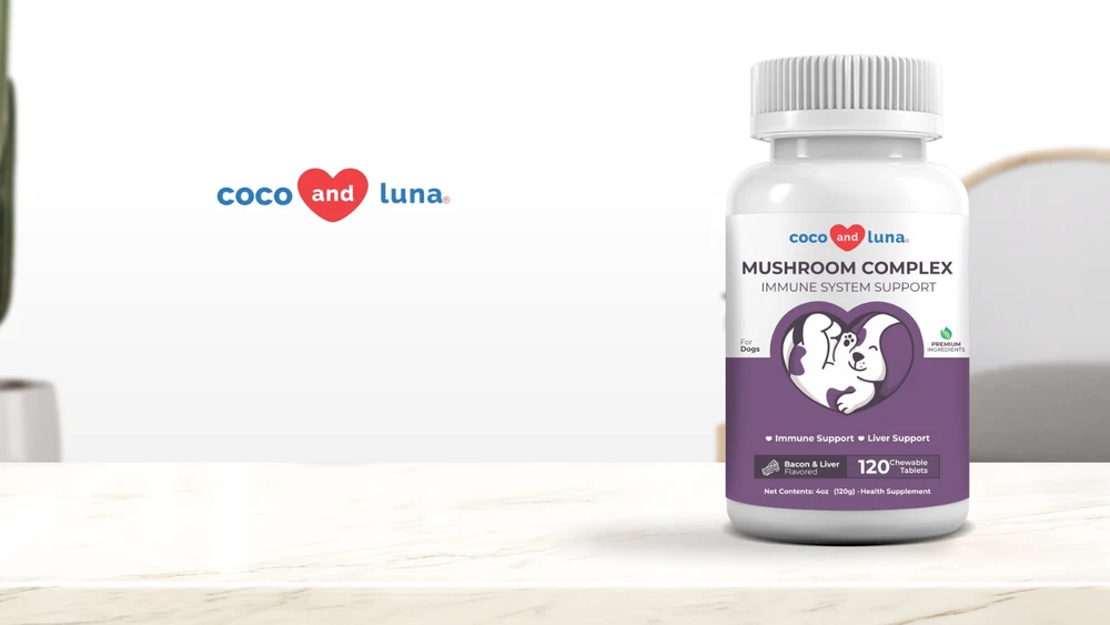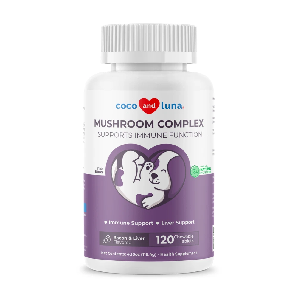 Mushroom Blend – Coco and Luna Mushroom Complex contains 6 mushrooms that include Turkey Tail, Lion's Mane, Shiitake, and Maitake, all which support digestion, cognition, joint health, and increase energy levels. Supports Hip and Joint and Liver - The Reishi mushroom found in these chewable supplements supports hip and joint health, while Milk Thistle supports the liver and makes an overall powerful formula. Immune Support - For immunity benefits, our Mushroom Complex contains Cordyceps, Maitake, Turkey Tail and Reishi, all which have properties that boost your dog’s immune system. Maitake mushrooms support the spleen, liver, and stomach. This mushroom blend is great for enhancing the immune system and has great anti-inflammatory properties. Reishi mushrooms are good to use with pets that are experiencing general weaknesses, such as dysfunctions in the liver, heart or kidney. They also stimulate and support immune system function. Cordyceps mushrooms provide intense immune, heart and respiratory support while also aiding with your dog's performance, endurance and vitality. Lion's Mane mushrooms are well known for their ability to kill damaged cells that often undergo DNA mutations and cause tumors to grow. Shiitake mushrooms are flush with amino acids, enzymes and health-supporting minerals like zinc, iron and calcium. Turkey Tail mushrooms contain a variety of powerful antioxidants and other compounds that may help boost your dog's immune system and even help fight certain diseases. Milk Thistle - It specifically protects the liver against toxins. Activates protein synthesis, and stimulates growth of new liver cells to replace those that are dead or damaged. Digestive Health - Coco and Luna Mushroom Complex contains mushrooms such as Turkey Tail, Lion’s Mane and Shiitake Mushroom which may provide your dog digestive support. Joint Support and Dog Liver Supplement- Our natural formula has Reishi Mushrooms which helps support hip and joint health while Milk Thistle supports the liver. Immune Support - Our mushroom complex used in our formula has properties that boosts your dog’s immune system and encourages a healthy immune response. Veterinarian Formulated - Our supplements are veterinarian formulated and are free from harmful ingredients like Palm Oil, Corn, Soy Derivatives, Synthetic Colors, or Artificial Flavors, prioritizing your pet's well-being. Made in the USA from US and Globally Sourced Ingredients - All of our supplement products are manufactured in the USA in FDA-registered facilities that are NSF and GMP-certified in the USA