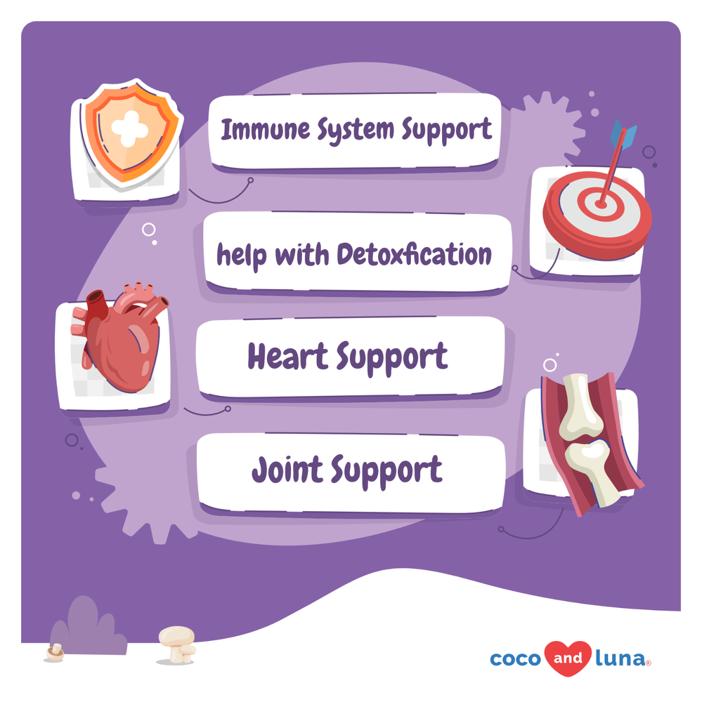 Our Hip and Joint formula is specially formulated with Green-lipped Mussel rich in omega-3 fatty acids, particularly eicosatetraenoic acid (ETA), which has potent anti-inflammatory properties that may help minimize joint tenderness and promote mobility. Green-lipped mussel extract, yucca schidigera, vitamin C, turmeric and Omega 3 fish oils are natural supplements that, when combined, can significantly boost the potency of anti-inflammatory and tenderness reduction effects in a dog's joints. Maintaining healthy hips and joints is crucial for enjoying an active and pain-free life. Coco and Luna Hip and Joint Supplement contains Glucosamine HCL, chondroitin, and MSM which support normal joint function and comfort by diminishing inflammation for optimal daily activity. These three ingredients work in harmony to promote joint health by building and maintaining cartilage and synovial fluid, making it easier to engage in daily activities without discomfort. Our product is Veterinarian Formulated and is free from Palm Oil, Corn, Soy Derivatives, Artificial Flavors, and Preservatives. Prioritize your dog's health the natural way. When used correctly and under veterinary guidance, Coco and Luna Hip and Joint has the potential to improve the overall quality of life for your furry friend, promoting their health and well-being for years to come. Digestive Health - Coco and Luna Mushroom Complex contains mushrooms such as Turkey Tail, Lion’s Mane and Shiitake Mushroom which may provide your dog digestive support. Joint Support and Dog Liver Supplement- Our natural formula has Reishi Mushrooms which helps support hip and joint health while Milk Thistle supports the liver. Immune Support - Our mushroom complex used in our formula has properties that boosts your dog’s immune system and encourages a healthy immune response. Veterinarian Formulated - Our supplements are veterinarian formulated and are free from harmful ingredients like Palm Oil, Corn, Soy Derivatives, Synthetic Colors, or Artificial Flavors, prioritizing your pet's well-being. Made in the USA from US and Globally Sourced Ingredients - All of our supplement products are manufactured in the USA in FDA-registered facilities that are NSF and GMP-certified in the USA.
