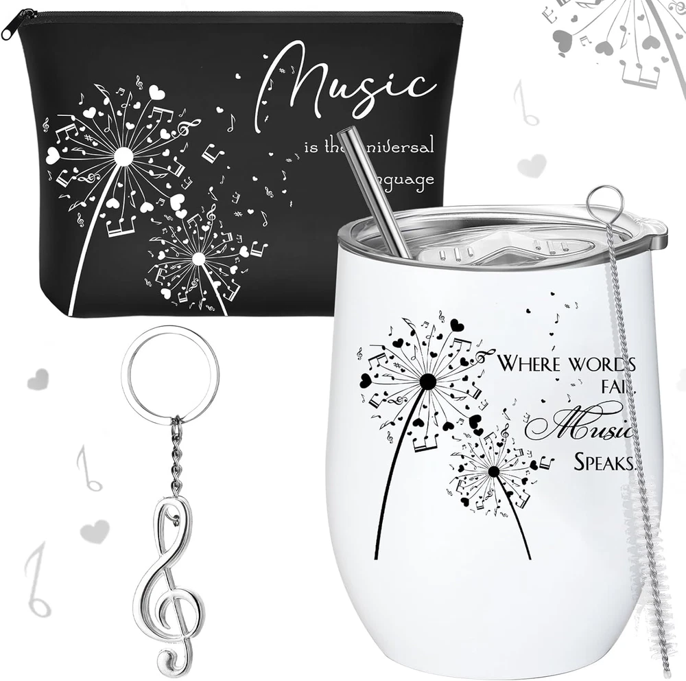 Gifts for Music Lovers: you will get 3 pieces of music lovers gifts in the package, including the wine tumbler, music cosmetic bag and music note keychain, nice music themed gifts for you to send to your music teachers, music lovers, or music fans Music and Dandelion Design: our music gifts are designed with some music notes and dandelions, printed with the quotes of [where words fail music speaks], and [music is the universal language], meaning that music knowledge from music teachers spreads like a dandelion and showing your appreciation to them Portable Cup: with 12 oz capacity, the music note tumbler is made of double stainless steel, which is insulated to keep your beverages hot or cold, suitable for using in both summer and winter, and the sealed lid is designed to keep the cup from leaking, as well as a straw and a straw brush for easy cleaning Makeup Bag with Words: the cosmetic bag is approx. 23 x 17 x 4 cm/ 9.06 x 6.69 x 1.57 inches, which is made of quality black canvas fabric, using dense thread and well knitting, sturdy, not easy to tear or wear, which can hold enough cosmetics like lipstick, brushes, powder, eyeshadow, mini mirror, phone, cards, keychains and more Music Teacher Appreciation Gifts: the musician gifts are appropriate for Christmas gifts, end of year gifts, education gifts, birthday gifts, Thanksgiving gifts, and other music festival; The musical note keychain can be carried around, hanging on key ring, handbag, purse, and backpack Features: The music keyring is made of stainless steel material, sturdy and reliable, offering you long time application. The music wine glass is a ideal gift for music, piano, guitar, violin or other musical instruments teacher, choir teacher, orchestra conductor, bringing them a big surprise. Specifications: Material: stainless steel and canvas fabric Color: as the picture shown Size: as the picture shown Package includes: 1 x Musical cup 1 x Music cosmetic bag 1 x Music keyring Notes: Manual measurement, please allow slight errors on size. The color may exist a slight difference due to different screen displays.