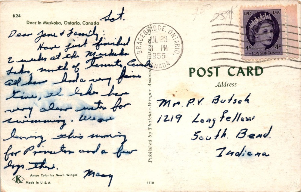 MAKE AN OFFER. THE MORE YOU BUY THE BETTER DEAL I WILL ACCEPT The postcard features a photograph of a deer in Muskoka, Ontario, Canada. The sender mentions enjoying time at a lake north of Toronto with clear water for swimming. They are leaving for Parry Sound and mention having dogs there. The postcard was published by Thatcher-Winger Associates and was made in the USA.