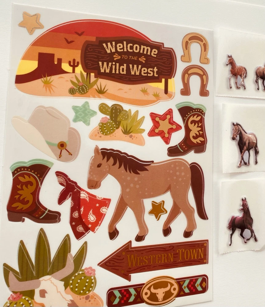 Add some Welcome to the West flair to your scrapbook pages or other paper projects with this Mixed Sticker Lot! Includes... 1 New Full Sticker Sheet & 6 Mxd. Rare Puffy Vinyl Horse Stickers!