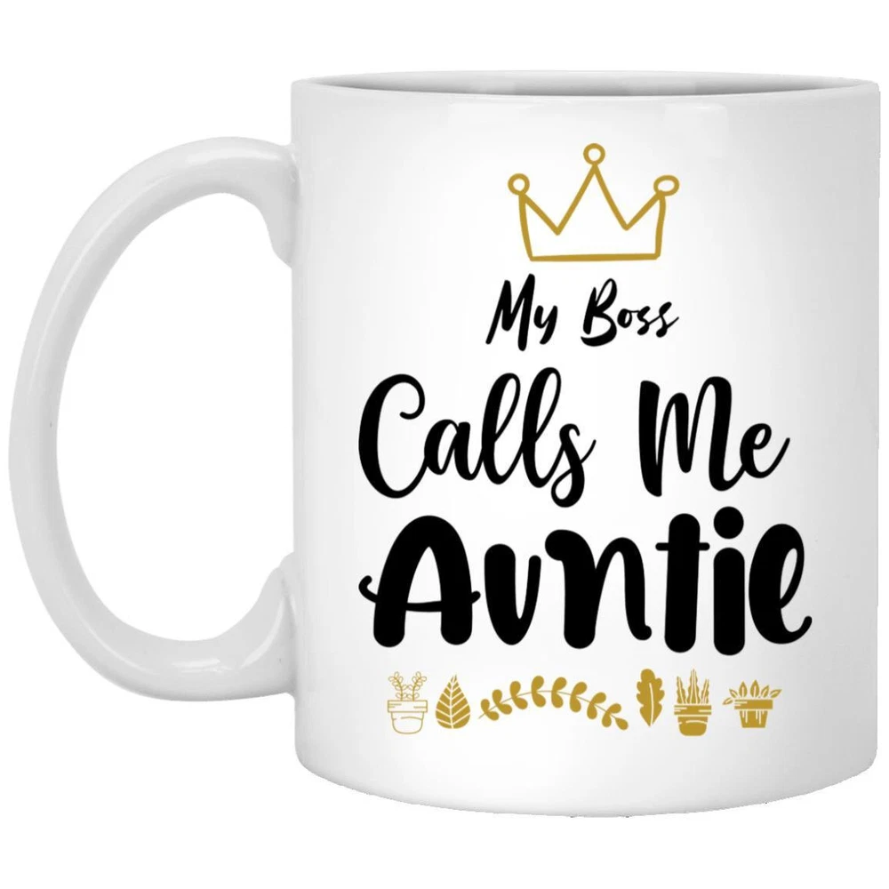 My Boss Calls Me Auntie Ceramic Coffee Mug Funny Novelty Coffee Cup Perfect Gift Product Details.. This high quality 11oz. ceramic white mug has a premium hard coat that provides crisp and vibrant color reproduction sure to last for years. Perfect for all hot & cold beverages. The highest quality printing possible is used. It will never fade no matter how many times you wash it. Material: 100% Ceramic. Print both sides. Dishwasher and Microwave Safe. High Gloss + Premium White Finish. Printed in the U.S.A. Personalized & Custom. We support personalized and custom mug to add custom, when placing an order, you can add notes to the "order note" in shipping address section. Also you can contact us directly via message. Shipping Info. Ready to ship in 1 to 2 business days, All products are made-to-order and proudly printed in the United States. Shipped by USPS and DHL, You will receive your order in 5-7 days. Replace & Refund. All products are defective during shipping broken, chipped will be replaced free of charge. You are not satisfied with the product, we will refund 100% money to you. If any other issues arise, please do not hesitate to message, we would be more than happy to assist you.