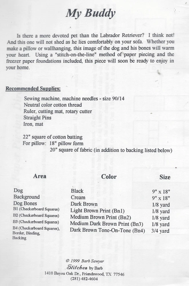 My Buddy Paper Pieced Pillow or Wallhanging Pattern Stitches by Barb You will receive patterns and instructions to make this appliqued 18" x 18" pillow or wallhanging. Copyright 1999. This pattern is in very good condition and is uncut. Thank you for visiting my auctions! See my other listings for more great items! I do combine shipping on multiple purchases. Please use the shopping cart and request an invoice for combined shipping. Please do not pay until you receive my invoice. I no longer refund shipping paid without a combined shipping invoice. Only one Paypal payment please for multiple purchases. I cannot combine shipping if more than one payment is made. If not using checkout, please email me within 3 days as to when payment will be made. According to your state's regulations, you may be subject to sales tax. All items shipped to the U.S are mailed with delivery confirmation. I normally do not offer free shipping. If you purchase more than one item, I combine shipping which will save you $$. Please keep this in mind when leaving feedback. If you are interested in priority mail, please email me for cost for your item. International buyers look under shipping and payment section for shipping cost to your country. In most cases, I mail the same day or the day after receiving payment. I have no control over the time it takes for the post office to deliver to your door. I do mail books media mail which could take up to 2 weeks or more to arrive. If you are not happy with this, please ask for a quote for priority mail. If you receive your package with a "DO NOT BEND" stamp and it has been folded or bent, take to your local post office. I pay higher rates for this service to insure your package arrives undamaged. txzj pxzj30205 txzj-11 txzj48 txzj115
