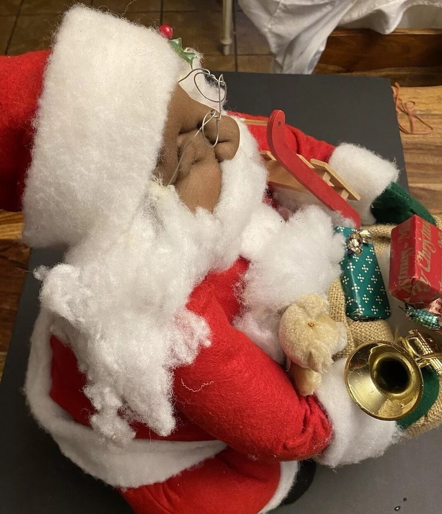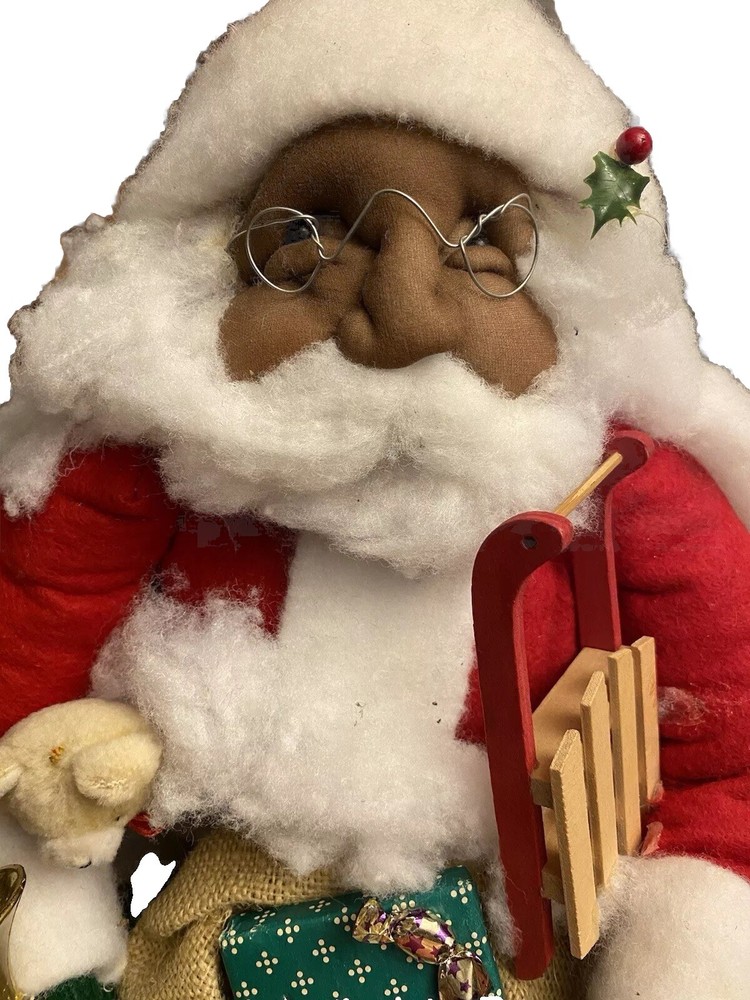This item has been in my family’s collection since the 90s, with only one owner. We hadn’t planned to part with it, but hard times force the sale. This is my best price, and I hope it finds a home where it’s valued. This handmade Santa Claus doll is a delightful, one-of-a-kind piece crafted entirely from soft fabric, down to its intricate facial features. He is sitting on a wooden like circle unseen. Santa holds a sack filled with gifts, including a trumpet, sled, and presents. Please note, this item does not include any packaging or certificates, and it’s unclear if it originally came with any. However, the doll is in perfect, like-new condition (used as a display in a store) and would be a charming addition to any Christmas décor or doll collection. You will be the only one to have THIS SANTA