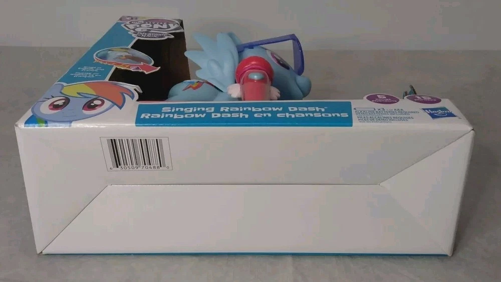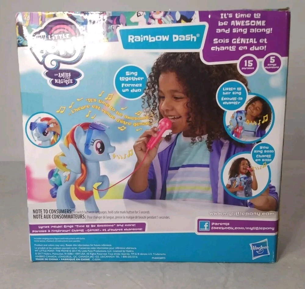 My Little Pony Friendship Magic Singing Rainbow Dash BNIB is a colourful action figure featuring everyone's favourite character, Rainbow Dash, from the beloved TV show My Little Pony. This multicolored figure comes with a microphone for added playtime fun. Made of vinyl and plastic, this 2016 manufactured toy is suitable for children aged 3-4 years. With the ability to sing, this original Hasbro product is a must-have for any My Little Pony fan.