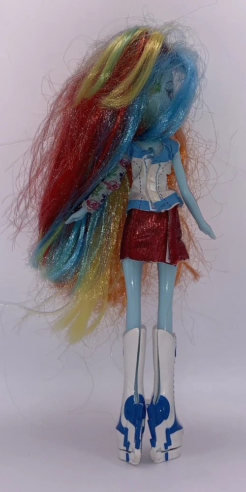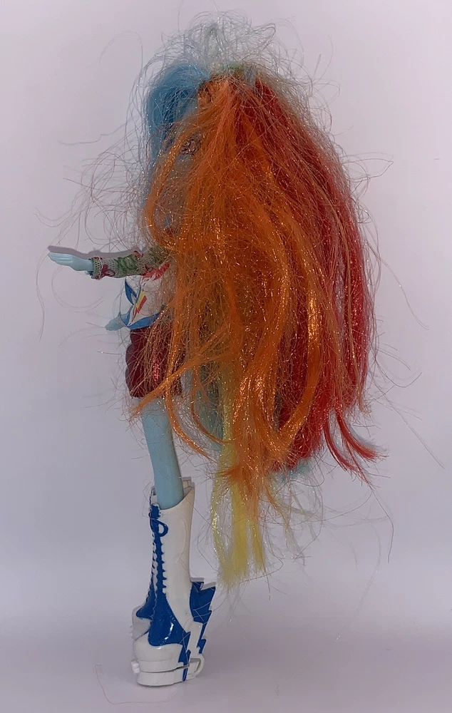 My Little Pony Equestria Girls Rainbow Dash Doll is missing her guitar but she is still fabulous! This 9-inch fashion doll comes with her multicolored outfit, shoes, and a blue complexion. Her hair color is a mix of colors and her eyes are pink. The doll is perfect for fans of the Music theme and Hasbro brand. Missing guitar. Dolls hair is a bit outta wack but can be fixed.