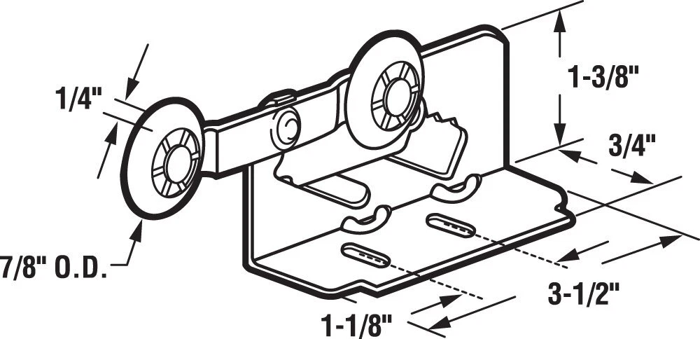 Product Description This tandem roller assembly is constructed from nylon. It features an adjustable top mount design with round edge nylon wheels with a 1/2 inch nut. It fits Acme and other similar styled doors that are 3/4 inch to 1-3/4 inch thick. From the Manufacturer This tandem roller assembly is constructed from nylon. It features an adjustable top mount design with round edge nylon wheels. It fits Acme and like styled doors that are 3/4 to 1-3/4 in. thick. Used as a pocket door top roller, found on Acme doors Fits 3/4 inch to 1-3/4 inch thick doors Adjustable bracket for mounting, please use a bubble level to ensure the rollers keep the door parallel for best rolling results Stamped steel construction with zinc finish and 7/8 inch diameter nylon roller Please refer to the line art drawing and compare with your original item before purchasing
