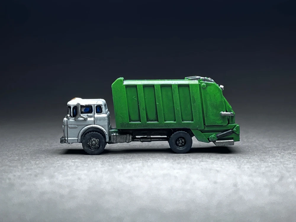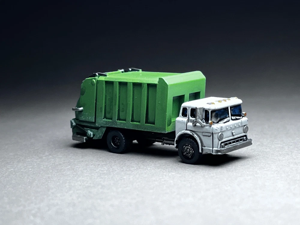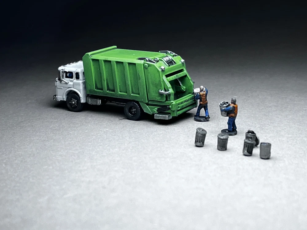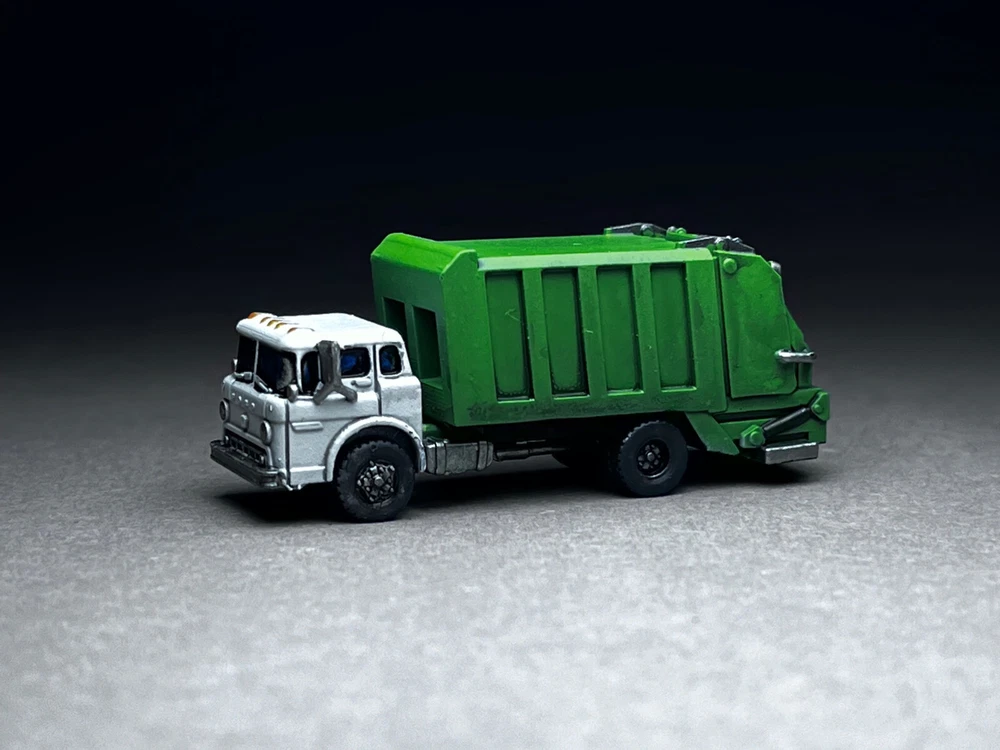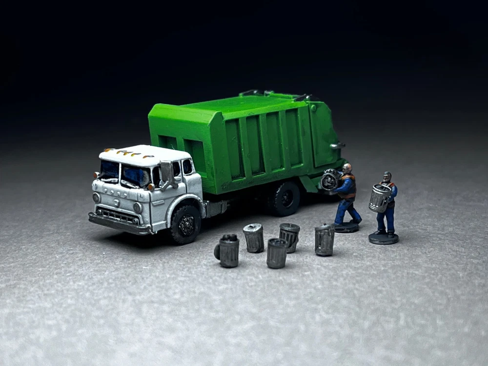 This is NOT a toy and it is NOT appropriate for children. This is a model for adult train enthusiasts, collectors and modellers. Please note this is N Scale (1:160 or about 12mm human figure) model and is slightly larger than my average wargaming models. Ford C600 COE (Cab Over Engine) Garbage Truck. The set includes 2 crew members with integrated bases (great for temporary layouts or if you simply do not wish to glue down figures on your layout or like to rearrange things often) and 5 unique trash cans (as seen in photos). These trucks were very common across wide range of industries. Manufactured from 1957-1990. This is the unsung hero of bygone era! Other figures seen in photos are NOT included. NOTE to train guys - This model was designed specifically to be printed at N scale. The small detail has been beefed up to allow for safe handling and easy painting. What you see in photo is the real model, not high-definition computer rendition that is IMPOSSIBLE to print. When shopping for N scale vehicles (at igMakes or other sellers), always look for photographs of printed models. Unscrupulous sellers will show off high-detail models that simply cannot be reproduced on small N scale print regardless how good printer or resin they use. The big red flag is lack of actual model photos, instead you are presented with gray computer CAD rendition of what model looks like. If a model was not designed for N scale, scaling down will result in small detail dissolving, or if they do print successfully, the fragility will not allow for safe handling or will break during shipment! i.e. an inch diameter antenna on large model shrunk to N scale will be sub-milimeter and will break of the moment you touch it - assuming it survives the shipping igMakes N scale model difference: 1. built from ground up for N scale, all detail will print flawlessly and allow for safe handling 2. I DO NOT hollow my models EVER! You will love the solid hefty chunk of resin feel in your hand! There is ZERO chance of uncured resin pouring out. Beware of "clear resin" scam where sellers claim the purpose was insertion of lights. They are hollowing models to save on resin and result is often raw resin dripping out of the model. 3. Our flawed prints go to trash and are NEVER sold to customers! 4. Our models comes with REMOVED SUPPORTS. Remaining micro supports can be scrubbed off with wooden toothpick. NO MORE WIRE CUTTERS nightmares and broken models!! 5. Our prints are thoroughly washed and ready to be primed and painted 6. I personally printed and painted all models you see in photos - what you see is exactly what you will get UNPAINTED 7. 14 days warranty - not happy with my model for ANY reason, send them back (you cover return shipping) for full refund of purchase price (shipping excluded) 8. Most models are already printed, in-stock and ship same or next day! No more waiting for weeks and wondering if you will ever receive your order. We make NO EXCUSES, we make models instead. 9. 100% NO-BS customer service!! We will work with you! We are a passionate small family business and we value your time and the fact you chose to spend your money on our models! 10. ig (the designer and the store owner) is big tabletop wargamer and N scale train enthusiast (C&O, Virginia, Southern). I know what works and how to make models right! My PROMISE is never to sell anyone inferior junk just in order to make few bucks. Because we make our own models, when there is a problem, we go back to CAD and fix it! One (1) truck included. Included figures are UNPAINTED. NO other figures in photo background are included. If you are interested in painted figures, please contact me for more info. This is an unique in-house design and print. 100% Made in USA! THANK YOU for your consideration! ig