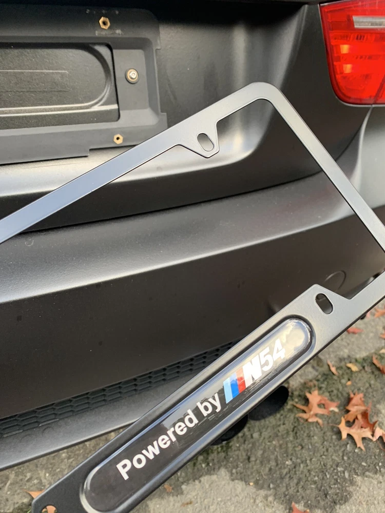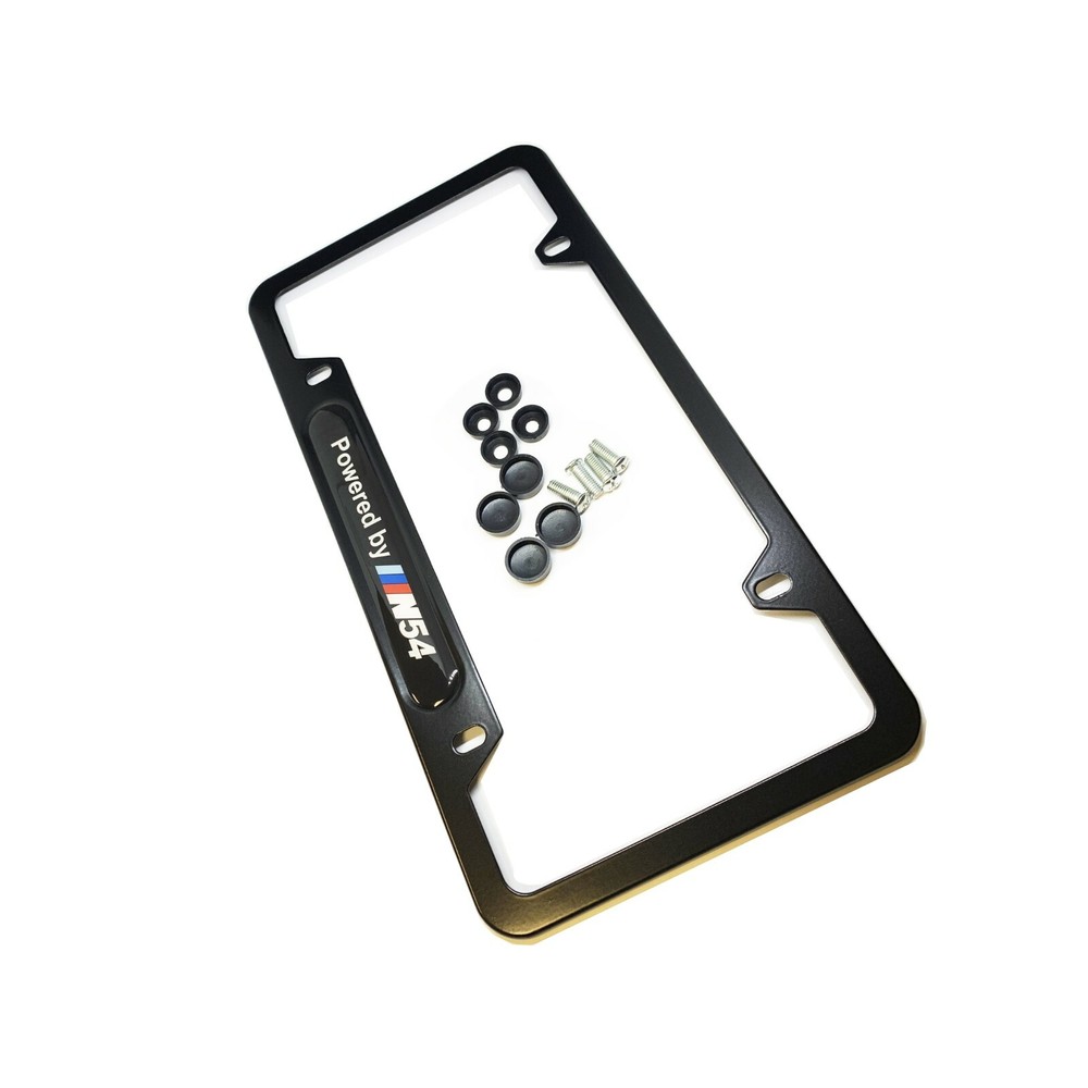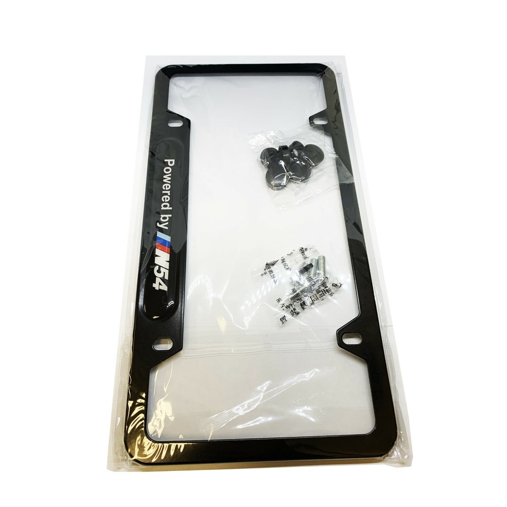 N54 License Plate Frame N54 License Plate Frame is made of stainless steel and feature a domed full color (Powered By N54 nameplate). All license plate frames come complete with matching hardware hider caps. LIMITED TIME: FREE AIR FRESHNER AND TIRE VALVES WITH THE FRAME PURCHASE . Sales Terms & Return Policy We will accept return within 14 days. Please notify us within 14 days after your purchase. Please contact us for RMA number before sending the item back. All item send back with out authorization will not be processed. Buyer pays for all return shipping fees . Parts have to be unused and unopened.
