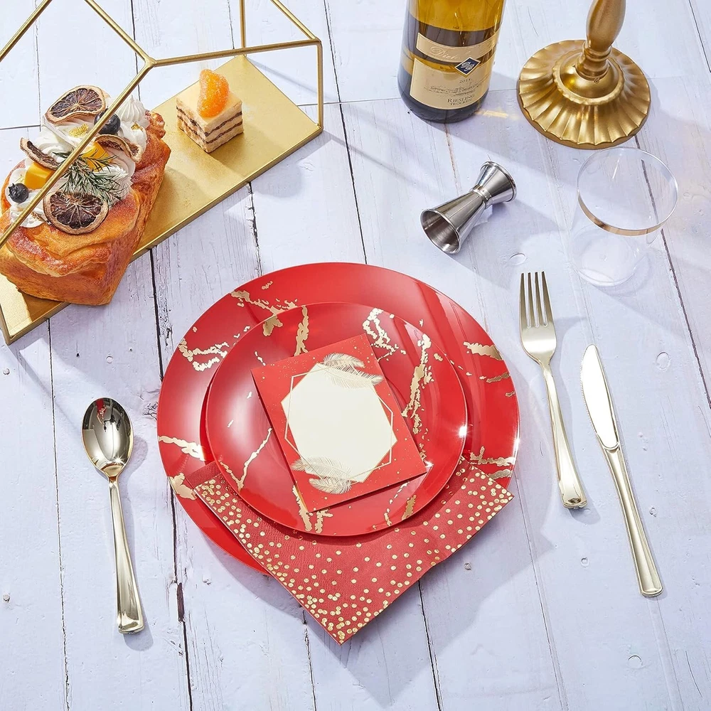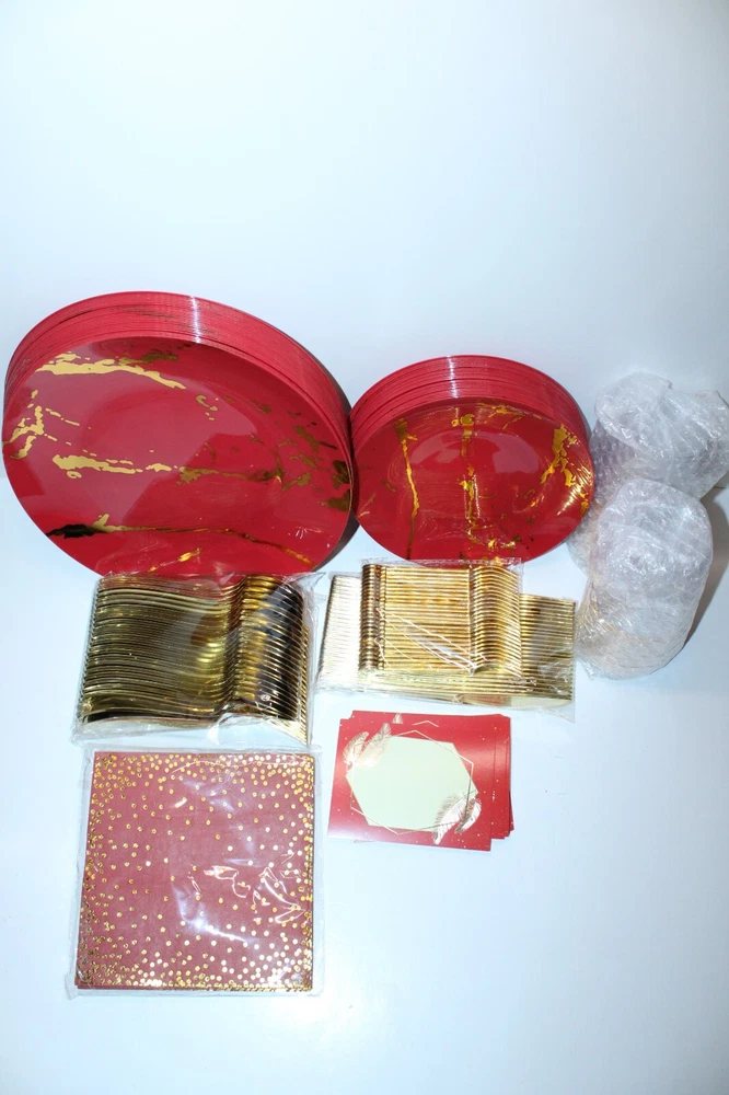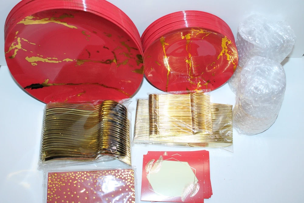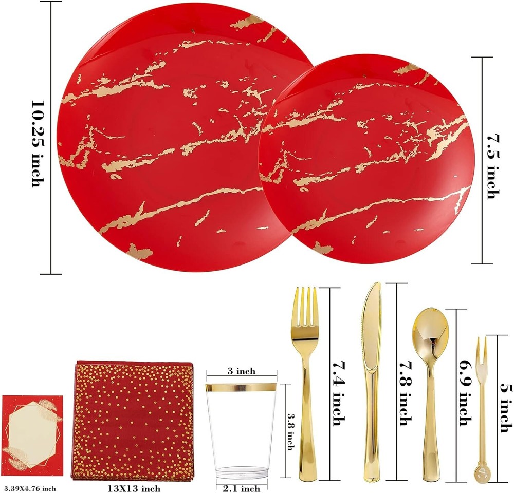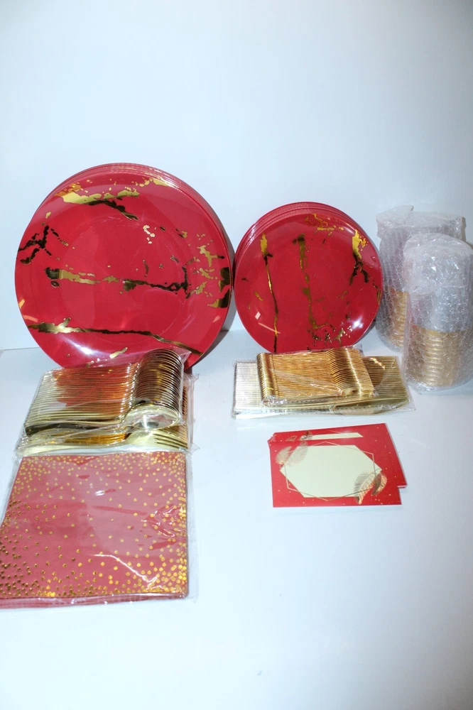 The N9R 225PCS Red Gold Plastic Plates Set is a versatile and elegant disposable dinnerware set perfect for various occasions such as weddings, birthday parties, and holiday gatherings. Made from durable plastic, this set includes 225 pieces of red and gold plates, making it easy to serve a large number of guests. The festive color combination and themed design add a touch of glamour to your table setting, while the quality material ensures easy clean-up and hassle-free preparation for your special events.