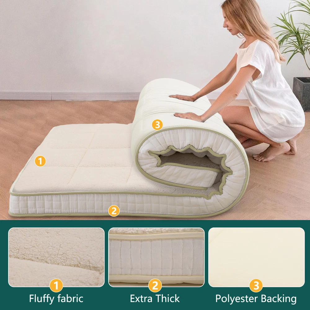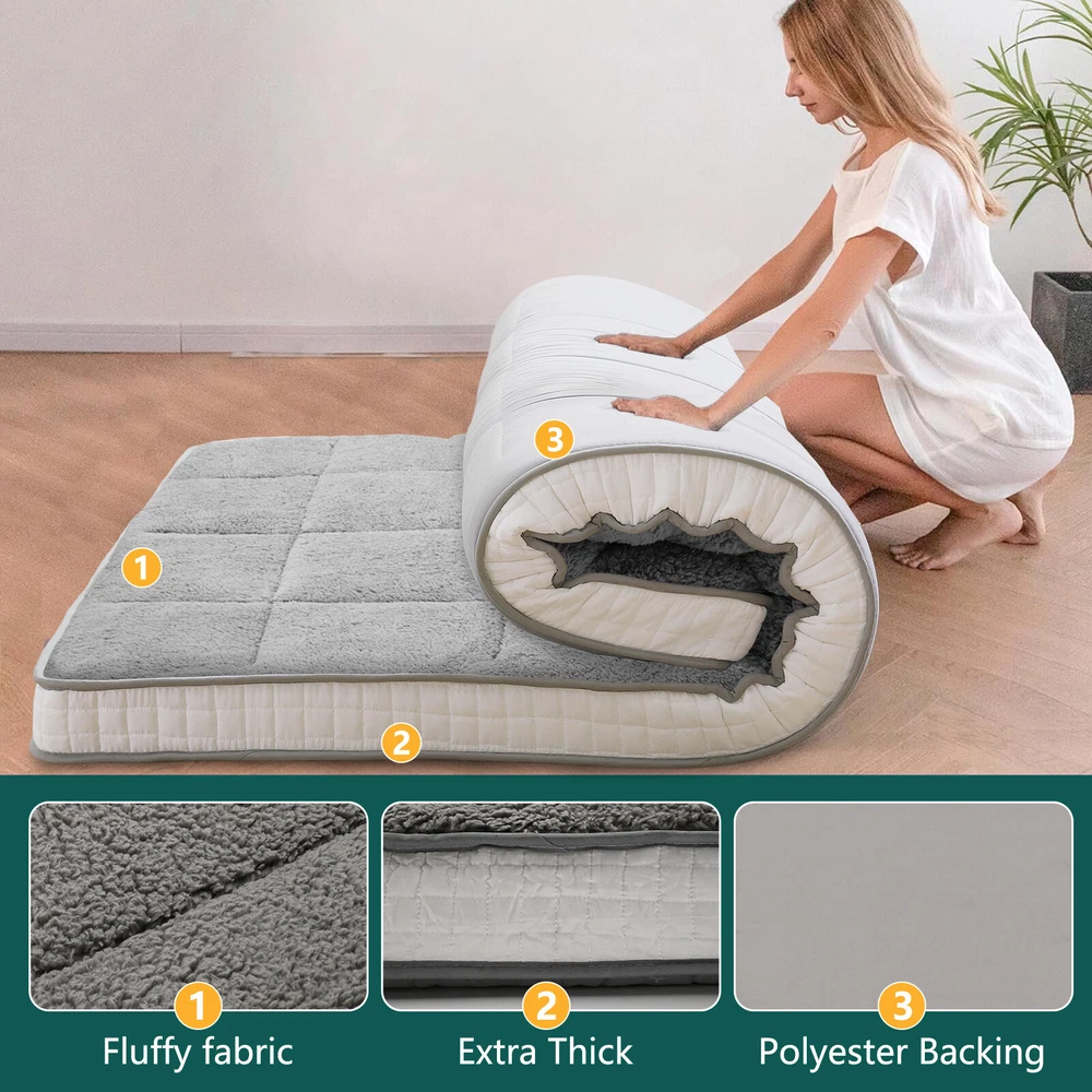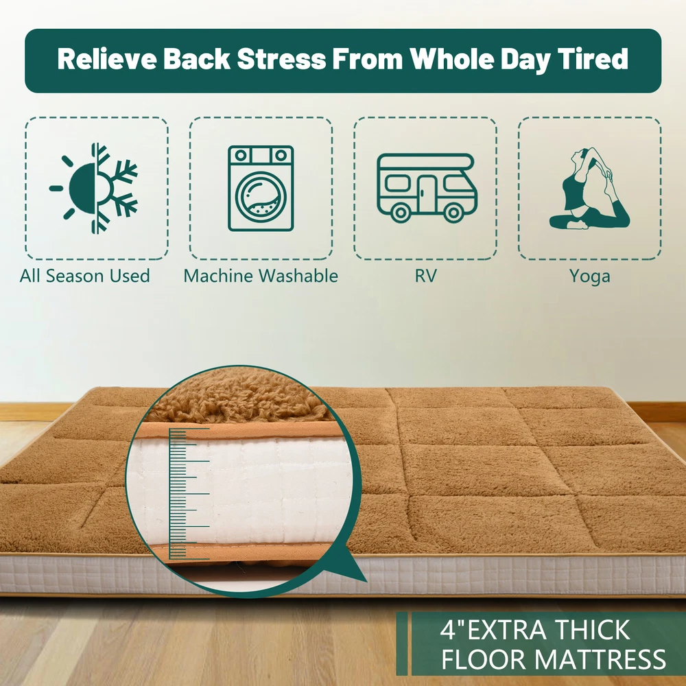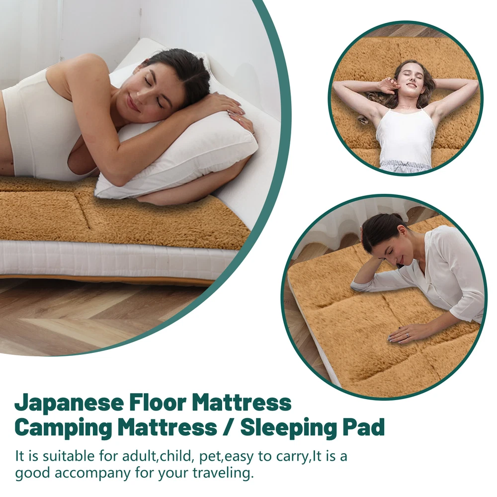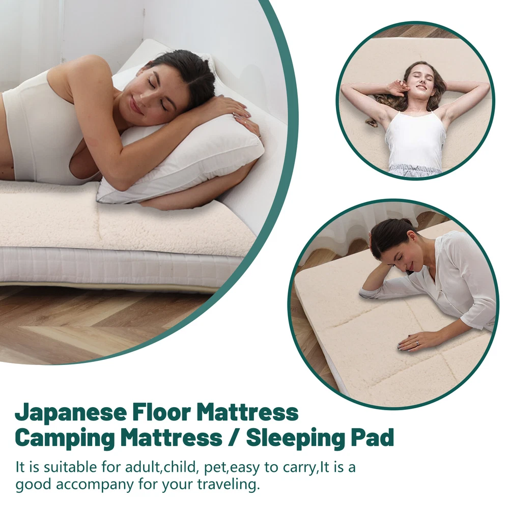 Japanese Floor Mattress for Adults, 4" Thick Sherpa Fleece Futon Mattress. It has Sherpa Fleece on the Front, Polyester on the Back. The reversible design makes it suitable for all seasons. It has 3 size : Twin: 80"L x 39"W x 4"Th; Full: 80"L x 54"W x 4"Th; Queen: 80"L x 60"W x 4"Th. Come with 1 pair of bandage, 1 storage bag, for better storage and carrying, The foldable tatami floor mattress allows you to get a comfortable sleep wherever you go. This Japanese mattress is traditionally rolled up to free up some space in the room during the day when not needed and easy to travel or store. This floor mattress is an ideal floor bed choice for guest room, hotel, dormitory, hospital, travel and your guest. It can be used as floor mattress, camping mat, bedroom futon, living room futon, floor lounger, tatami mat, sleeping floor mat, guest bed, Japanese bed mat, also can be kids play mat, floor pillow. Universal for all seasons : Sherpa Fleece on the Front, Polyester on the Back . The reversible design makes it usable for adults (sleeping) and kids (sleeping/playing), one side is warm fluffy polyester fabric, which is suitable for winter; the other side is polyester fabric, suitable for summer. Specially quilted to provide extra sleeping hours by providing exquisite comfort and temperature control throughout the sleep cycle. Futon Mattress Size : Twin: 80"L x 39"W x 4"Th; Full: 80"L x 54"W x 4"Th; Queen: 80"L x 60"W x 4"Th . With 2 bandage allowing it easy transport from one place to another is just one feature. The futon mattress adopts double layer tape edge runs along the edges of the mattress surface, protecting against edge break-down. High side edge reinforces the support along the outer edges of the mattress. Multiple Materials Filling : The secret of Soft but Supportive was this: Five-layer Construction: wool-like fleece surface + microfiber fill + memory foam + microfiber fill + wool-like fleece surface. The surface was premium high thread count wool-like fabrics; The second layer is softness layer, 550GSM whole piece microfiber fill; The core layer is support layer, 4 inches memory foam. Five-layer Construction make up the special soft and supportive futon mattress. Easy to Store and Carry : Come with 1 pair of bandage, 1 storage bag, for better storage and carrying, The foldable tatami floor mattress allows you to get a comfortable sleep wherever you go. Perfect for small apartments and tight spaces, effectively save living space and move easily. You can easily fold it and put in the included storage bag when you don't need it. Easy to travel or store keep it in your closet or other storage location. Roll up Mattress : This Japanese mattress is traditionally rolled up to free up some space in the room during the day when not needed and easy to travel or store. This floor mattress is an ideal floor bed choice for guest room, hotel, dormitory, hospital, travel and your guest. It can be used as floor mattress, camping mat, bedroom futon, living room futon, floor lounger, tatami mat, sleeping floor mat, guest bed, Japanese bed mat, also can be kids play mat, floor pillow. Kind Notice : Since the mattress is packed carefully for transportation, opening it the first time requires a little care. Once it is taken out of the box, it is to be patted gently and kept under the sun so it regains its original shape after 2-3 days. Once you do so, it is ready to use. However, it can be wiped cleaned with a wet cloth if required. REMEMEBER: Don’t submerse it in water. PREMIUM MATERIAL- Our Japanese Floor Mattress has a five-layer design that is skin-friendly, comfortable, and breathable. The combination of memory foam and extra padding filled in the mattress is not only soft, but also provides good support for your body, relieving stress and making you feel relaxed and comfortable. DUAL USE DESIGN MATTRESS- Futton Mattress with warm, fluffy fabric on one side is ideal for winter use; The other side is polyester fabric, suitable for summer use. Two different fabrics for year-round use! The mattress pad can be used indoors and outdoors, it could be used as a bedroom futon, tatami mat, sleeping floor mat, children's play mat, also could be guest mattress bed or camping tent mattress. WIDE RANGE of USES - Floor mattress can be used as a futon in the bedroom, yoga mat, pet bed, tatami mat, kids' play mat, sleeping floor mat, tent mat, living room futon, or guest mattress bed. It is excellent for both adults and children. You may take it with you everywhere you go in your car; FINE WORKMANSHIP - The pattern is made very delicately and thoroughly but with strong, firm thread. The borders of the mattress are hemmed to make it more structured and intact. The floor mattress has three sizes: Twin/Full/Queen, meeting your different needs;