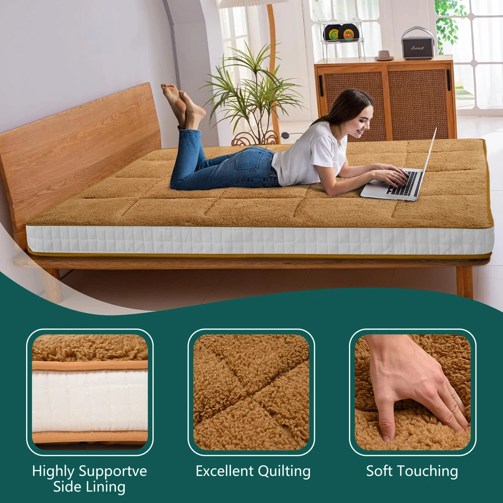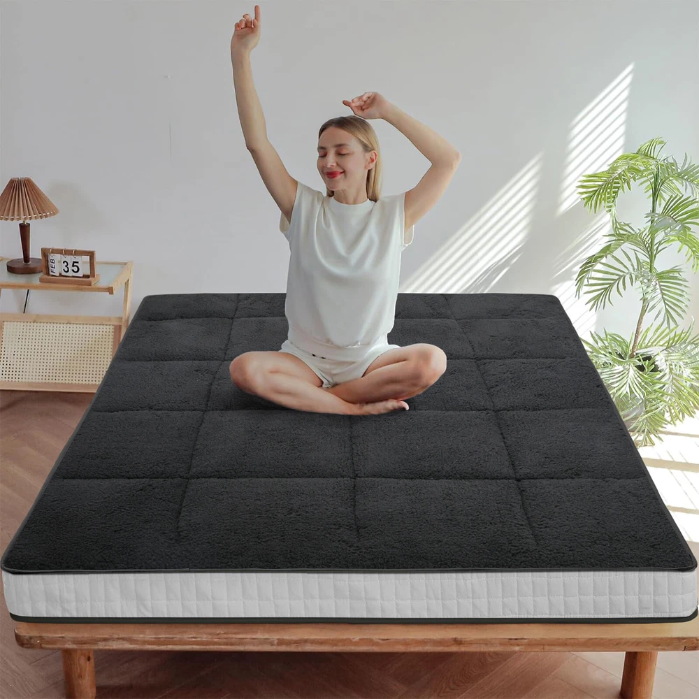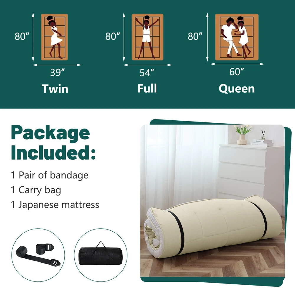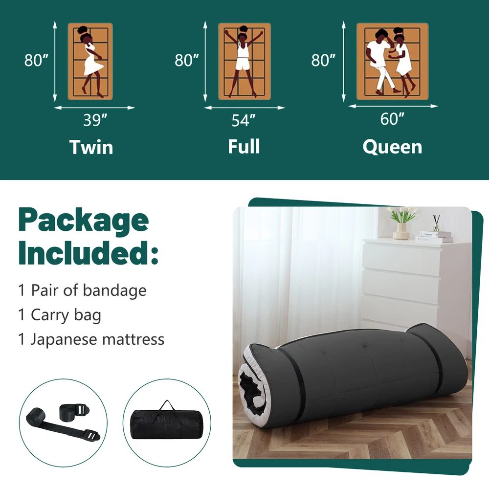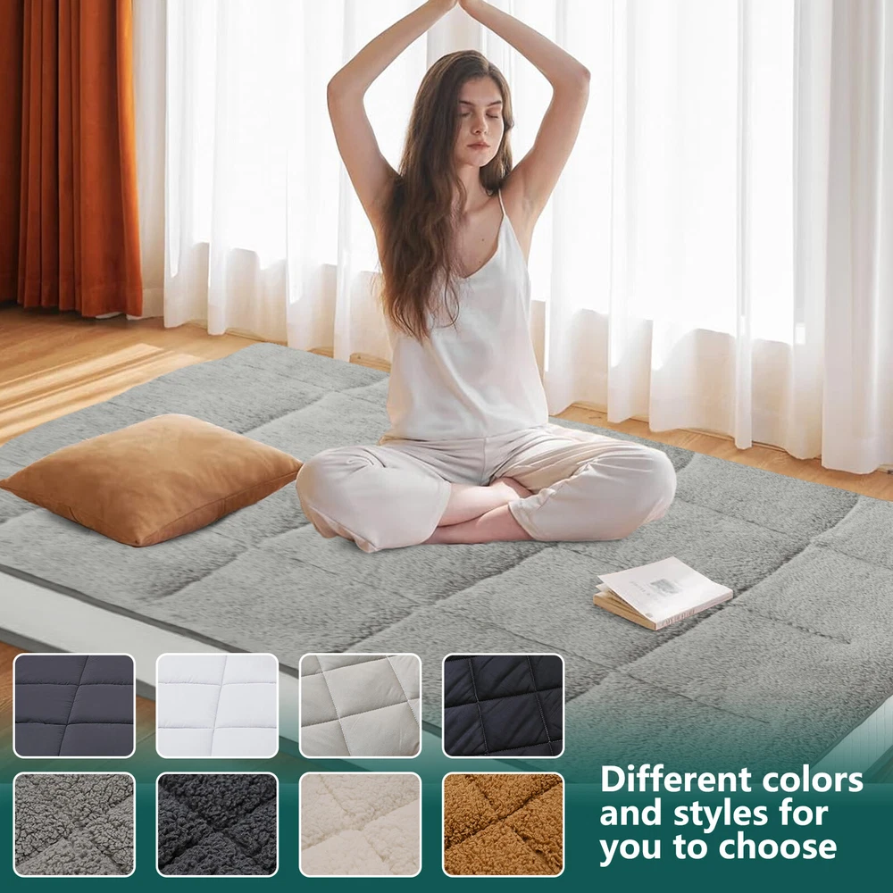 Japanese Floor Mattress for Adults, 4" Thick Sherpa Fleece Futon Mattress. It has Sherpa Fleece on the Front, Polyester on the Back. The reversible design makes it suitable for all seasons. It has 3 size : Twin: 80"L x 39"W x 4"Th; Full: 80"L x 54"W x 4"Th; Queen: 80"L x 60"W x 4"Th. Come with 1 pair of bandage, 1 storage bag, for better storage and carrying, The foldable tatami floor mattress allows you to get a comfortable sleep wherever you go. This Japanese mattress is traditionally rolled up to free up some space in the room during the day when not needed and easy to travel or store. This floor mattress is an ideal floor bed choice for guest room, hotel, dormitory, hospital, travel and your guest. It can be used as floor mattress, camping mat, bedroom futon, living room futon, floor lounger, tatami mat, sleeping floor mat, guest bed, Japanese bed mat, also can be kids play mat, floor pillow. Universal for all seasons : Sherpa Fleece on the Front, Polyester on the Back . The reversible design makes it usable for adults (sleeping) and kids (sleeping/playing), one side is warm fluffy polyester fabric, which is suitable for winter; the other side is polyester fabric, suitable for summer. Specially quilted to provide extra sleeping hours by providing exquisite comfort and temperature control throughout the sleep cycle. Futon Mattress Size : Twin: 80"L x 39"W x 4"Th; Full: 80"L x 54"W x 4"Th; Queen: 80"L x 60"W x 4"Th . With 2 bandage allowing it easy transport from one place to another is just one feature. The futon mattress adopts double layer tape edge runs along the edges of the mattress surface, protecting against edge break-down. High side edge reinforces the support along the outer edges of the mattress. Multiple Materials Filling : The secret of Soft but Supportive was this: Five-layer Construction: wool-like fleece surface + microfiber fill + memory foam + microfiber fill + wool-like fleece surface. The surface was premium high thread count wool-like fabrics; The second layer is softness layer, 550GSM whole piece microfiber fill; The core layer is support layer, 4 inches memory foam. Five-layer Construction make up the special soft and supportive futon mattress. Easy to Store and Carry : Come with 1 pair of bandage, 1 storage bag, for better storage and carrying, The foldable tatami floor mattress allows you to get a comfortable sleep wherever you go. Perfect for small apartments and tight spaces, effectively save living space and move easily. You can easily fold it and put in the included storage bag when you don't need it. Easy to travel or store keep it in your closet or other storage location. Roll up Mattress : This Japanese mattress is traditionally rolled up to free up some space in the room during the day when not needed and easy to travel or store. This floor mattress is an ideal floor bed choice for guest room, hotel, dormitory, hospital, travel and your guest. It can be used as floor mattress, camping mat, bedroom futon, living room futon, floor lounger, tatami mat, sleeping floor mat, guest bed, Japanese bed mat, also can be kids play mat, floor pillow. Kind Notice : Since the mattress is packed carefully for transportation, opening it the first time requires a little care. Once it is taken out of the box, it is to be patted gently and kept under the sun so it regains its original shape after 2-3 days. Once you do so, it is ready to use. However, it can be wiped cleaned with a wet cloth if required. REMEMEBER: Don’t submerse it in water. PREMIUM MATERIAL- Our Japanese Floor Mattress has a five-layer design that is skin-friendly, comfortable, and breathable. The combination of memory foam and extra padding filled in the mattress is not only soft, but also provides good support for your body, relieving stress and making you feel relaxed and comfortable. DUAL USE DESIGN MATTRESS- Futton Mattress with warm, fluffy fabric on one side is ideal for winter use; The other side is polyester fabric, suitable for summer use. Two different fabrics for year-round use! The mattress pad can be used indoors and outdoors, it could be used as a bedroom futon, tatami mat, sleeping floor mat, children's play mat, also could be guest mattress bed or camping tent mattress. WIDE RANGE of USES - Floor mattress can be used as a futon in the bedroom, yoga mat, pet bed, tatami mat, kids' play mat, sleeping floor mat, tent mat, living room futon, or guest mattress bed. It is excellent for both adults and children. You may take it with you everywhere you go in your car; FINE WORKMANSHIP - The pattern is made very delicately and thoroughly but with strong, firm thread. The borders of the mattress are hemmed to make it more structured and intact. The floor mattress has three sizes: Twin/Full/Queen, meeting your different needs;