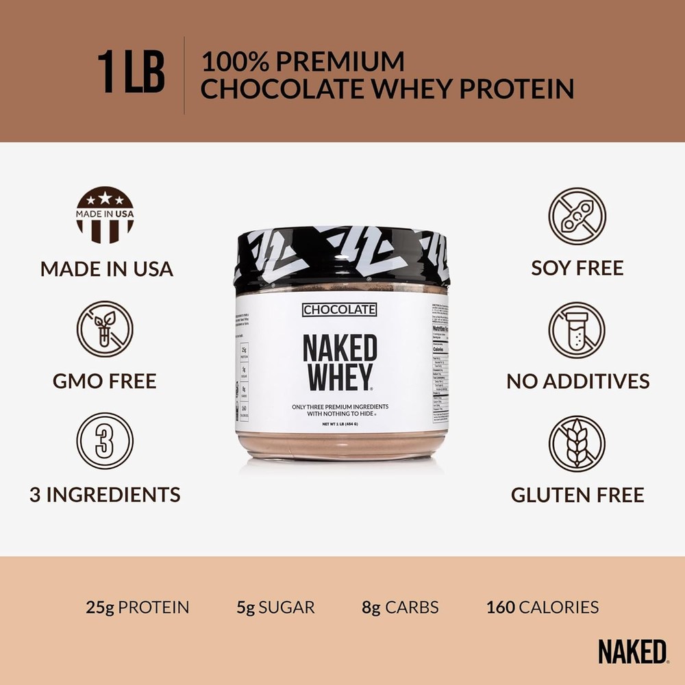 NAKED Chocolate Whey 1LB - All Natural Grass Fed 1 Pound (Pack of 1) Product Details Is Discontinued By Manufacturer : No Package Dimensions : 7.56 x 4.92 x 4.88 inches; 1 Pounds Manufacturer : Naked Nutrition Brand: NAKED Flavor: Chocolate Servings per Container: 12 Item Weight: 1 Pounds Material Type Free: Gluten Free, Soy Free, Non-GMO, No Artificial Sweeteners, No Artificial Flavors, No Artificial Colors Gluten Free, Soy Free, Non-GMO, No Artificial Sweeteners, No Artificial Flavors, No Artificial ColorsGluten Free, Soy Free, Non-GMO, No Artificial Sweeteners, No Artificial Flavors, No Artificial Colors See more ONLY THREE INGREDIENTS: 100% Grass Fed Pure Whey Protein, Organic Chocolate, and Organic Coconut Sugar. Naked Chocolate Whey contains no artificial sweeteners or colors and is GMO-Free, No rBGH or rBST , Soy Free and Gluten-Free. ALL NATURAL WHEY: Our Chocolate Grass Fed Whey is sourced from small dairy farms in Idaho & Northern California to bring you a non-denatured whey packed full of essential amino acids, clean protein and glutathione. MAXIMUM NUTRITION: 25g of Protein, 5g of Sugar, 8g of Carbs, 160 Calories, and 6.0g of BCAAs (branched-chain amino acid) per serving. COLD PROCESSED: Unlike most whey protein powders, Chocolate Naked Whey is cold processed to ensure zero contamination from chemical detergents (no acid or bleach) or, synthetic additives and this maintains important naturally occurring growth factors. CHOCOLATE WHEY PROTEIN: Use our chocolate protein powder as the perfect base of subtle flavor to blend with fruits and vegetables to create healthy pre and post-workout protein shakes. Because Chocolate Naked Whey has only 3 ingredients, you can use it to bake high protein recipes such as protein pancakes to take your muscle gains and recovery to new heights.