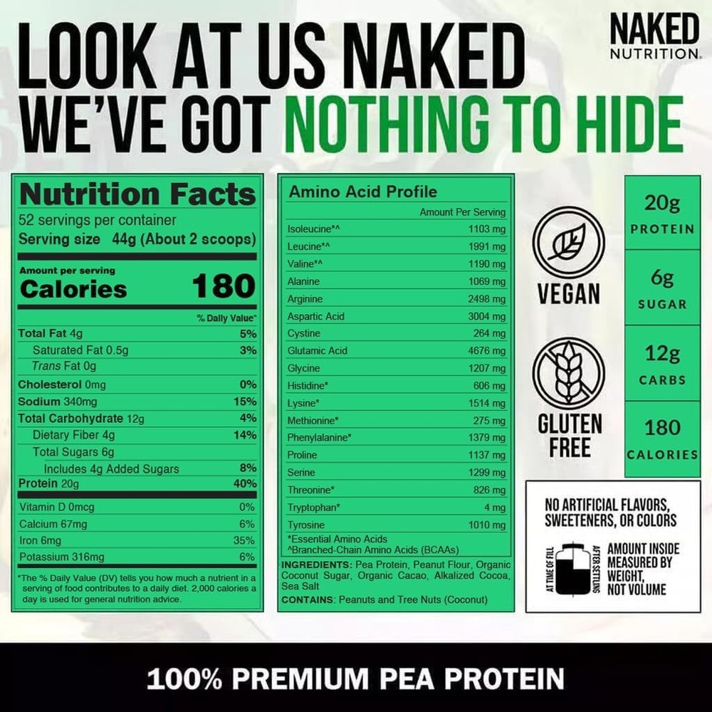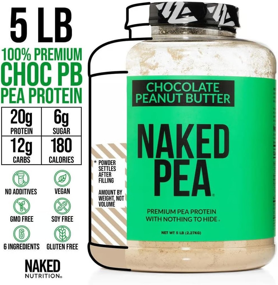 NAKED Pea - Chocolate Peanut Butter Protein from US & 5 Pound (Pack of 1) Description Features: NAKED MEANS NOTHING ARTIFICIAL: Pea Protein from US and Canadian Farms, Peanut Flour from US farms, Organic Coconut Sugar, Organic Cacao, Alkalized Cocoa, and Sea Salt. That's it. Naked Pea contains no artificial sweeteners, artificial flavors, or colors and is GMO-Free, Soy Free and Gluten-Free. VEGETARIAN AND VEGAN PROTEIN: Pea protein that is dairy free and made exclusively from raw yellow peas grown on environmentally friendly farms in both the USA and Canada. MAXIMUM NUTRITION: 20g of Protein, 6g of Sugar, 12g of Carbs, 180 Calories per serving. PROTEIN SHAKES AND RECIPES: Create rich chocolate pb pea protein shakes, smoothies and healthy green drinks. Provide your body with the daily protein it needs by adding Naked Pea to tea, sauces, and other recipes. CLEAN GAINS: To maintain a clean high-protein diet, use Naked Pea in pre and post workout shakes, smoothies and recipes for maximum recovery. Product Details: Package Dimensions : 11.02 x 8.03 x 7.99 inches; 5 Pounds Manufacturer : Naked Nutrition Country of Origin : USA Brand: NAKED Flavor: Chocolate Peanut Butter Item Weight: 5 Pounds Diet Type: Vegetarian, Vegan, Plant Based Protein Source: Pea Handling We will ship all orders within 1 business day of payment. Delivery We Do Not Ship Outside of the Continental US. Return Policy All items qualify for returns within 30 days of receipt. Buyer is responsible for return shipping on any item that is not damaged. Feedback We take our reputation seriously, we buy and sell online, so we understand the value of trust. If you are unsatisfied with your order, please contact us and we will work with you to resolve it to your satisfaction.