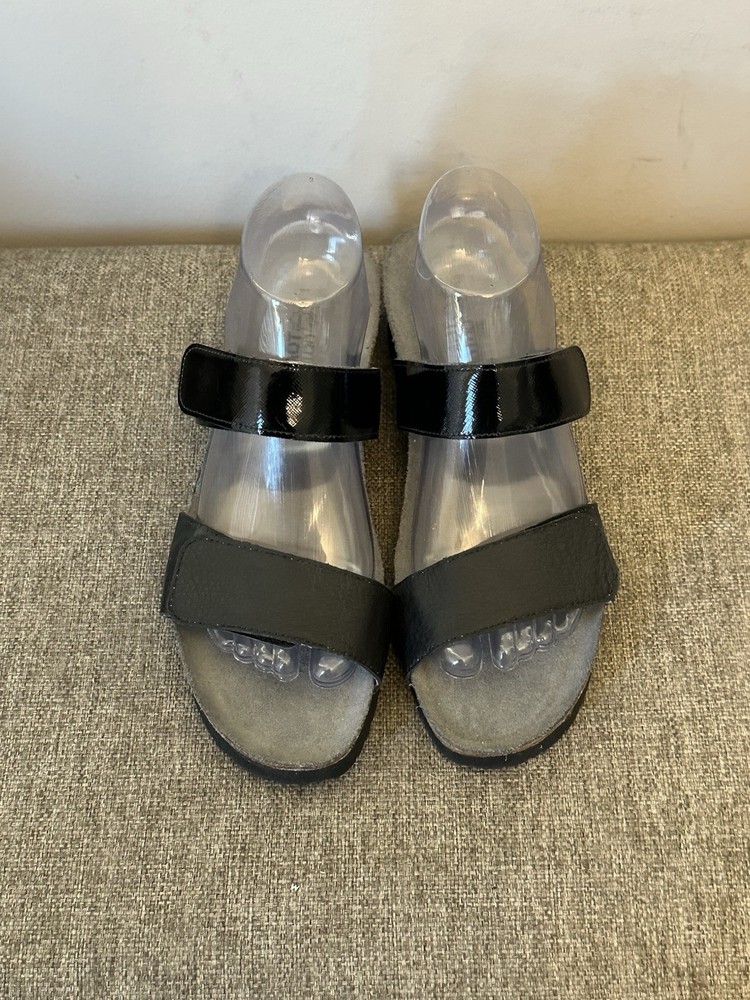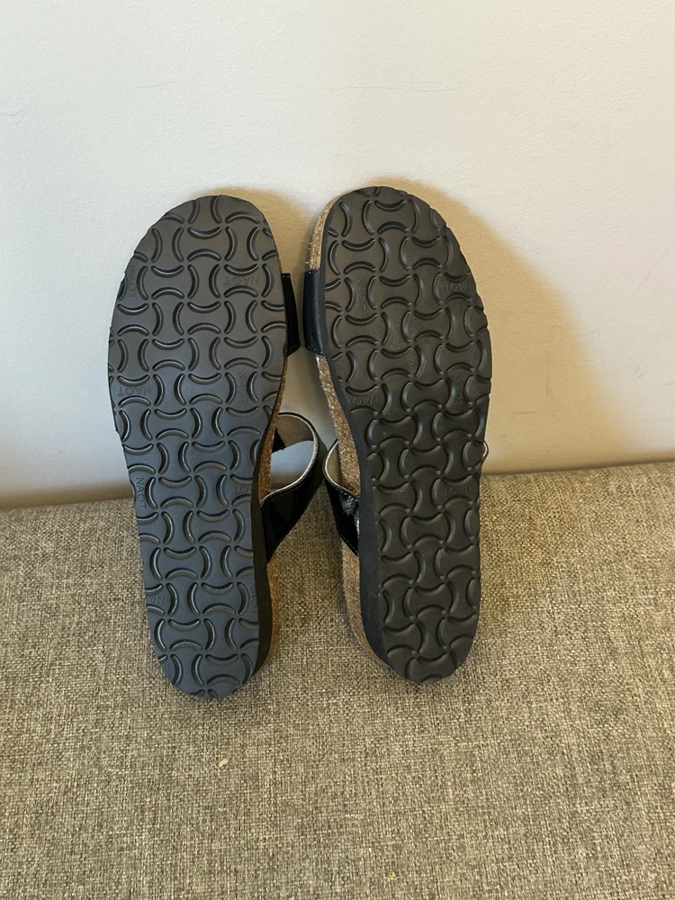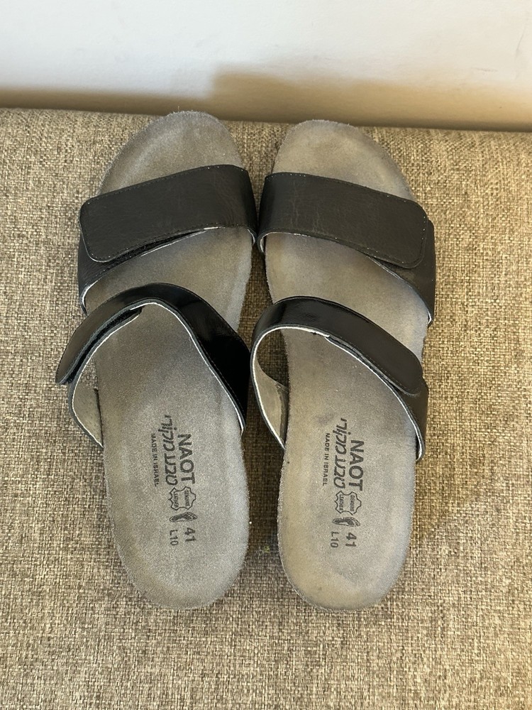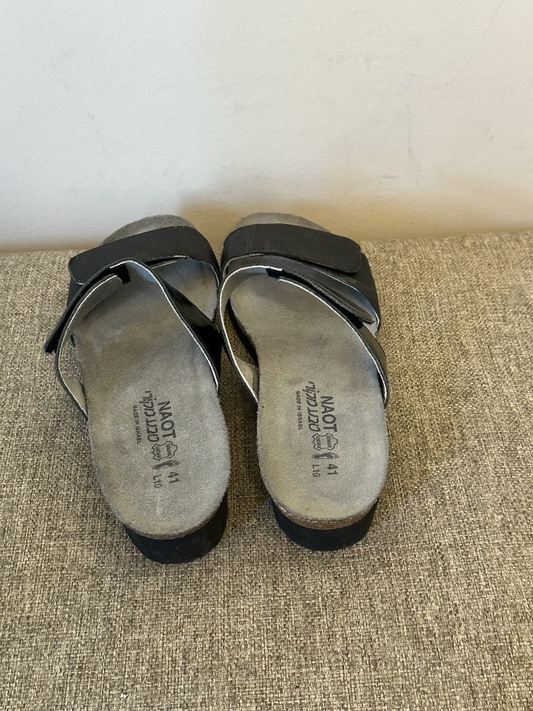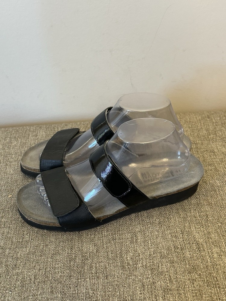 The NAOT Women's Black Leather Slip-On Low Wedge Sandal in Size 10 is a stylish and comfortable option for women who are looking for a gladiator-style sandal. The slip-on closure makes it easy to wear, while the low wedge heel provides stability and support. Made with high-quality leather, this sandal is durable and designed for all-day wear. Its solid black color and logo accents add a touch of sophistication to any outfit, making it a versatile addition to any woman's shoe collection. Preowned Good Condition