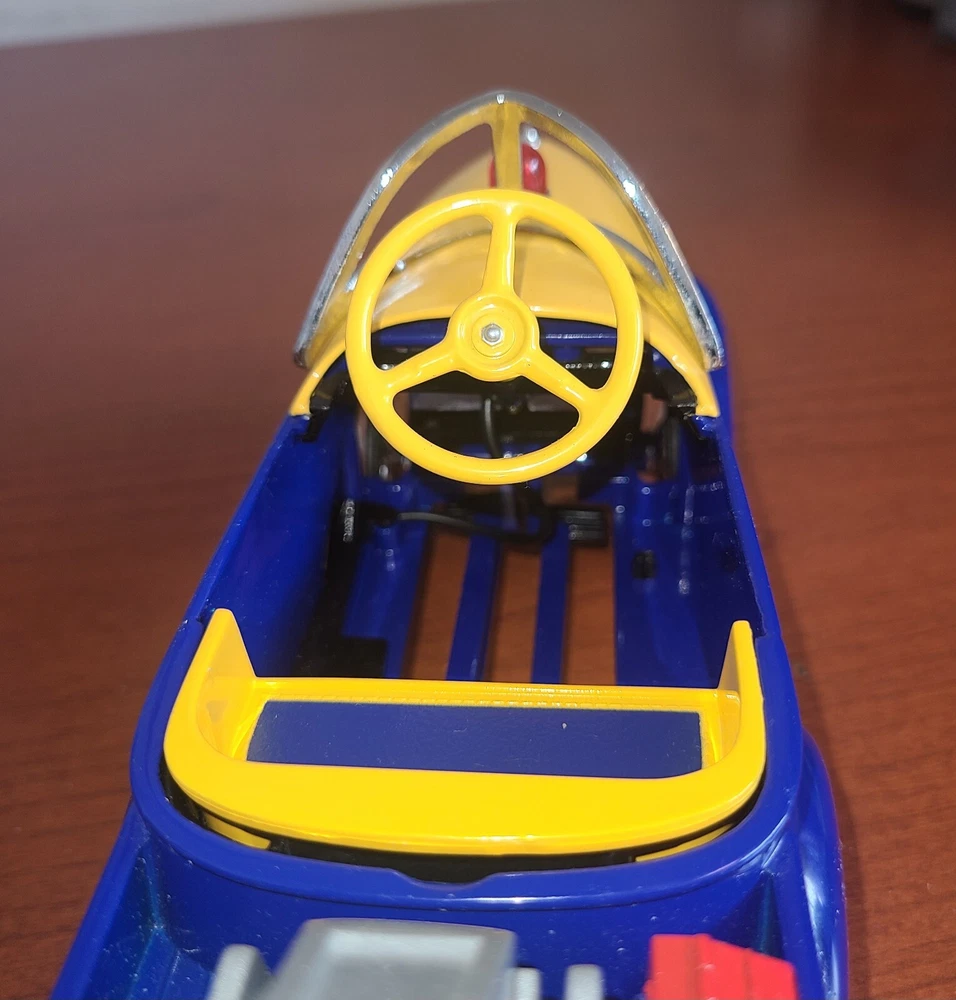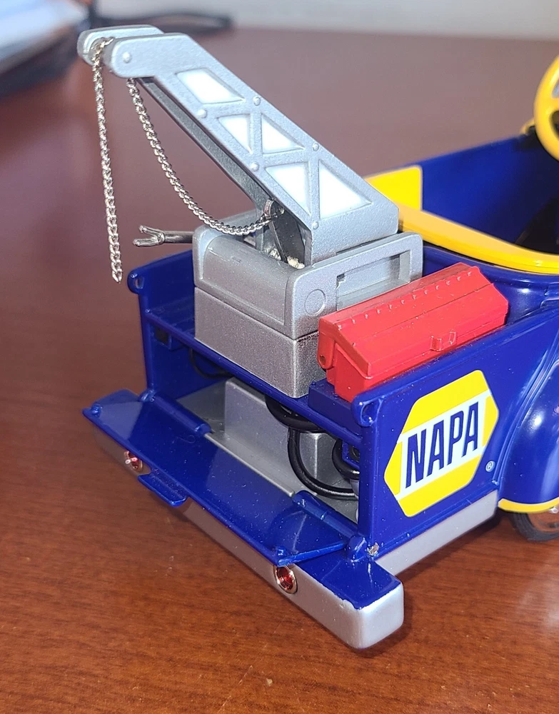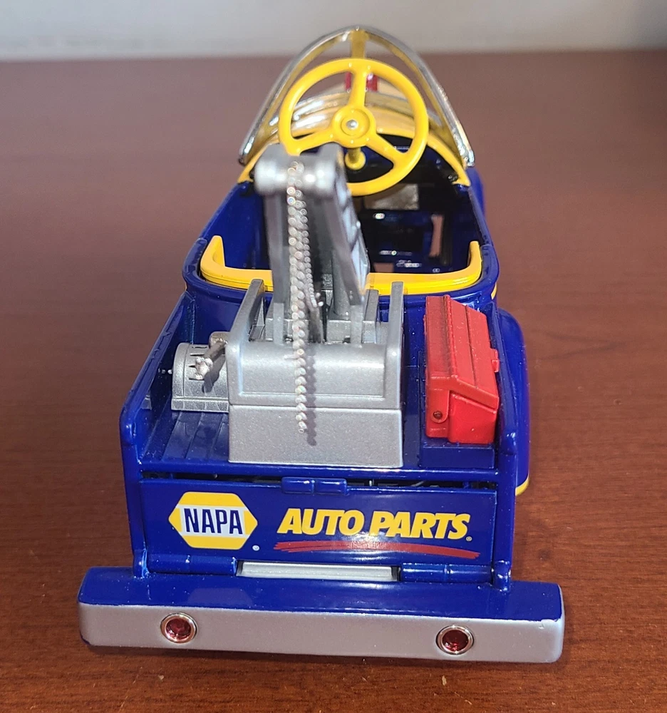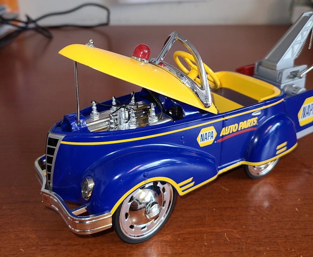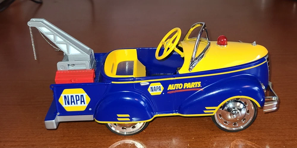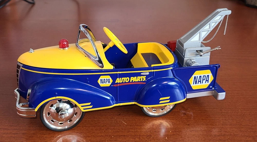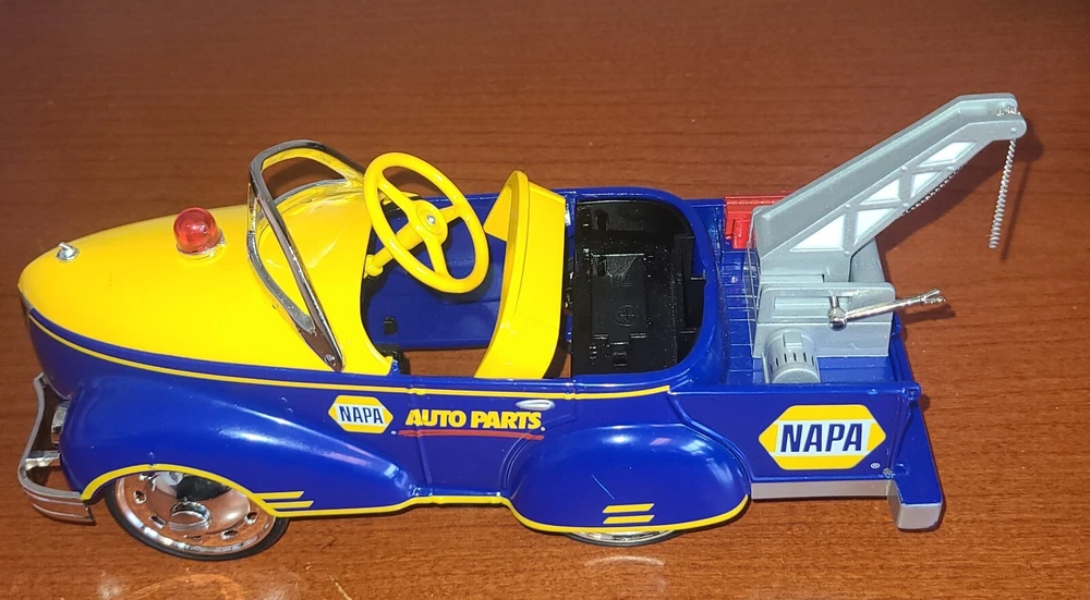For the collectors and enthusiasts, here is a rare Crown Premiums NAPA Auto Parts 1940 Gendron Tow Truck Diecast Pedal Car. This car takes batteries but I am not sure what it is supposed to do. I put batteries in but it doesn't seem to do anything. This vintage car is still exquisite and is a perfect addition to any antique vehicle collection. With the Napa Auto Parts Store theme, it's a unique item for diecast and toy vehicle enthusiasts. This advertising specimen is a contemporary manufacture with no compromise on the quality.
