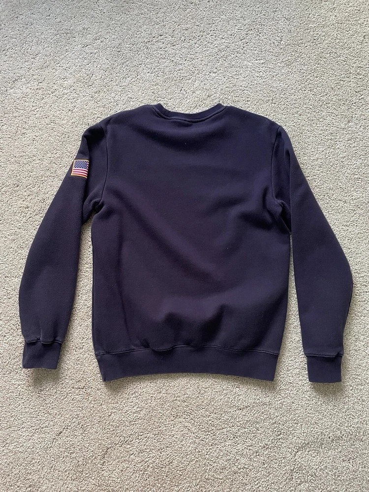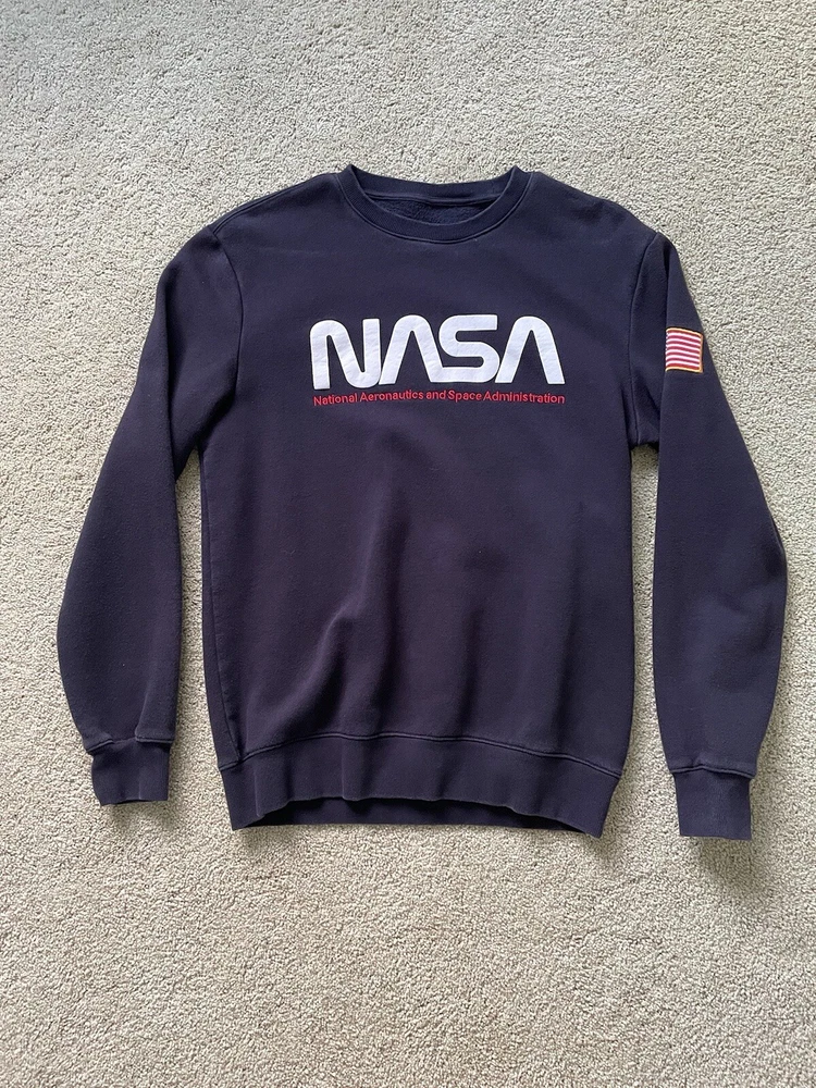 This navy blue sweatshirt with a solid pattern is perfect for any NASA enthusiast. The long sleeve crewneck sweatshirt features the NASA logo as an accent, adding a touch of style to your wardrobe. It is made by H&M and is available in a small size, perfect for men who prefer regular fit clothing. The sweatshirt is designed for casual wear and is suitable for any occasion. The color blue and the space theme make it a unique addition to your activewear collection. The sweatshirt is made in the United States and is not vintage. It is labeled as a small but it would be a comfortable medium as well