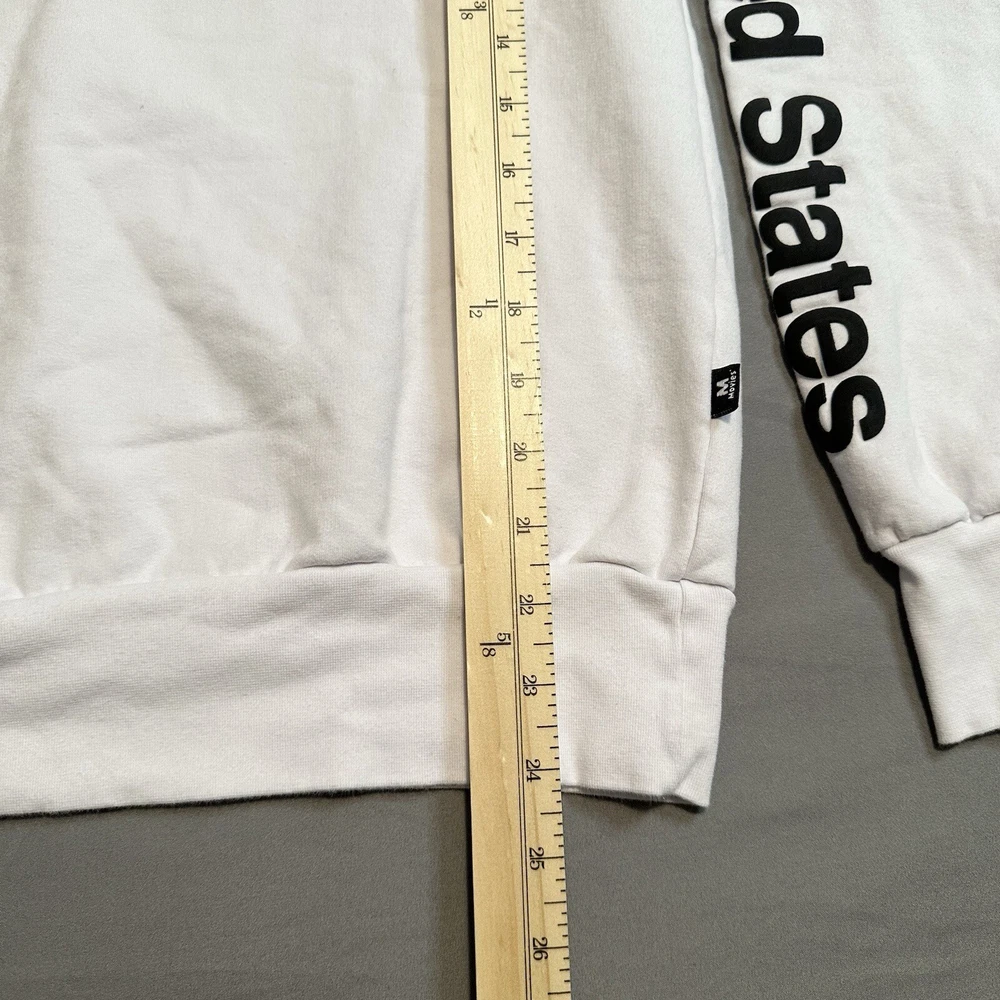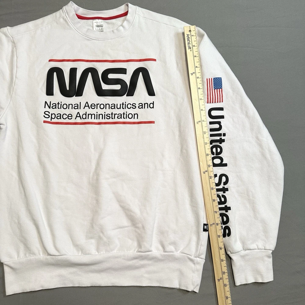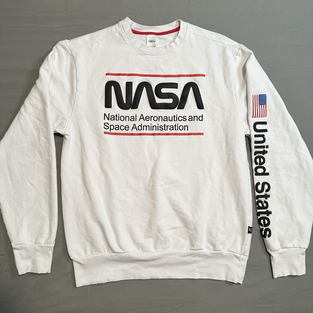Clean, stark white NASA pullover sweatshirt with United States sleeve detail. Nice slightly raised printing and super soft fleece interior. Pre-owned but barely worn. Cotton/elastic blend for easy care and comfort, classic unisex fit. Lay-Flat Dimensions Length: 24” Sleeve: 23” Shipping: All items are packed with care. I do use recycled packing and shipping materials whenever possible. If you have any issues with your purchase, please reach out as soon as possible. Clothing and accessories have a 30-day return window, returned in the same condition sent, with original tags and labels as applicable. Return shipping paid by buyer. Thank you for your business and let me know if you have any questions!