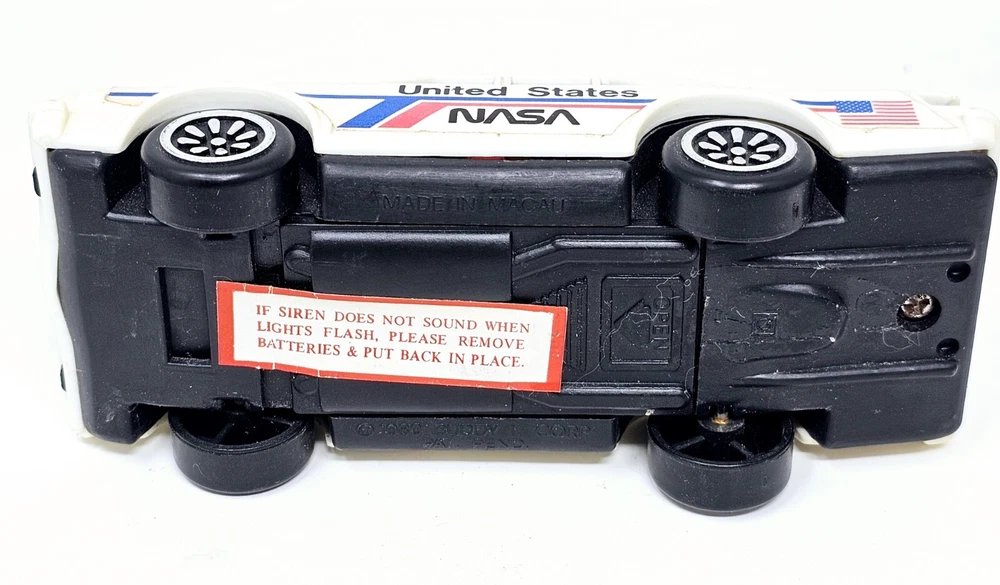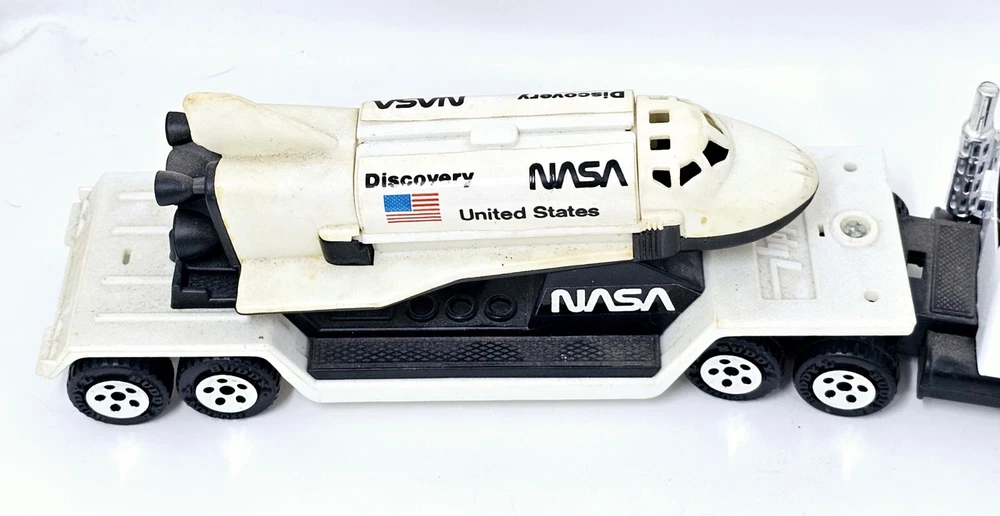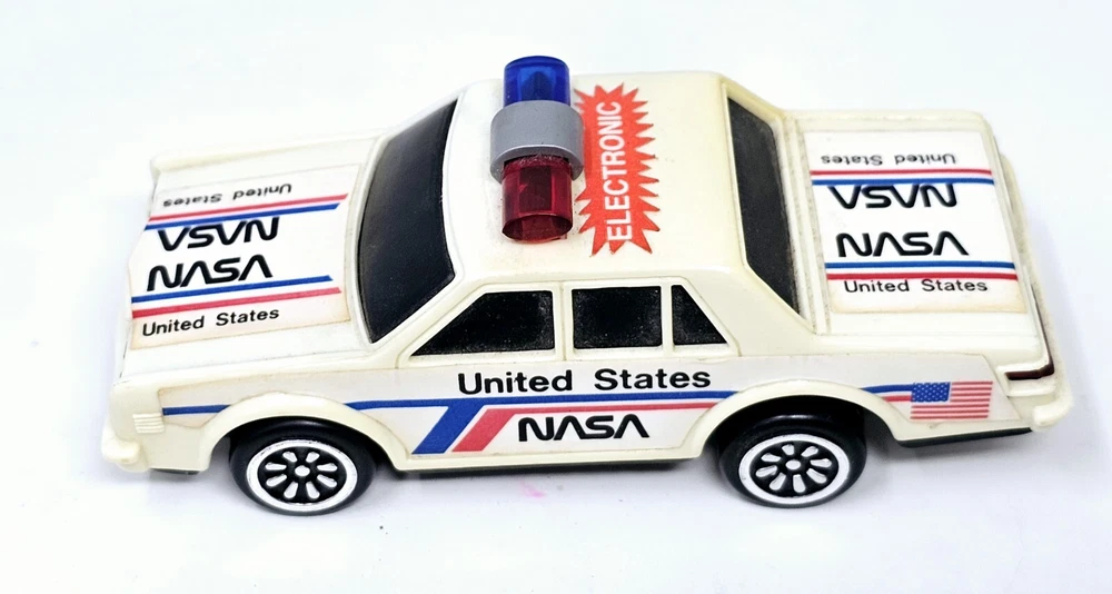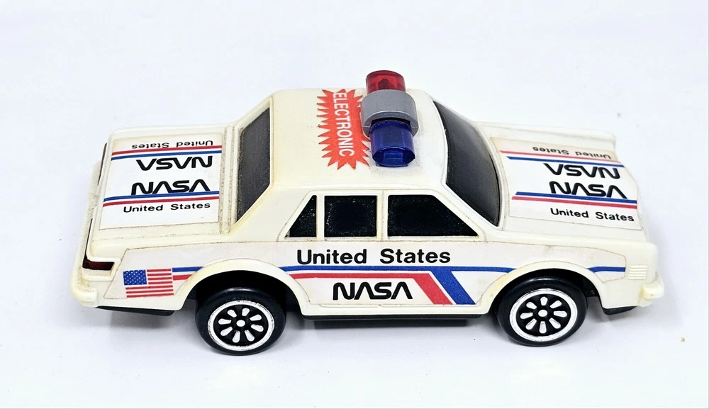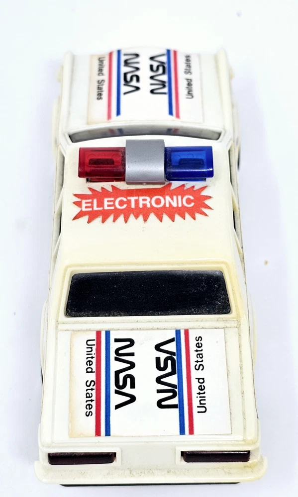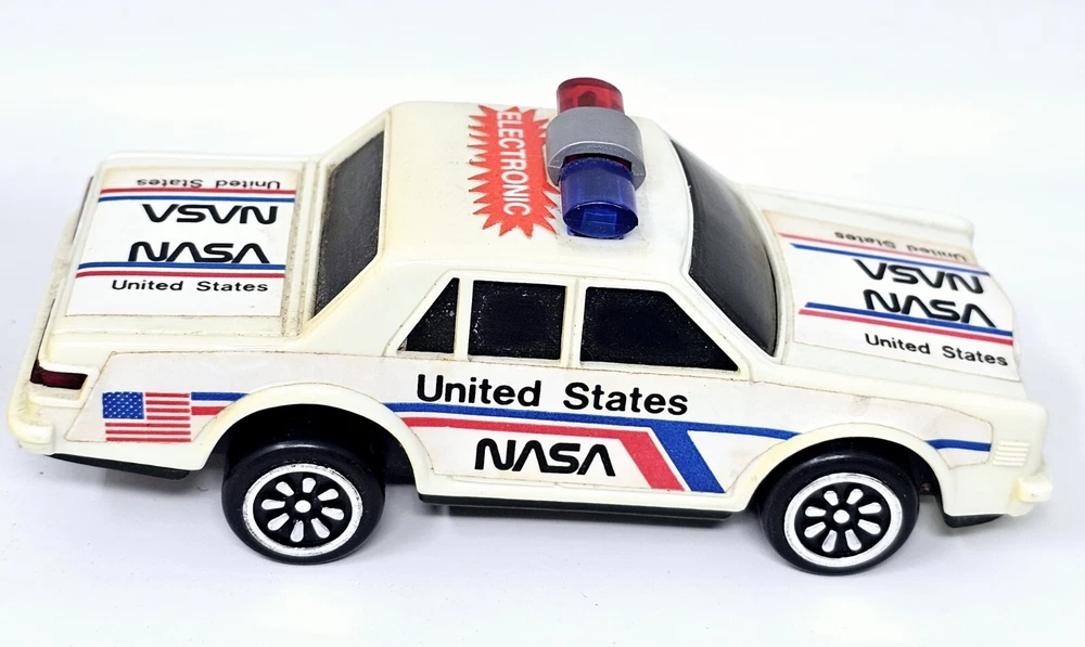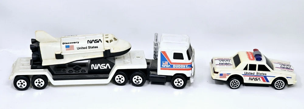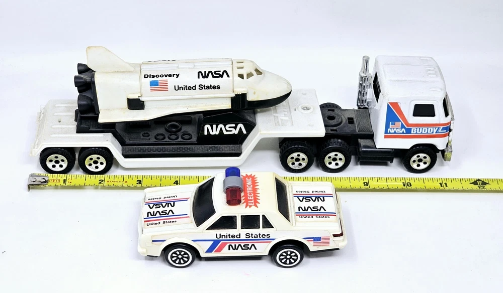 Pre-owned, all show some wear and discoloration. Please review pictures before purchasing to better understand the condition of the items. Police car does not work at the moment. Have no batteries to test. This vintage toy truck and trailer set is a must-have for any NASA or space shuttle enthusiast. The Buddy L brand space shuttle is beautifully detailed and made of high-quality pressed steel material. The white color and NASA-themed design make it a unique addition to any collection. The set includes a Tonka truck and trailer, both adorned with the iconic NASA logo. This item is perfect for collectors, children of collectors, or anyone who wants a piece of space history. Don't miss your chance to own this rare piece of vintage manufacture.