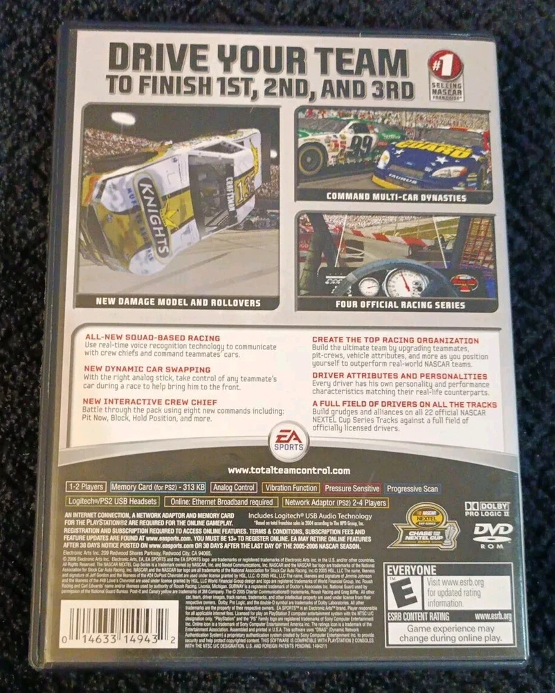 Experience the thrill of NASCAR racing with this complete edition of Nascar 06: Total Team Control for Sony PlayStation 2. This game features multiplayer mode, allowing you to compete with other players and teams. The game also includes the popular Nascar Series [Electronic Arts] and offers a rating of E-Everyone, making it suitable for all ages. The unit type is a single unit, and it was released in 2005. The game is published by EA SPORTS and falls under the racing genre. The game comes in its original box, making it a great addition to any NASCAR fan's collection.