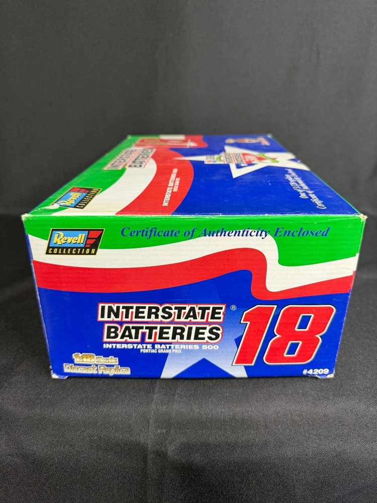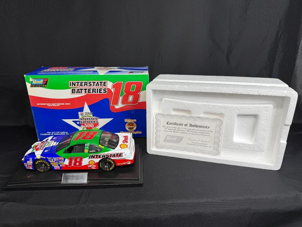 The product is a Revell 1:18 diecast model of the NASCAR #18 Interstate Batteries 1997 Pontiac Grand Prix. It is a replica of a sport & touring car from the NASCAR organization. Used - packing may show signs of wear SB