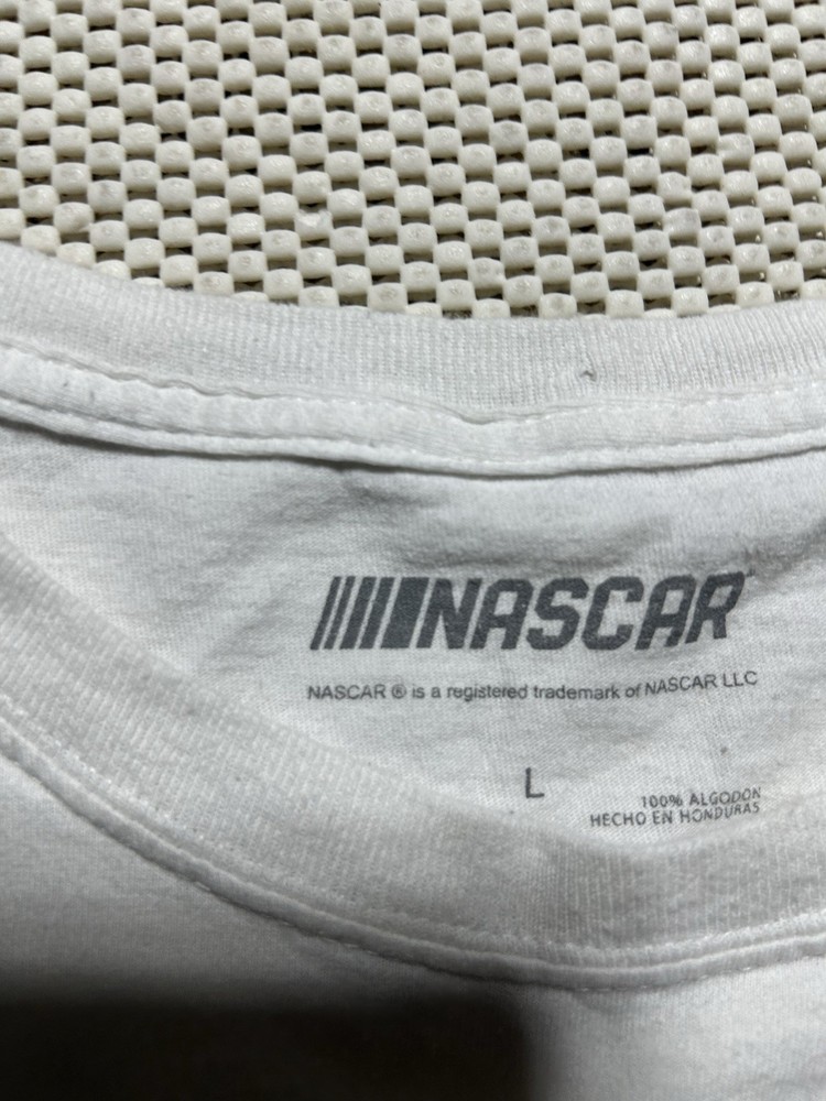 The product is a white T-shirt in size L featuring the Nascar AOP Racing World 600 logo from Charlotte Motor Speedway. This shirt is perfect for fans of auto racing and NASCAR, made from comfortable materials and designed to show support for their favorite sport and league. It is a must-have for any racing enthusiast looking to add a stylish and authentic piece to their fan apparel collection.