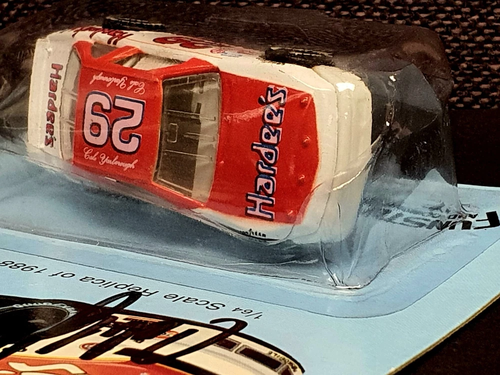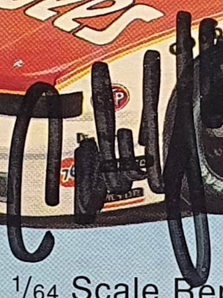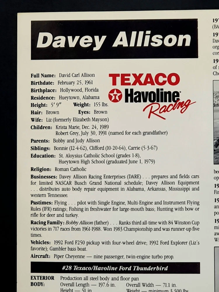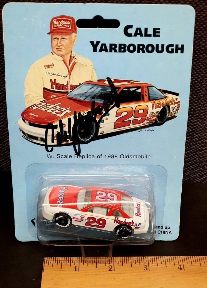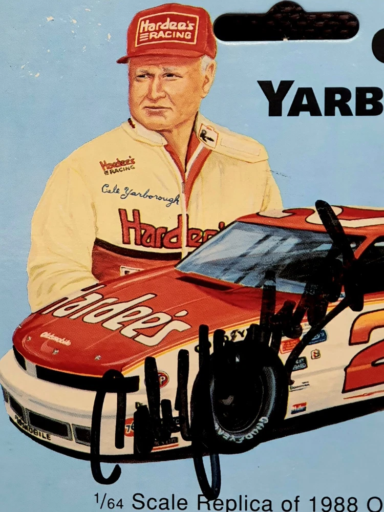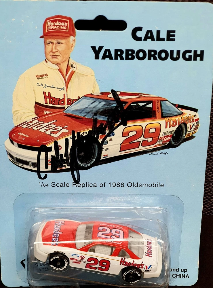 The photo of Davey is an 8.5” x 11” Driver Stat Card distributed by Texaco Havoline Racing. It is autographed by Davey Allison with a gold-paint autograph pen. It is in excellent condition with only minor signs of wear. Unframed. The model car is a 1/64 scale replica of Cale’s 1988 Oldsmobile, signed with a black Sharpie. In 1986 Yarborough purchased Jack Beebe's Race Hill Farm team, renaming the team Cale Yarborough Motorsports and running a part-time schedule in 1987 and 1988. During the 1988 season, Yarborough split time in the No. 29 car with Dale Jarrett, who took over full-time in 1989 following Yarborough's retirement. David “Davey” Carl Allison (February 25, 1961 – July 13, 1993). Born in Hollywood, Florida, he was the son of NASCAR Hall of Famer Bobby Allison and the nephew of Donnie Allison . Davey Allison’s breakthrough came in 1987 when he took over for legendary driver Cale Yarborough in Ranier-Lundy’s Ford Thunderbird. He drove the No. 28 Texaco-Havoline Ford for Robert Yates Racing and achieved significant success. Davey Allison won 19 NASCAR Winston Cup races, claimed 14 poles, and won over six million dollars before his career was cut short by a helicopter crash in 1993. William Caleb "Cale" Yarborough (March 27, 1939 – December 31, 2023) was an American NASCAR Winston Cup Series driver and owner, businessman, farmer, and rancher. He was one of only two drivers in NASCAR history to win three consecutive championships, winning in 1976, 1977, and 1978. He was one of the preeminent stock car drivers from the 1960s to the 1980s and also competed in IndyCar events. His 83 wins tie him with Jimmie Johnson for sixth on the all-time NASCAR Cup Series winner's list (behind Bobby Allison and Darrell Waltrip, who are tied for fourth with 84).