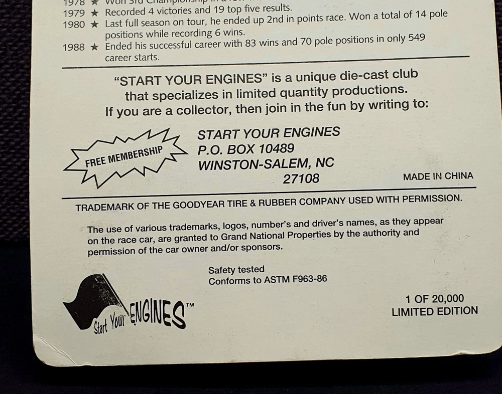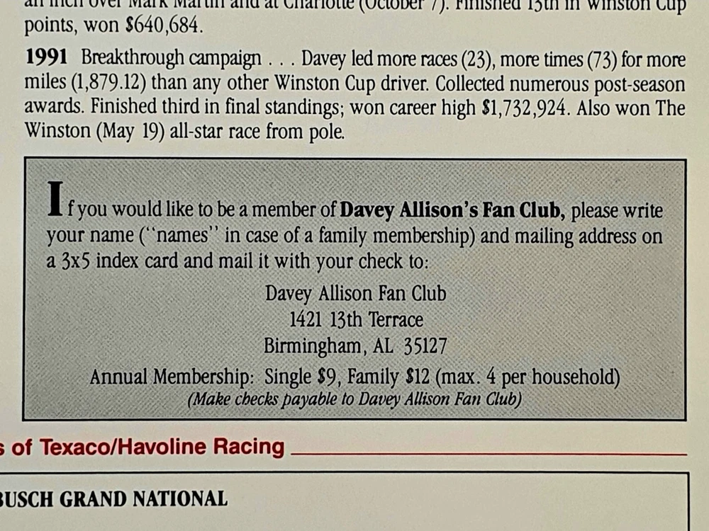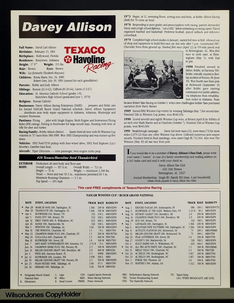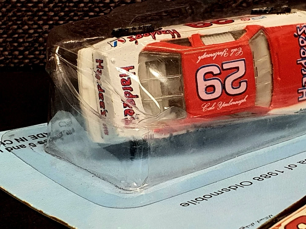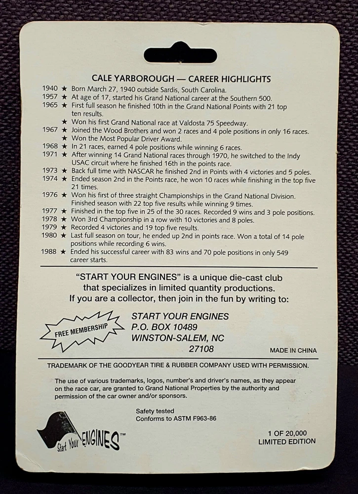 The photo of Davey is an 8.5” x 11” Driver Stat Card distributed by Texaco Havoline Racing. It is autographed by Davey Allison with a gold-paint autograph pen. It is in excellent condition with only minor signs of wear. Unframed. The model car is a 1/64 scale replica of Cale’s 1988 Oldsmobile, signed with a black Sharpie. In 1986 Yarborough purchased Jack Beebe's Race Hill Farm team, renaming the team Cale Yarborough Motorsports and running a part-time schedule in 1987 and 1988. During the 1988 season, Yarborough split time in the No. 29 car with Dale Jarrett, who took over full-time in 1989 following Yarborough's retirement. David “Davey” Carl Allison (February 25, 1961 – July 13, 1993). Born in Hollywood, Florida, he was the son of NASCAR Hall of Famer Bobby Allison and the nephew of Donnie Allison . Davey Allison’s breakthrough came in 1987 when he took over for legendary driver Cale Yarborough in Ranier-Lundy’s Ford Thunderbird. He drove the No. 28 Texaco-Havoline Ford for Robert Yates Racing and achieved significant success. Davey Allison won 19 NASCAR Winston Cup races, claimed 14 poles, and won over six million dollars before his career was cut short by a helicopter crash in 1993. William Caleb "Cale" Yarborough (March 27, 1939 – December 31, 2023) was an American NASCAR Winston Cup Series driver and owner, businessman, farmer, and rancher. He was one of only two drivers in NASCAR history to win three consecutive championships, winning in 1976, 1977, and 1978. He was one of the preeminent stock car drivers from the 1960s to the 1980s and also competed in IndyCar events. His 83 wins tie him with Jimmie Johnson for sixth on the all-time NASCAR Cup Series winner's list (behind Bobby Allison and Darrell Waltrip, who are tied for fourth with 84).