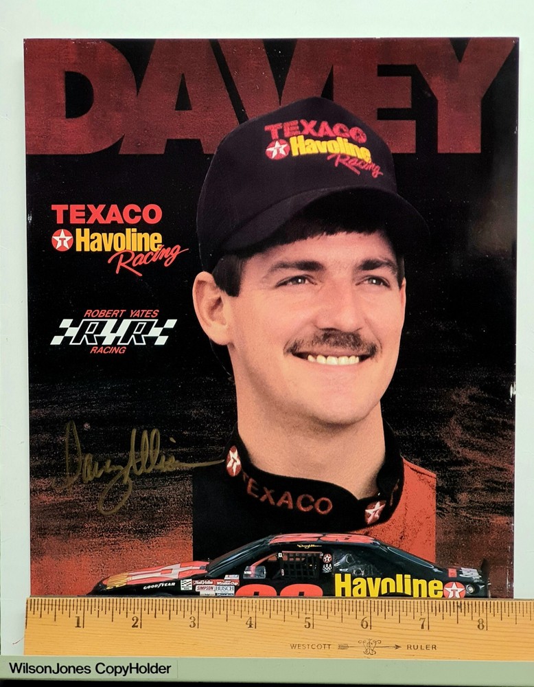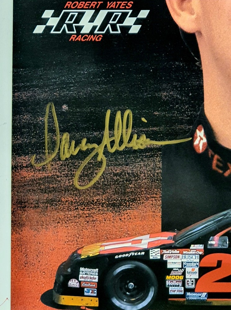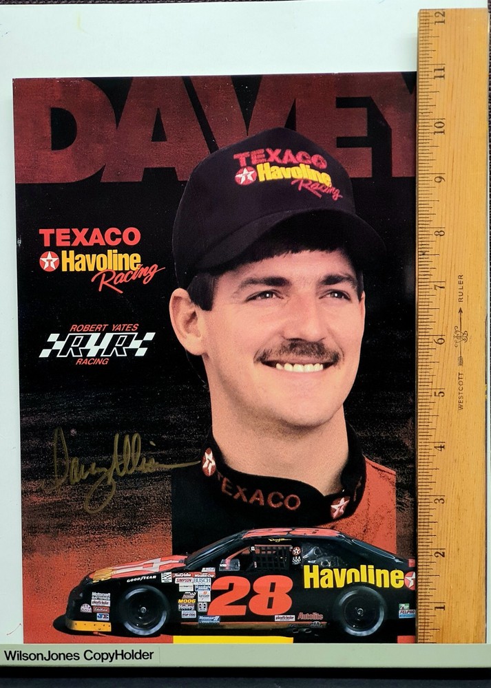 The photo of Davey is an 8.5” x 11” Driver Stat Card distributed by Texaco Havoline Racing. It is autographed by Davey Allison with a gold-paint autograph pen. It is in excellent condition with only minor signs of wear. Unframed. The model car is a 1/64 scale replica of Cale’s 1988 Oldsmobile, signed with a black Sharpie. In 1986 Yarborough purchased Jack Beebe's Race Hill Farm team, renaming the team Cale Yarborough Motorsports and running a part-time schedule in 1987 and 1988. During the 1988 season, Yarborough split time in the No. 29 car with Dale Jarrett, who took over full-time in 1989 following Yarborough's retirement. David “Davey” Carl Allison (February 25, 1961 – July 13, 1993). Born in Hollywood, Florida, he was the son of NASCAR Hall of Famer Bobby Allison and the nephew of Donnie Allison . Davey Allison’s breakthrough came in 1987 when he took over for legendary driver Cale Yarborough in Ranier-Lundy’s Ford Thunderbird. He drove the No. 28 Texaco-Havoline Ford for Robert Yates Racing and achieved significant success. Davey Allison won 19 NASCAR Winston Cup races, claimed 14 poles, and won over six million dollars before his career was cut short by a helicopter crash in 1993. William Caleb "Cale" Yarborough (March 27, 1939 – December 31, 2023) was an American NASCAR Winston Cup Series driver and owner, businessman, farmer, and rancher. He was one of only two drivers in NASCAR history to win three consecutive championships, winning in 1976, 1977, and 1978. He was one of the preeminent stock car drivers from the 1960s to the 1980s and also competed in IndyCar events. His 83 wins tie him with Jimmie Johnson for sixth on the all-time NASCAR Cup Series winner's list (behind Bobby Allison and Darrell Waltrip, who are tied for fourth with 84).