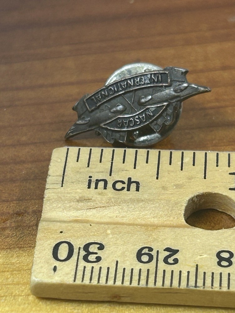 The product is a NASCAR International logo pewter style hat pin, perfect for fans of auto racing and NASCAR. This souvenir item showcases the iconic NASCAR logo in a unique pewter design, making it a perfect accessory for showing support for the sport and league. Whether worn on a hat or displayed as a collectible, this pin is a must-have for any NASCAR enthusiast.
